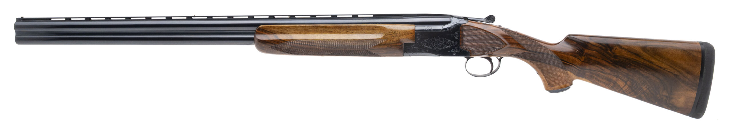 SN: 64125 made in Japan in 1964. 12 gauge over under with 28” vent rib barrels with 2 ¾” chambers and fixed chokes Modified & Full. Custom hand made stock and forearm made of highly figured walnut, hand checkered with a pistol grip cap, RH palm swell and 13.5” LOP to the Decelerator recoil pad. Metal has been professionally refinished likely at the time it was stocked. Overall in very good condition with excellent bores.