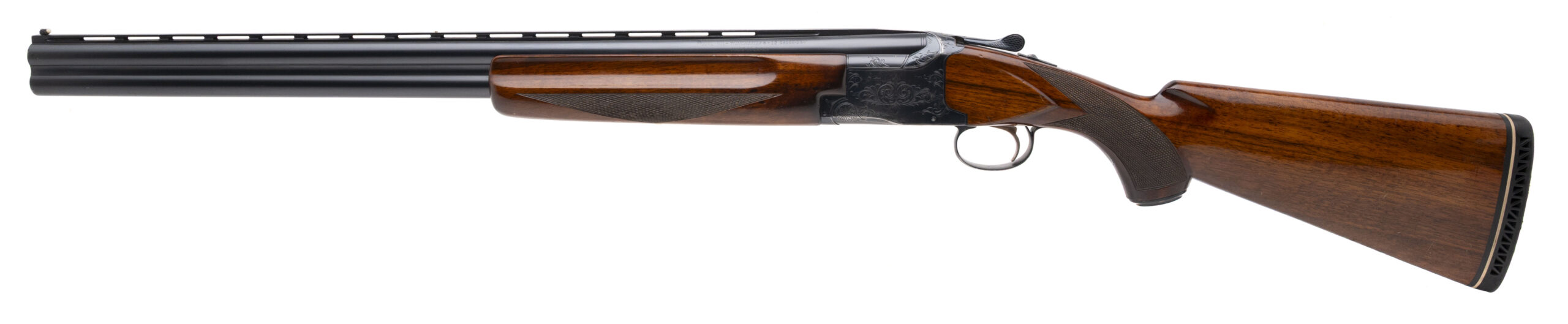 SN: K141502 made in Japan circa 1970’s. 12 gauge over under shotgun with 26” vent rib barrels, 2 ¾” barrels and fixed chokes MOD/FULL. Blued barrels with jewelled barrel flats, engraved blued receiver with a single selective trigger, ejectors and a manual safety. High gloss checkered walnut furniture with a 14” LOP to the Pachmayr recoil pad. Moderate handling marks and wear but overall in good solid condition with excellent bores.