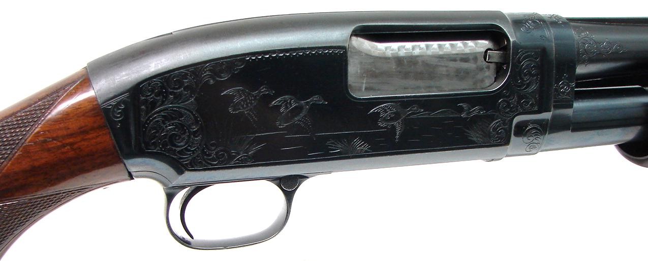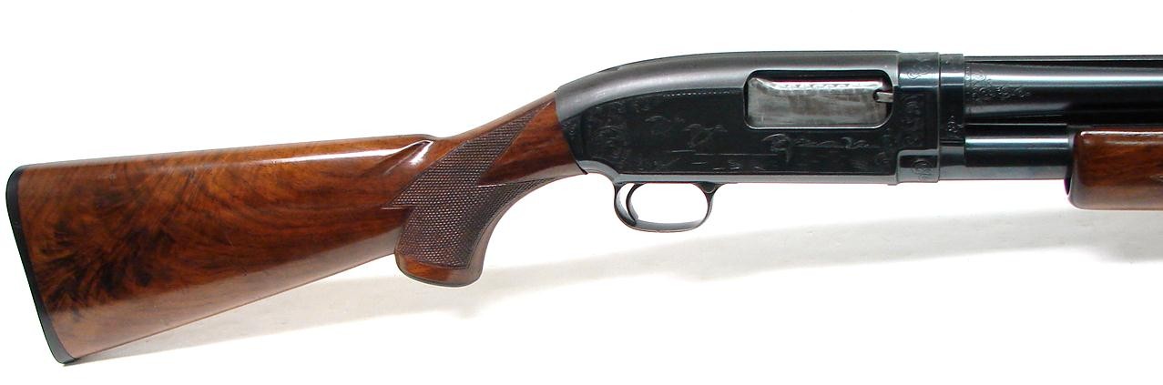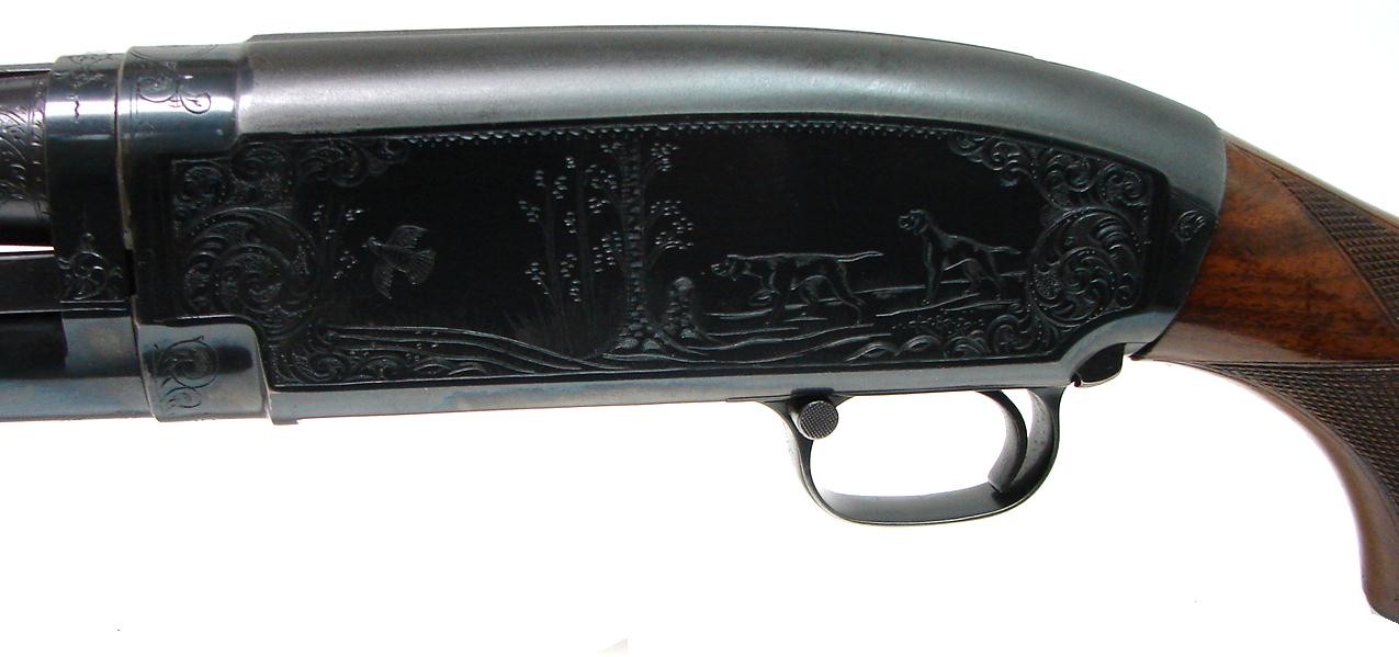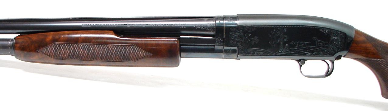 Winchester 12 28 gauge shotgun. Factory engraved Winchester Model 12 two barrel set in 28 gauge. Extremely fine gun! Made in 1950. Gun is in very fine condition with 97-98% original blue on both barrels and the receiver. Both barrels are 27 3/4" long and one is full, the other is modified. 28 gauge guns are rare by themselves, but you never see a factory engraved one with two barrels. Great set and worthy of a top collection!