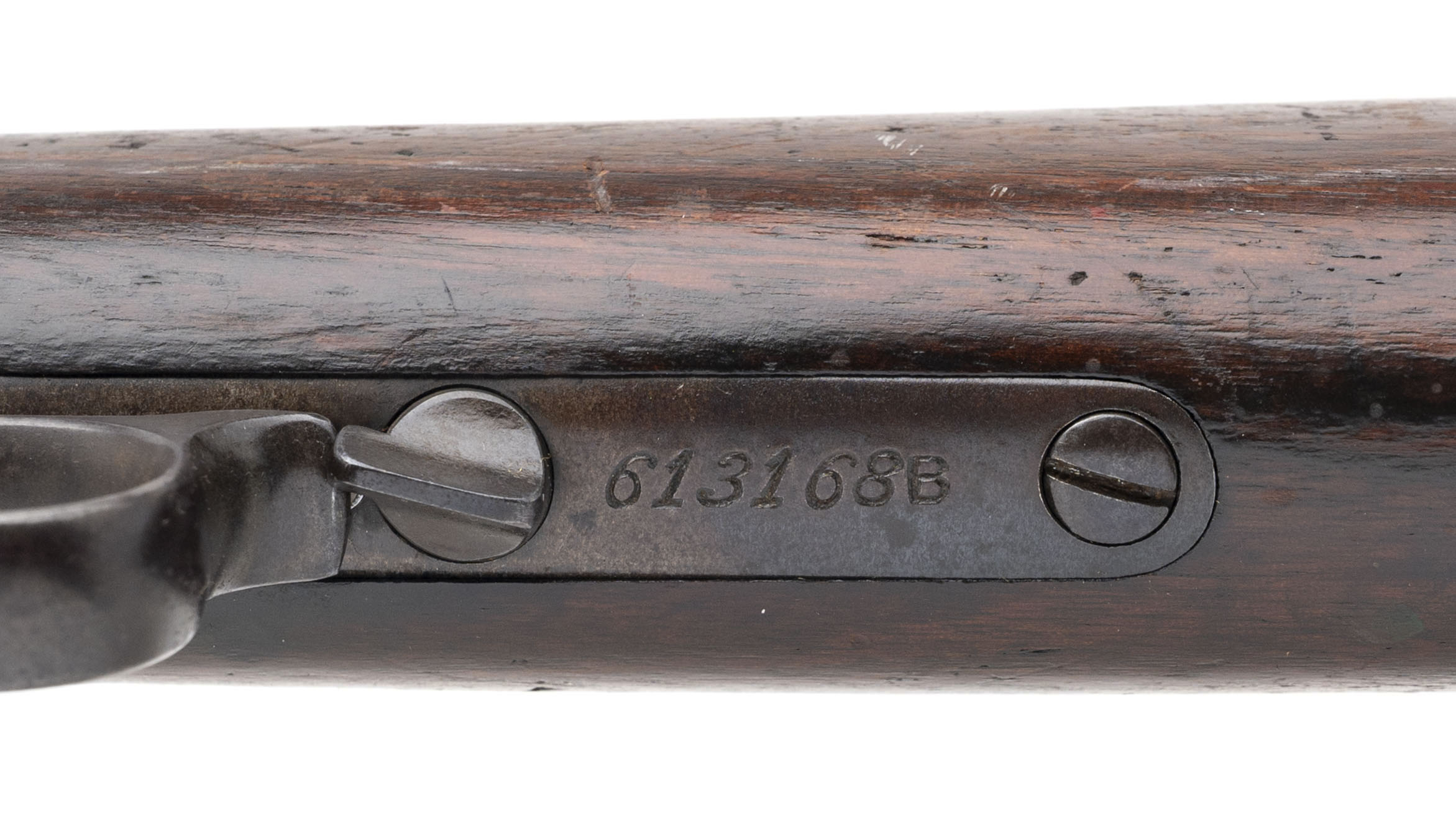 Serial number 613168B. Made in 1908. 32-20 caliber with a 24.25” barrel. This gun is in very fine condition with 80% of the original blue on the barrel while the frame has 40% of the original blue. The wood is very good with normal handling wear. The action works perfect and the bore is excellent with strong rifling and a bright and shiny bore.