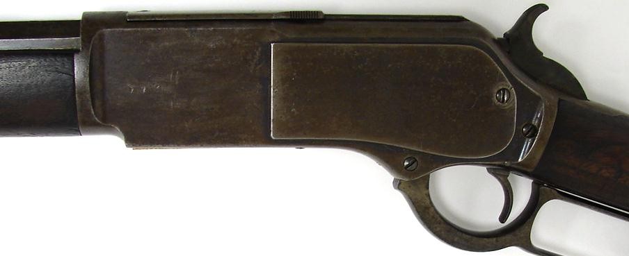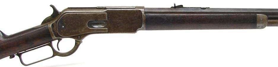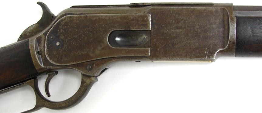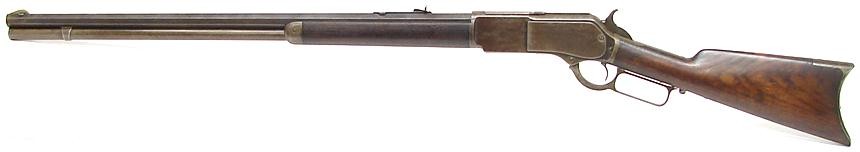 Winchester 1876 .45-60 caliber rifle. Nice sharp good looking gun with about 30% blue mixed with brown on barrel and brown patina with traces of blue on receiver. Wood is fine with no major flaws. All markings are sharp. Manufactured in 1882.