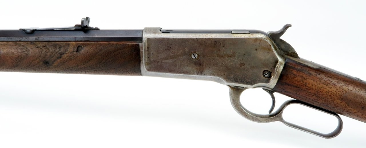Winchester 1886 .40-82 WCF caliber rifle. Made in 1899. Very nice gun with 90% of the blue on the barrel. Traces of case colors remain on the frame, but the frame has turned mostly to a grayish, silvery patina. Wood is excellent and proud to the metal. Action is tight and bore is excellent.