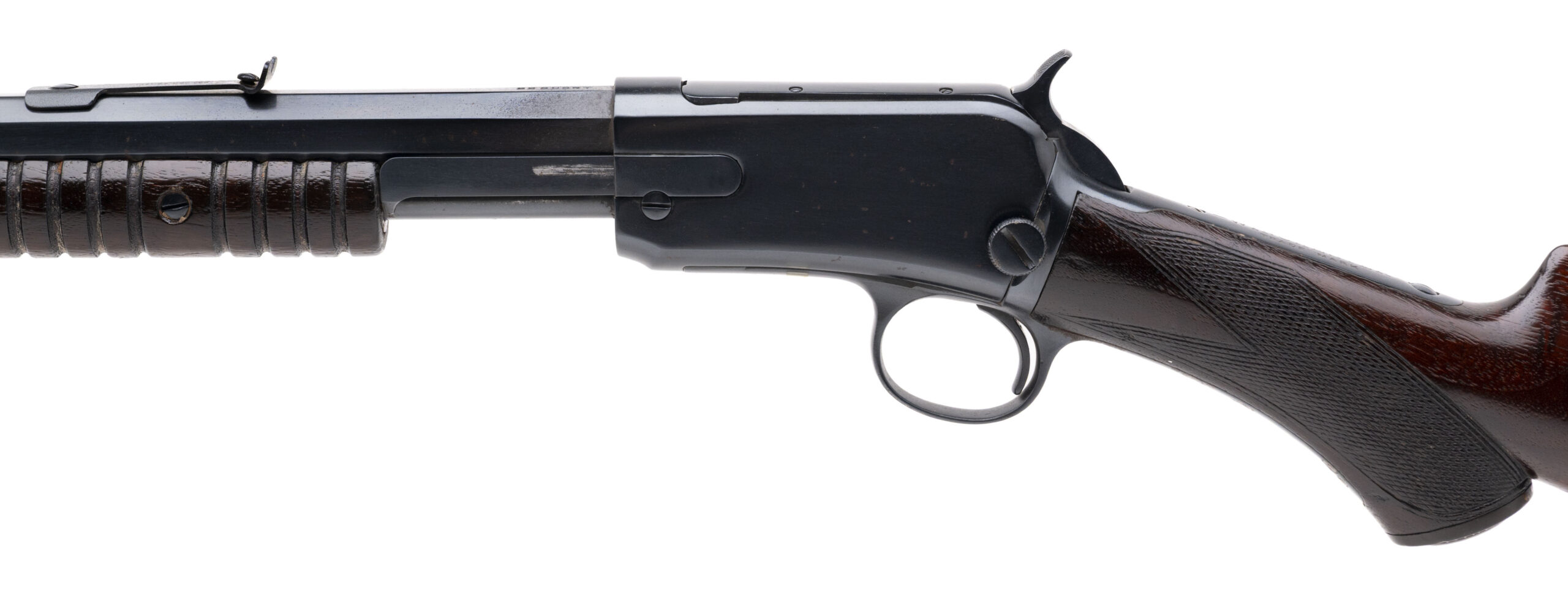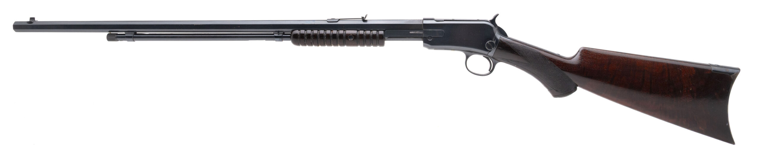 SN: 218179 made in 1904. Pump action takedown rifle chambered in 22 short with a 24” octagon barrel, exposed hammer and nicely figured deluxe checkered walnut stock with original Winchester grip cap and curved steel butt plate. Gun has been re-finished and is in very good overall condition with some light handling marks.