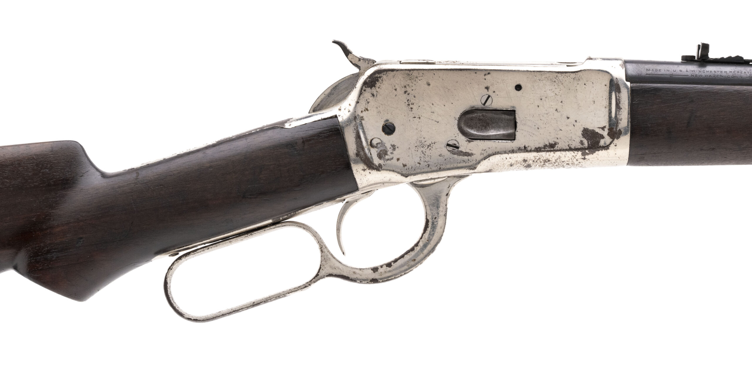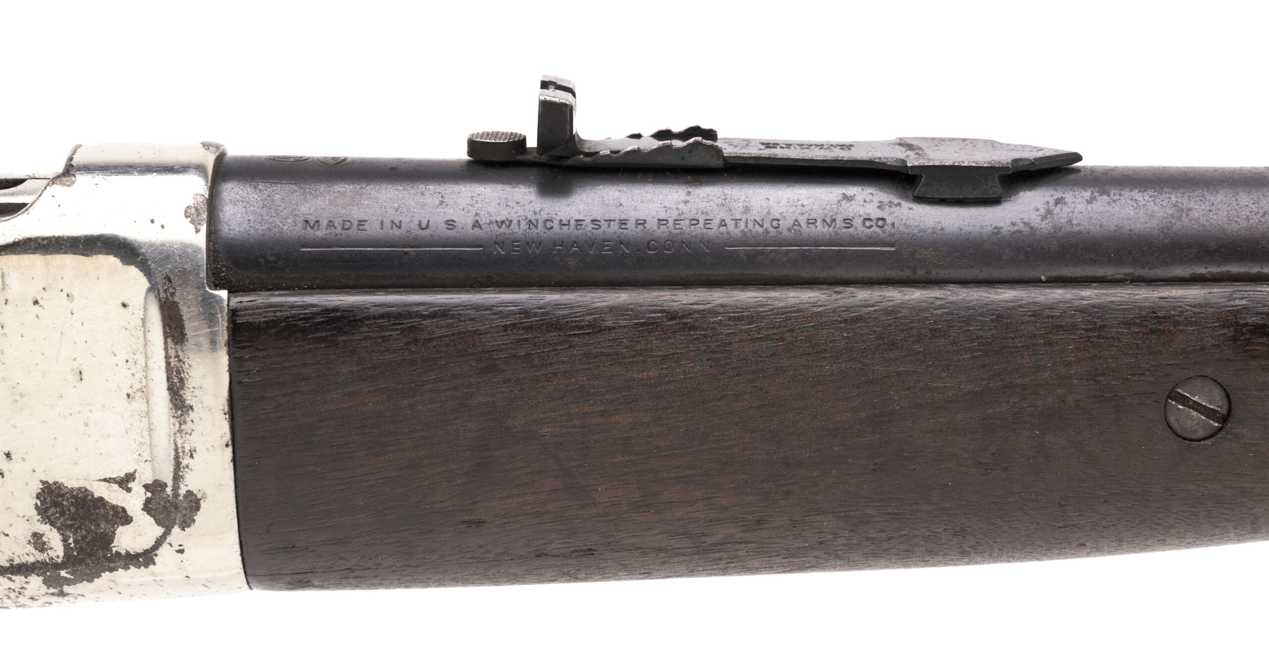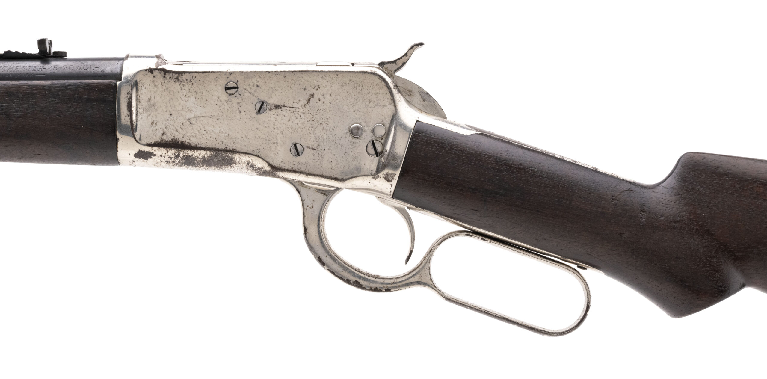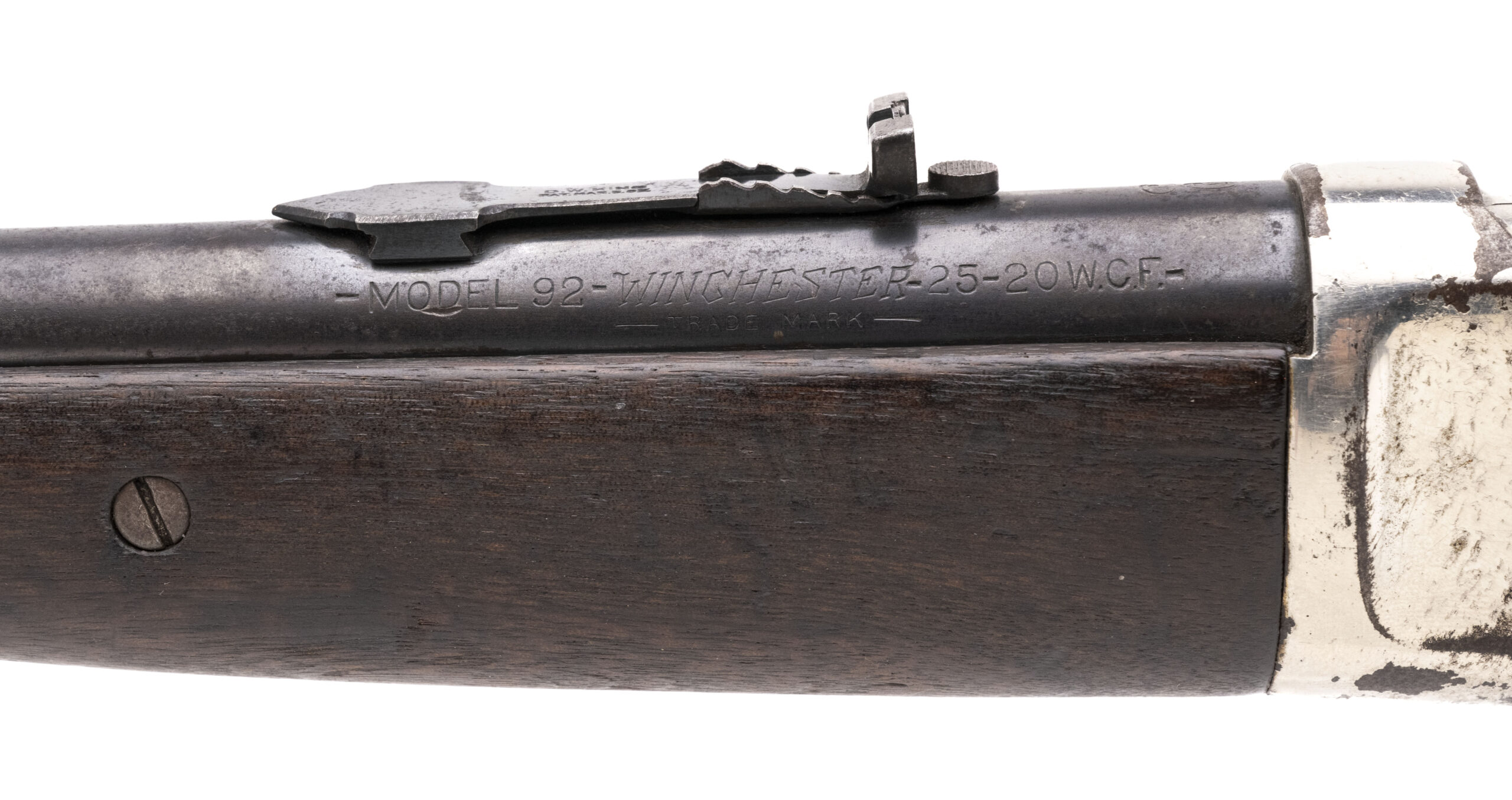 Serial number 670634. Made in 1912. 25-20 caliber with a 20” barrel. This gun is highly modified with a replacement pistol grip stock. The barrel has approximately 30% of the original thinning blue. The frame has been refinished. The saddle ring was removed from the frame. Unusual customized Winchester 1892!
