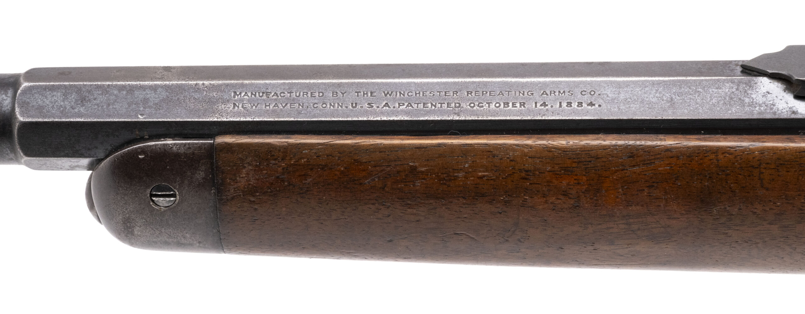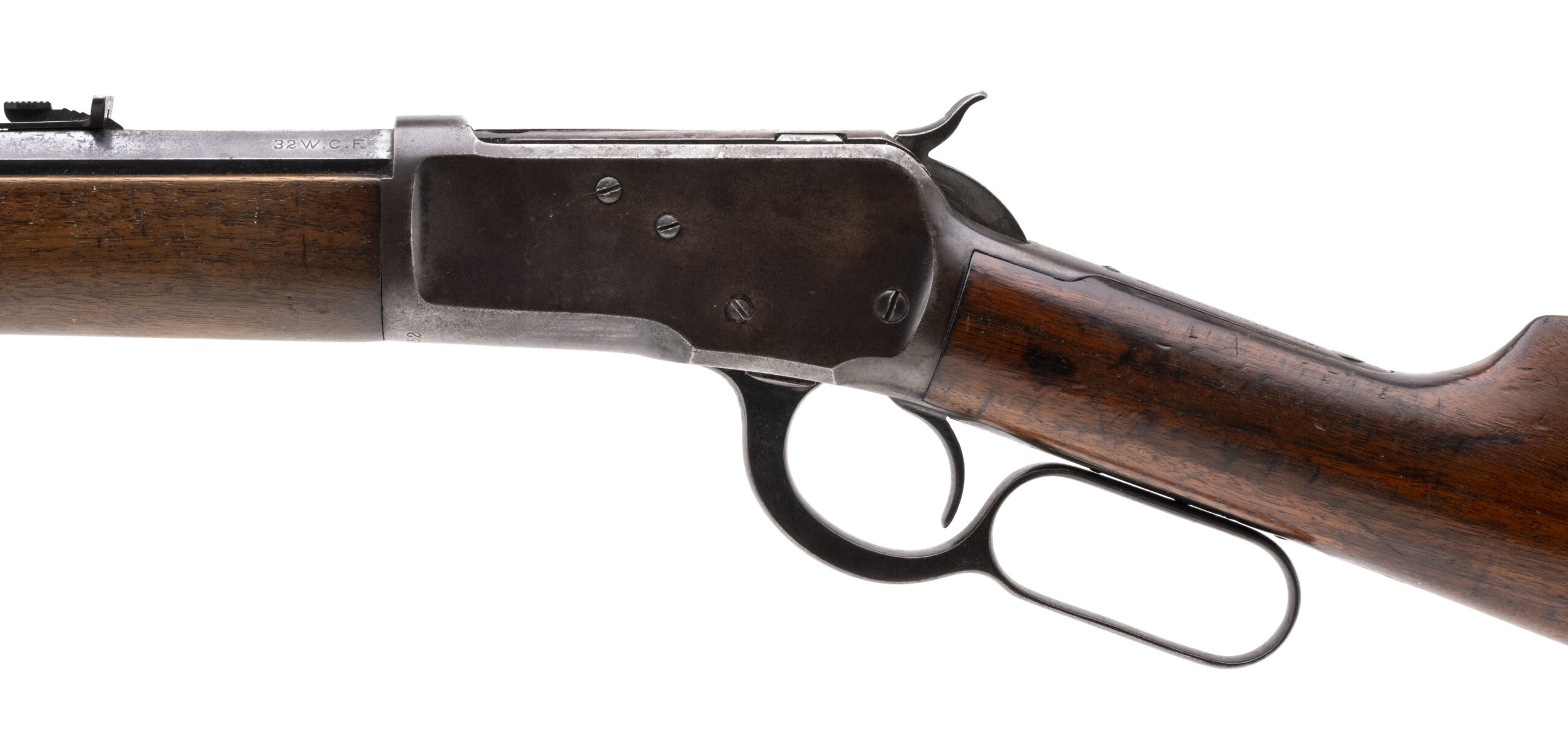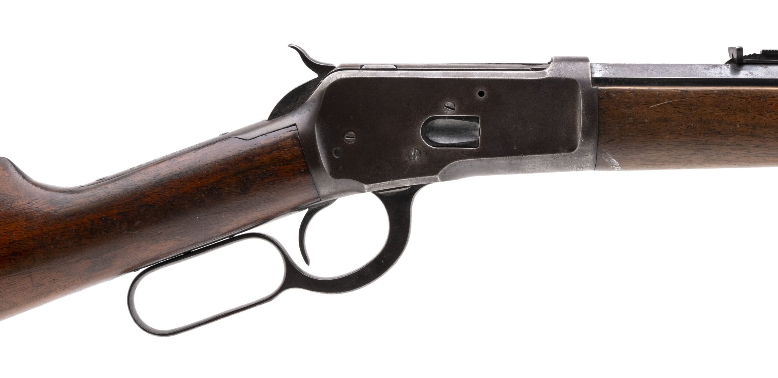 Serial number 805452. Made in 1916. 32-20 caliber with a 24” barrel. This gun has a mostly blue gray patina with some original blue in protective areas. The wood is very good. This is a special order gun with a half magazine.