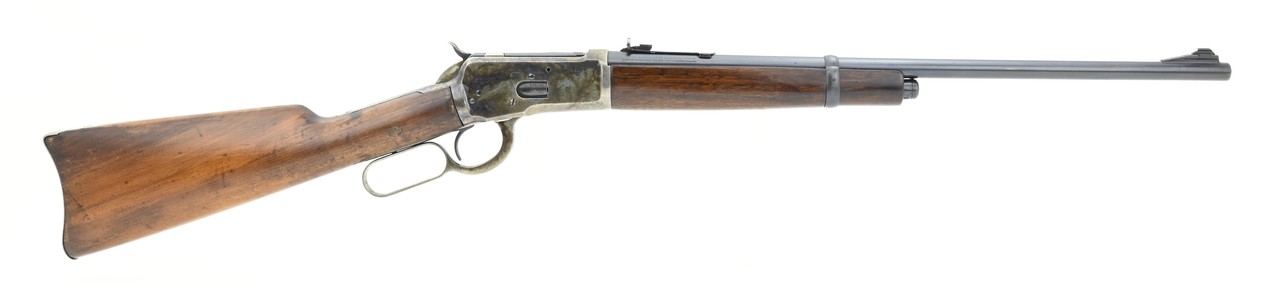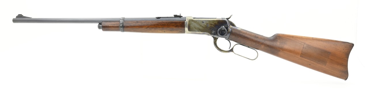 Winchester 1892 Saddle Ring .38 WCF caliber carbine. Manufactured in 1903. Bore is perfect and mirror bright. This is a half magazine saddle ring carbine. Barrel length 20” in .38-40 caliber. This carbine has been expertly case colored on the receiver, lever, hammer and butt plate. Action works smoothly. The stocks have very good varnish. In our opinion the forend is original while the butt stock is what is referred to as gum wood, which is a factory type wood that Winchester used in guns later than 1903. So, this is factory wood replacing the original Walnut (as the forend is original walnut). The butt stock has a rectangular wood inlay probably to replace a presentation plaque? This is a neat Model 1892 with 90% of the original blue. You can enjoy it as it is or get a replacement walnut stock. Either way, a fine Model 1892 in a Special Order configuration with the 20” barrel, half magazine and saddle rings.