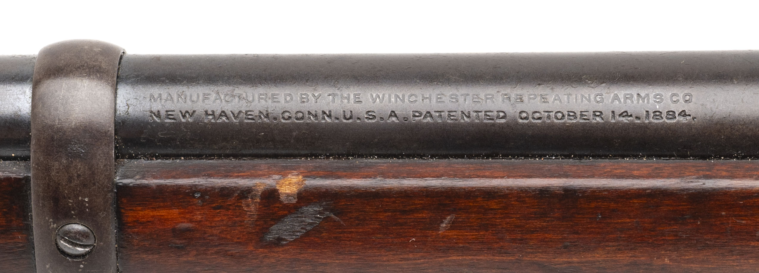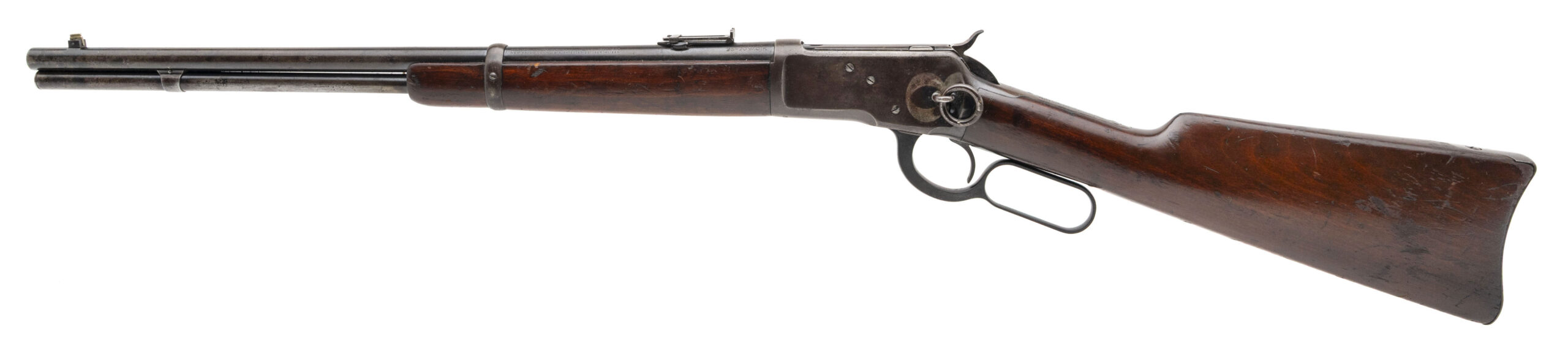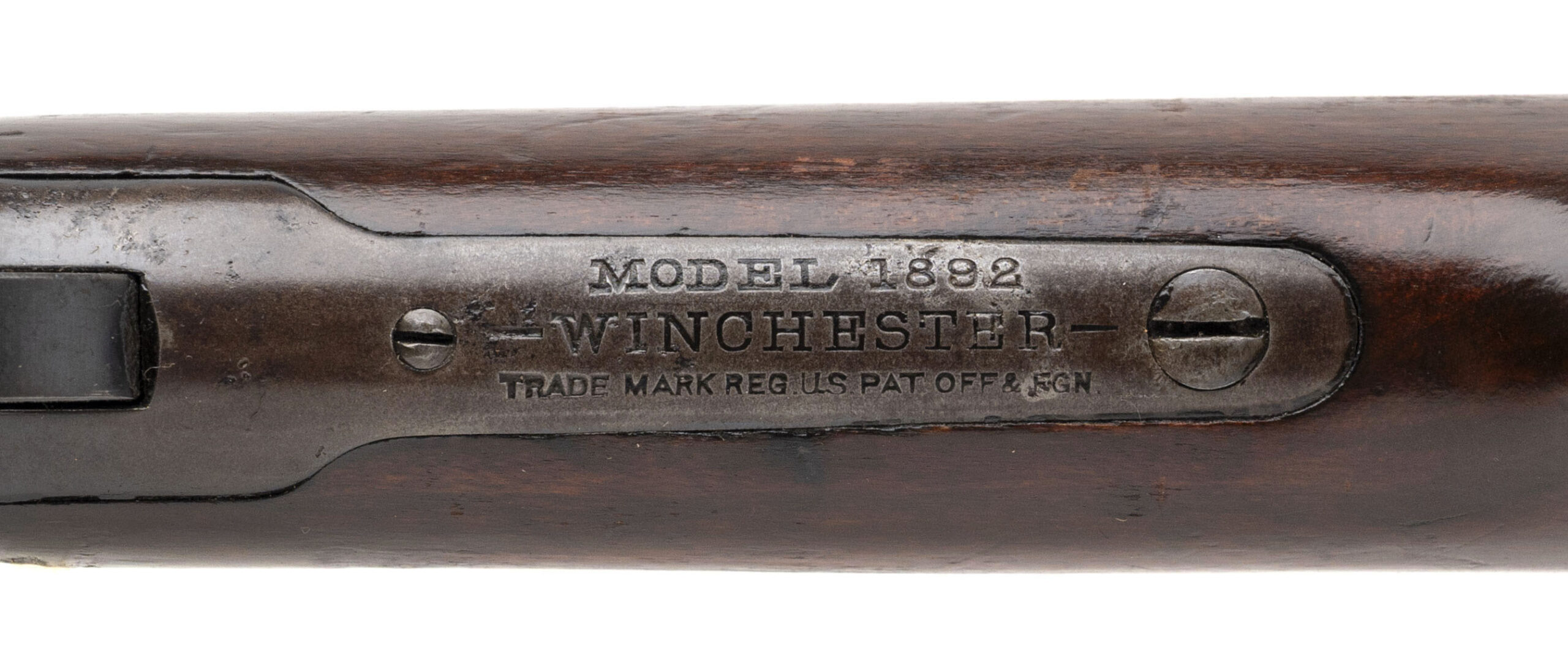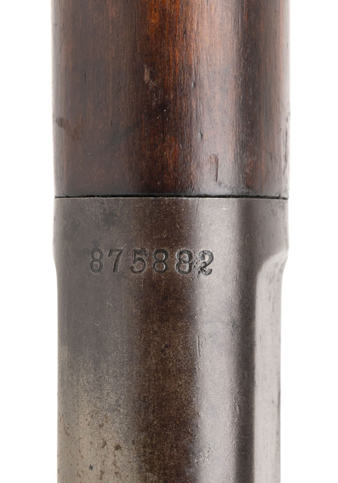 Serial number 875882. Made in 1919. 25-20 WCF caliber with a 20” barrel. This gun has approximately 35% of the original blue mixed with a grayish blue patina. The frame has a blue to brown patina. The wood is very good. The action is tight and the bore has strong rifling with some pitting.