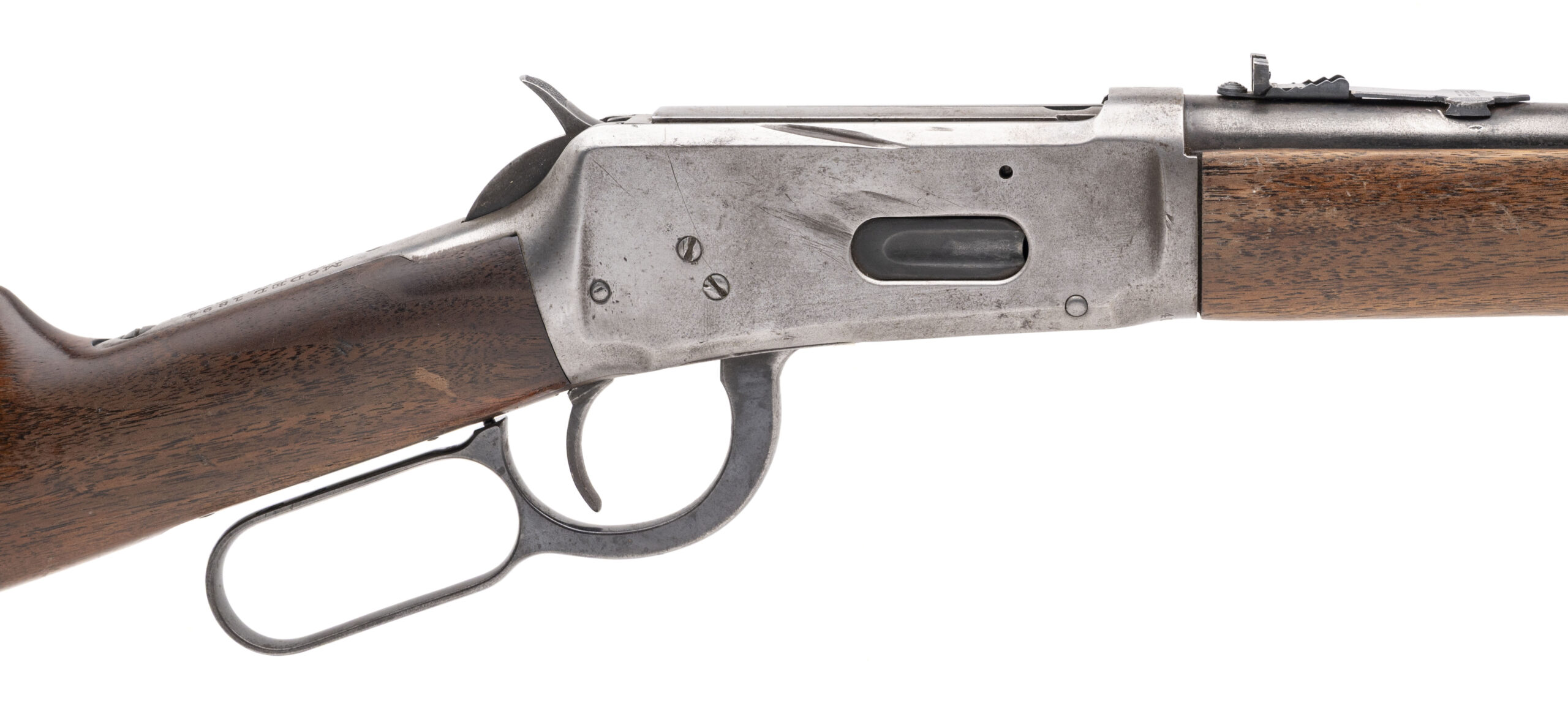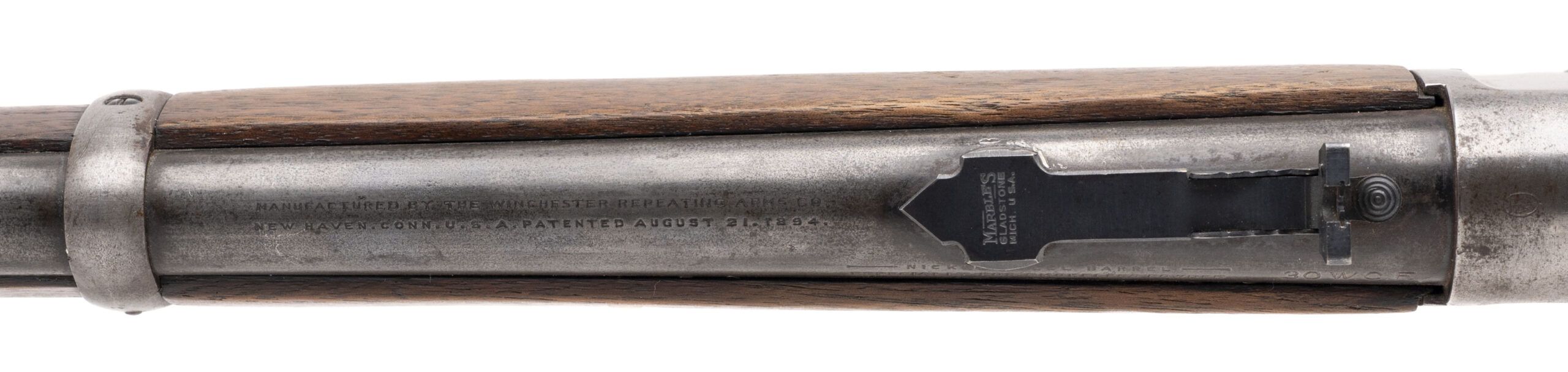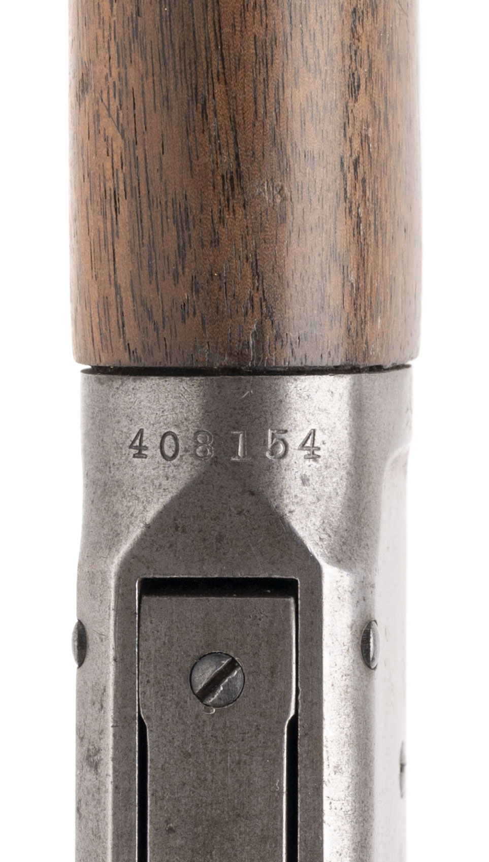 Serial number 408154. Made in 1907. 30-30 caliber with a 20” barrel. This gun has a mostly gray patina. All markings are sharp and legible. Wood shows normal handling wear. This gun has a shotgun butt.