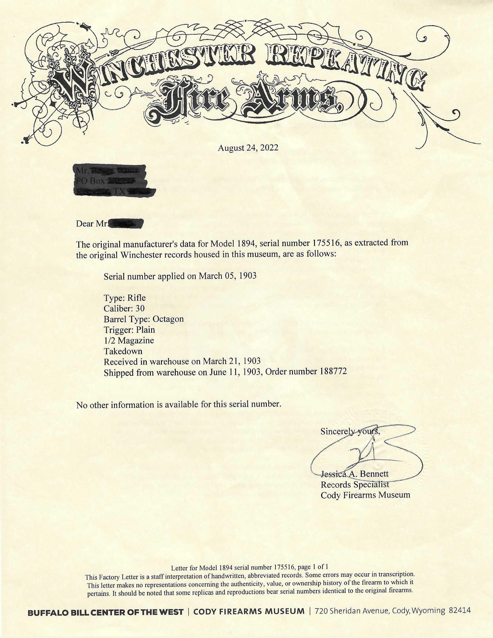 Serial number 175516. Made in 1899. 30-30 caliber with a 24” barrel. The barrel of this gun is off or a Winchester model 55The barrel has most of the original blue. The frames is mostly a smooth brown patina. The butt stock has been refinished.