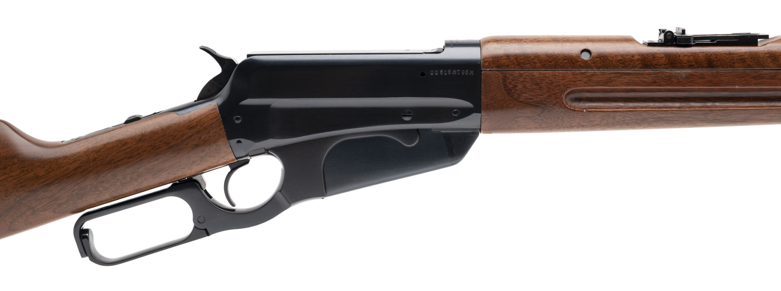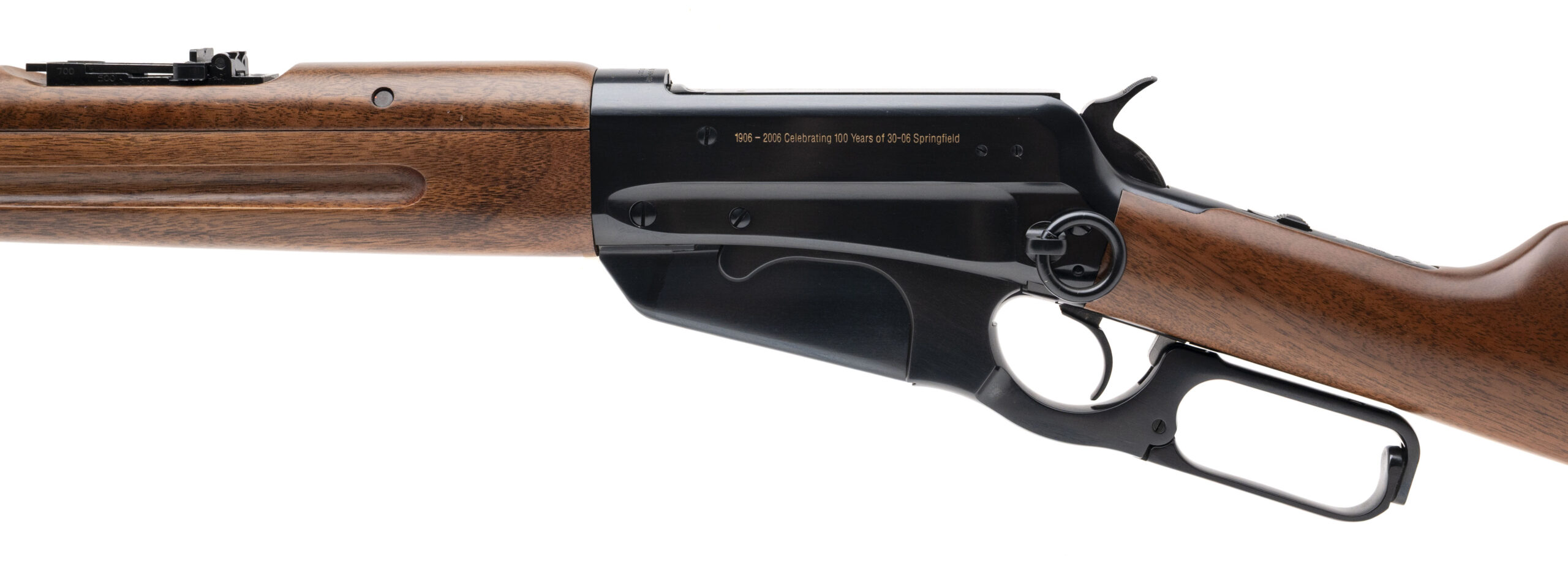 SN: 00515MT95M. Modern production, .30-06 SPRG. with a 22" barrel. Bore is excellent. Commemorative .30-06 SPRG. 100th anniversary lever-action rifle with bladed front sight, adjustable ladder rear sight, blued finish, wood stock. Finish & stock show minor handling marks. Overall condition is very good.