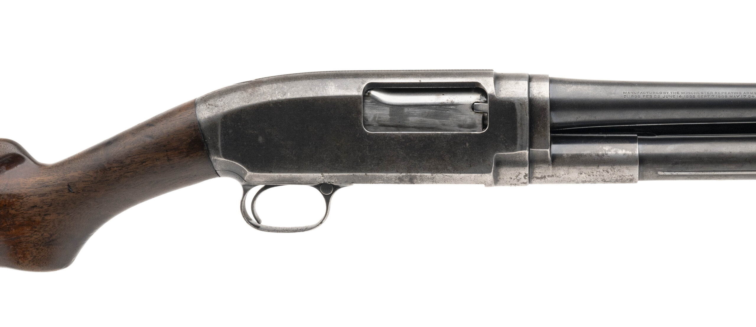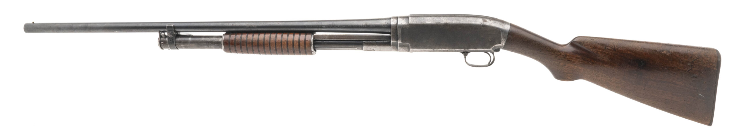SN: 237698. 1920 year of production. Pump-action shotgun chambered in 20 Gauge with a 25" barrel with a full choke. Most of the barrels bluing is remaining. The receiver has very little of its original finish remaining with of wear or pitting throughout. The wood has handling marks throughout. Take-down and action is functional.