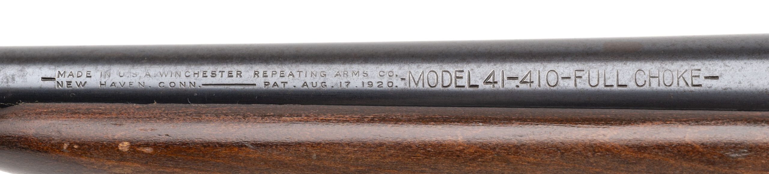 Non-serialized 1930s production, .410 gauge with a 24" full choke barrel. Bore is excellent. Bolt action shotgun with a wood stock w/original Winchester butt-plate. Finish is aging to an even brown patina but the overall condition is very good. (CONSIGNMENT)