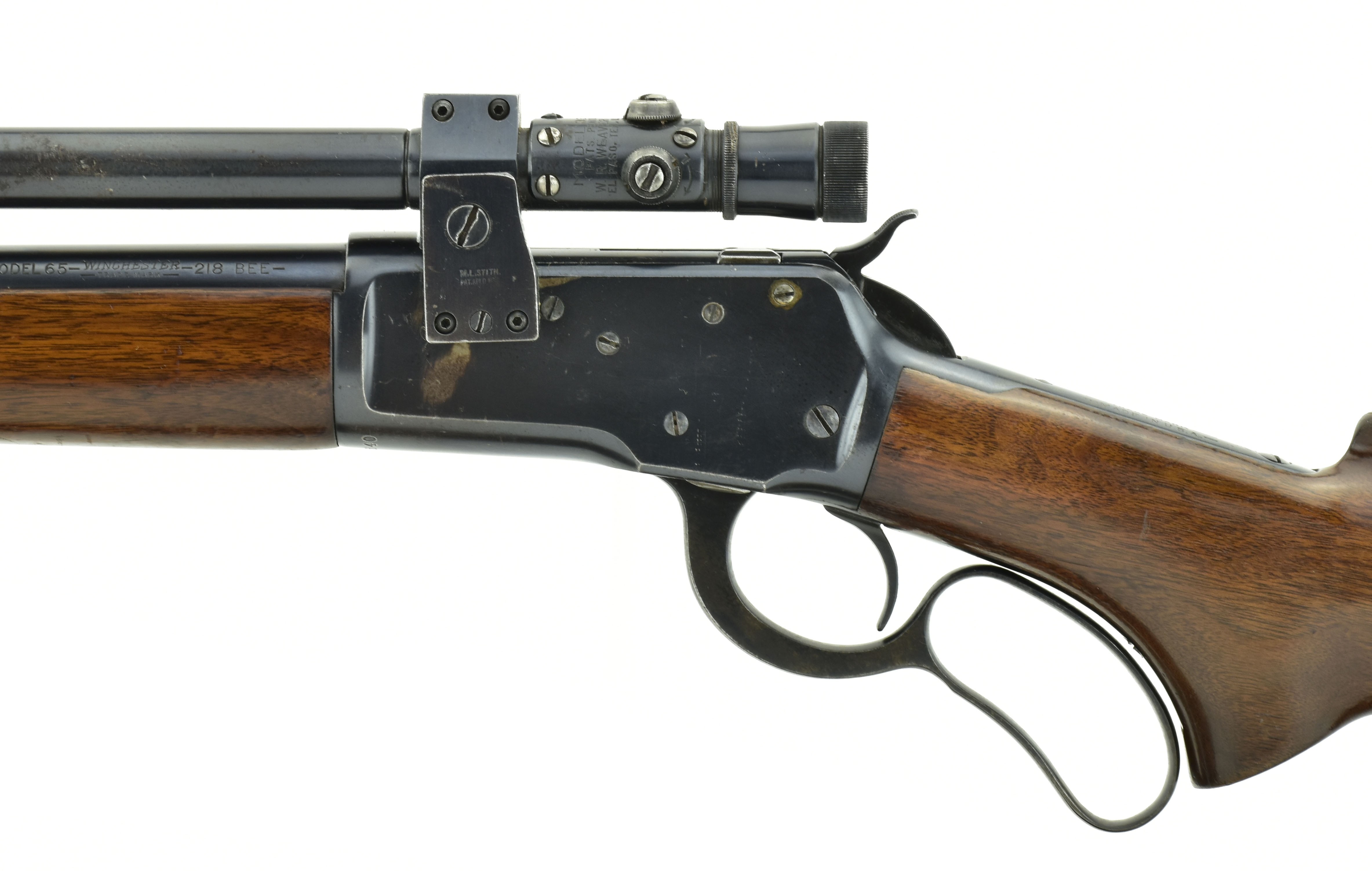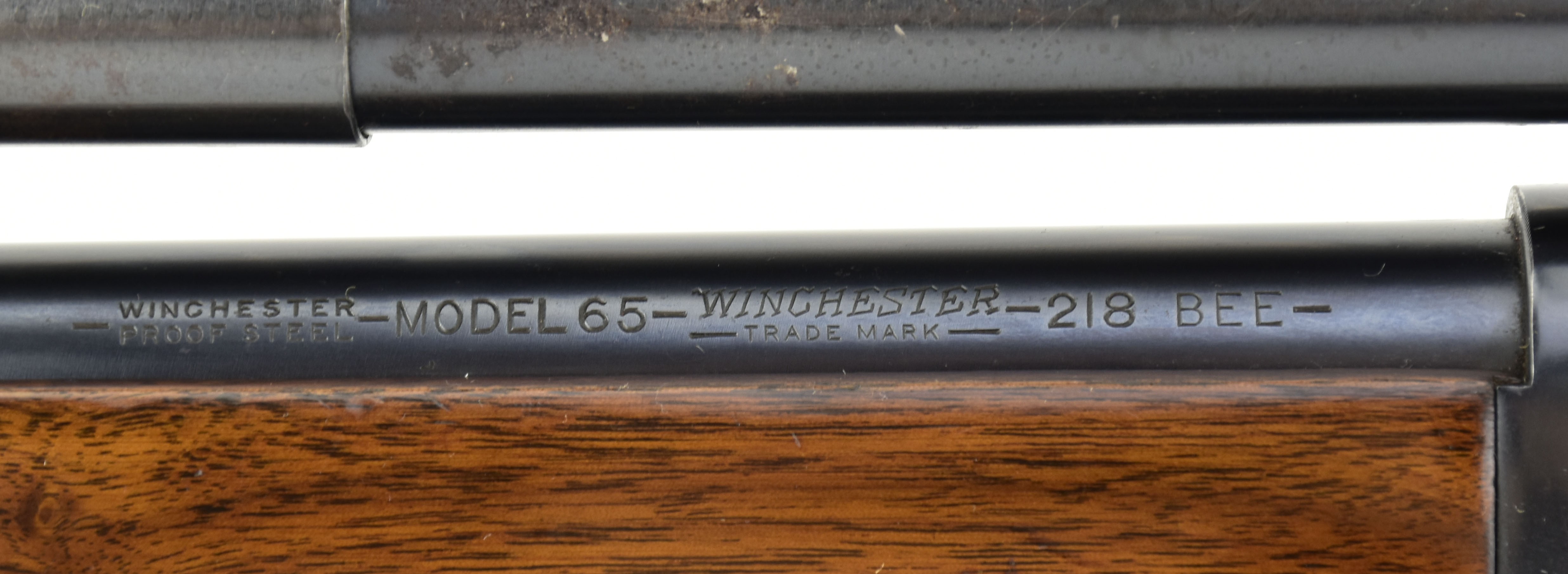 Winchester 65 .218 Bee caliber rifle. Small bore lever action in desirable .218 Bee caliber. Has a Weaver scope on Stith mounts. The blue is about 95%, the stock has marks and dents. The bore and action are excellent.