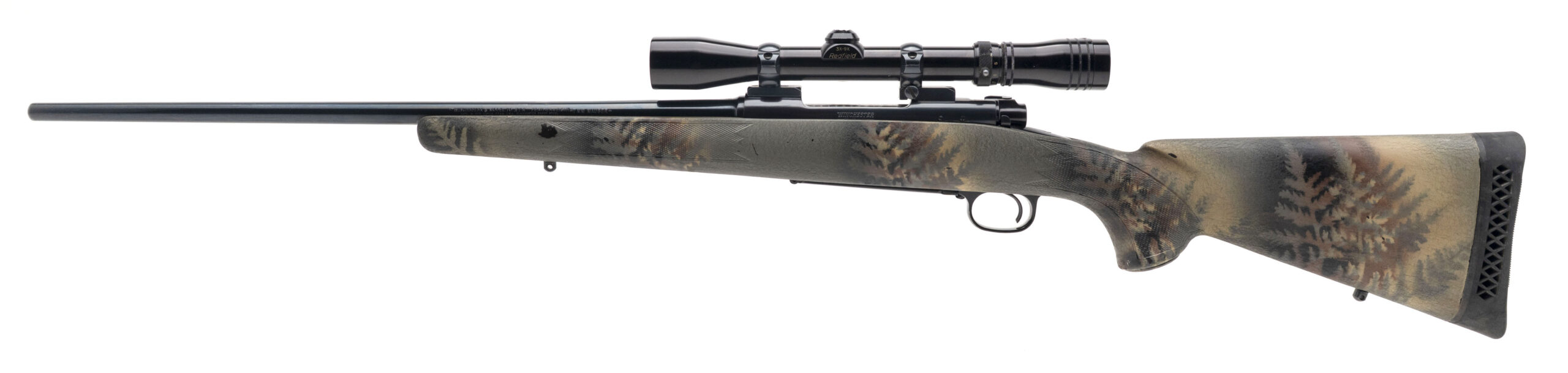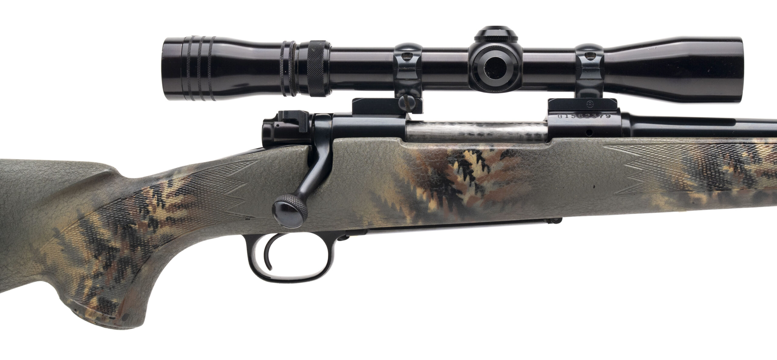SN: G1562379 made in 1981. Bolt action lightweight hunting rifle chambered in 7mm Mauser with a 22” barrel in a camo painted Bell & Carlson stock with a Redfield Widefield 3-9 scope. Overall in very good condition with moderate handling marks on the stock with some paint loss, metal finish just has some light wear and the bore is excellent.