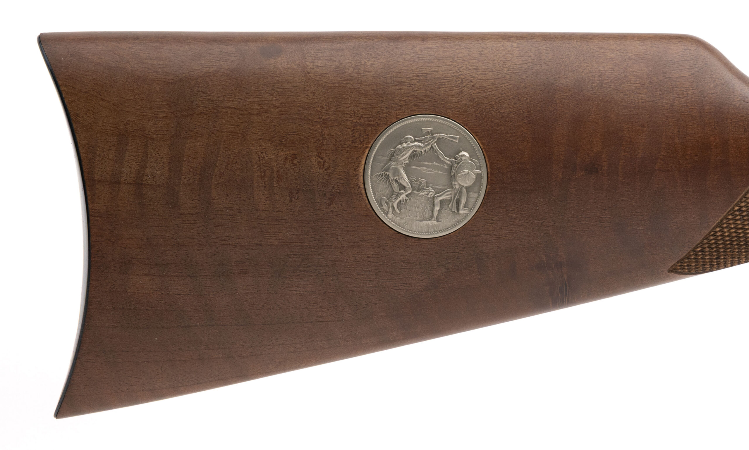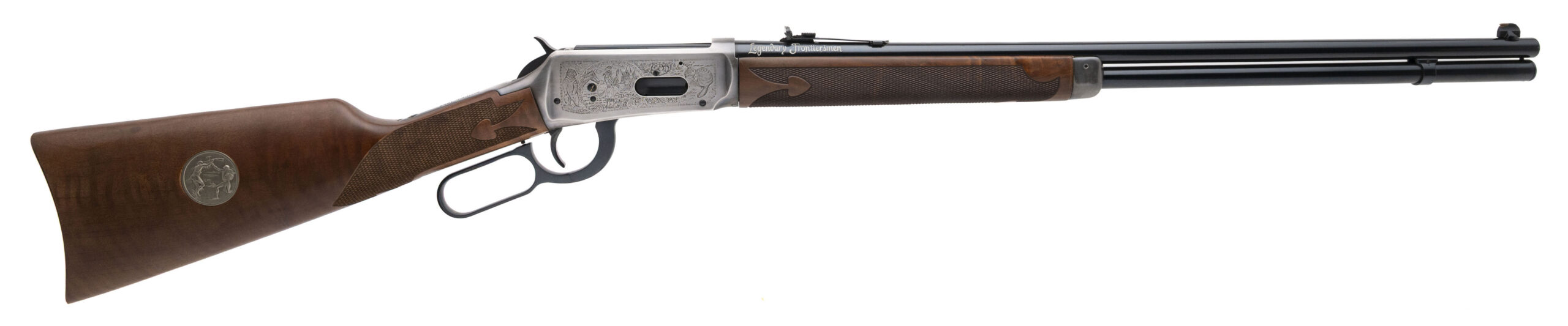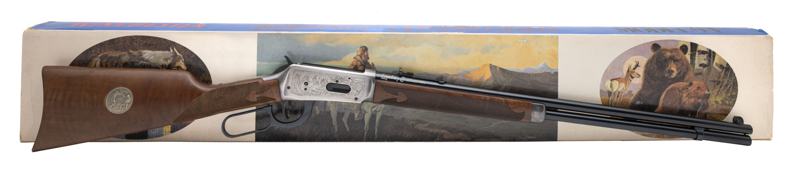 SN: LF01229. Made in 1979, .38-55 WIN. with a 24" barrel. Bore is excellent. Desirable Legendary Frontiersmen Commemorative lever-action rifle with a beaded front & semi-buckhorn rear sights, engraved stainless steel receiver, and checkered wood forend & stock with a Medallion inlay & crescent buttplate. Overall condition is near excellent. Comes with original box. Very desirable for any cowboy action gun collection.