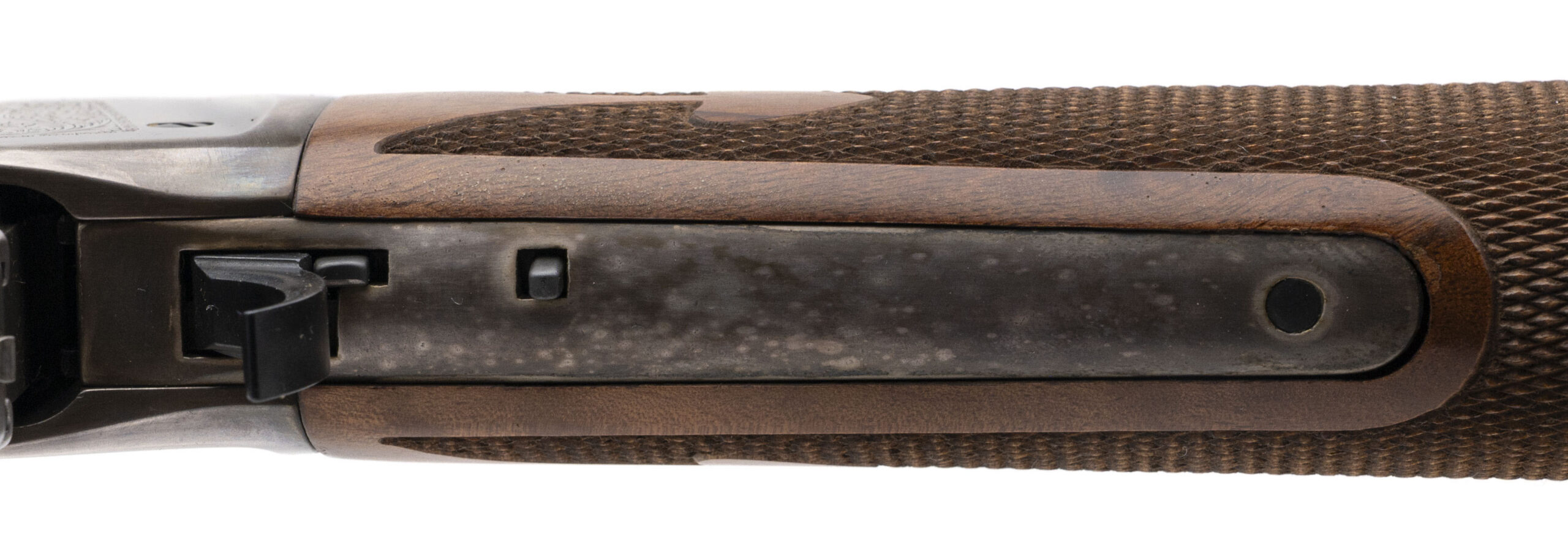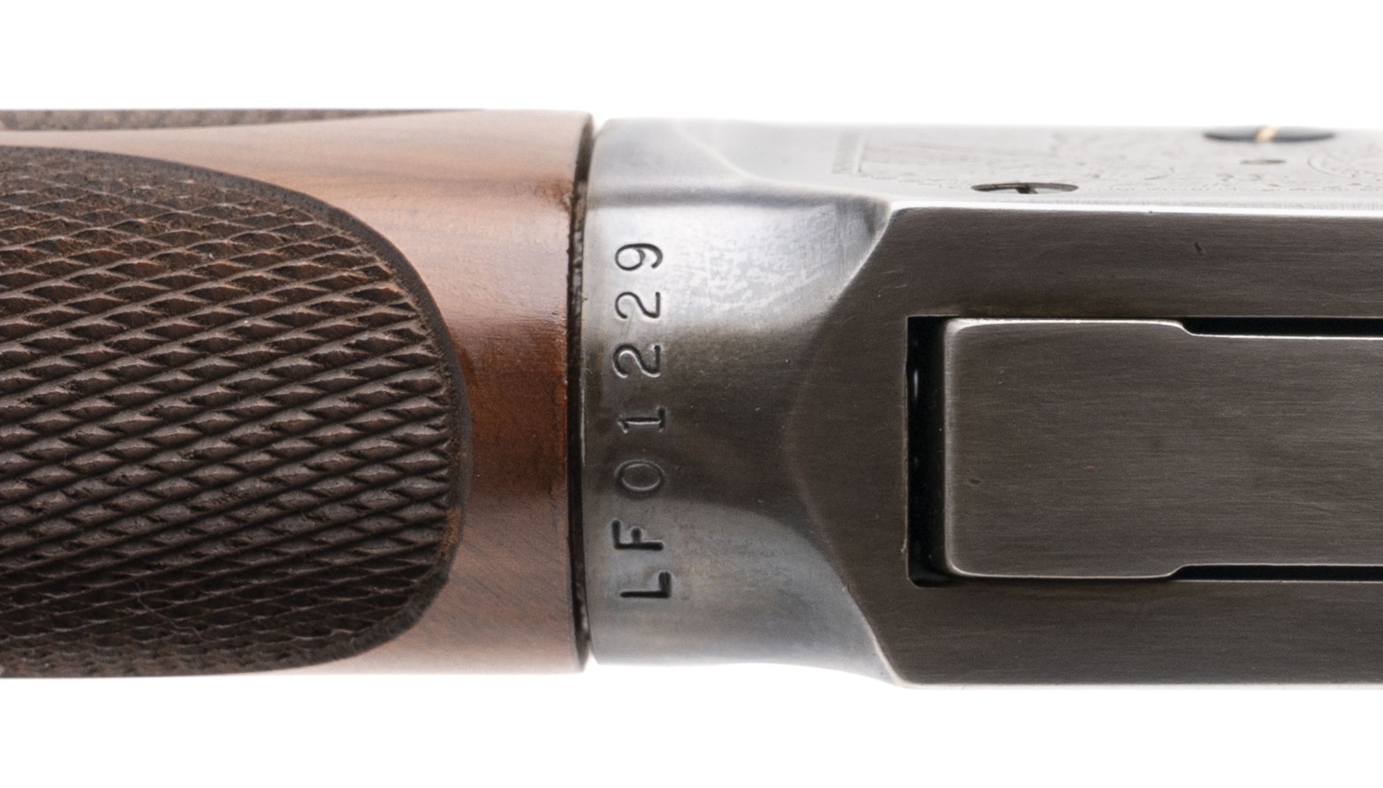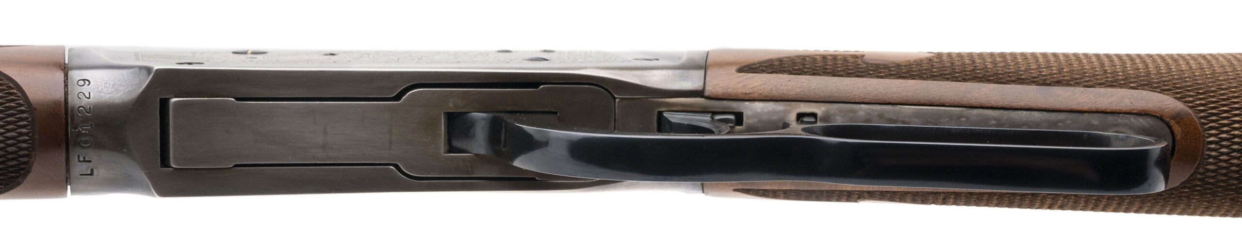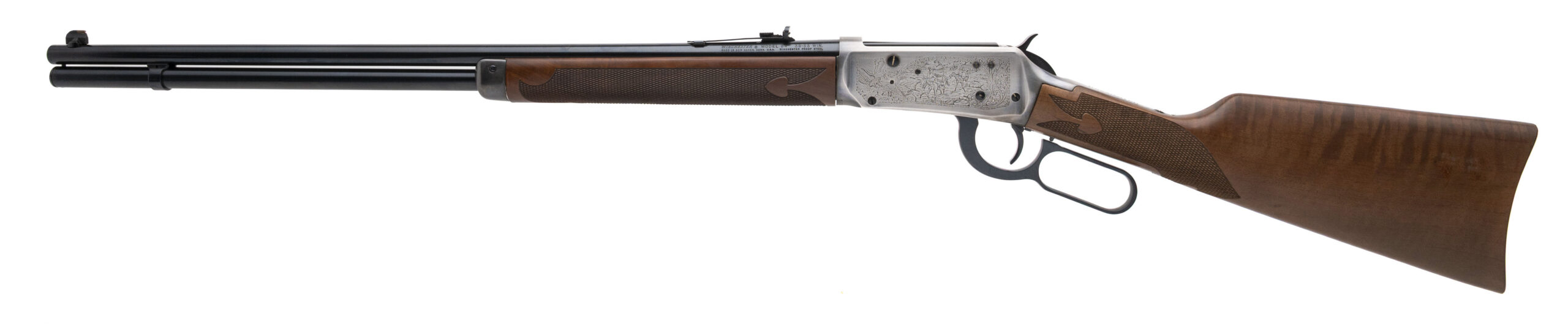 SN: LF01229. Made in 1979, .38-55 WIN. with a 24" barrel. Bore is excellent. Desirable Legendary Frontiersmen Commemorative lever-action rifle with a beaded front & semi-buckhorn rear sights, engraved stainless steel receiver, and checkered wood forend & stock with a Medallion inlay & crescent buttplate. Overall condition is near excellent. Comes with original box. Very desirable for any cowboy action gun collection.