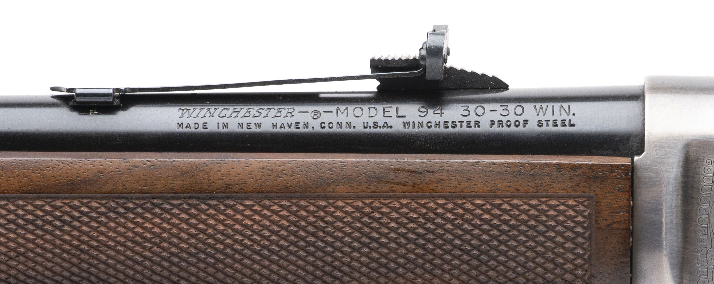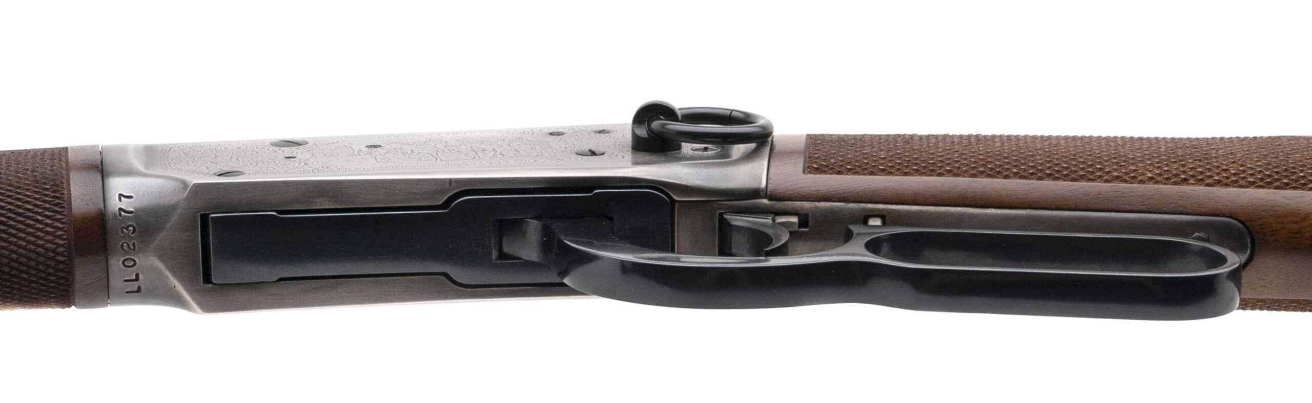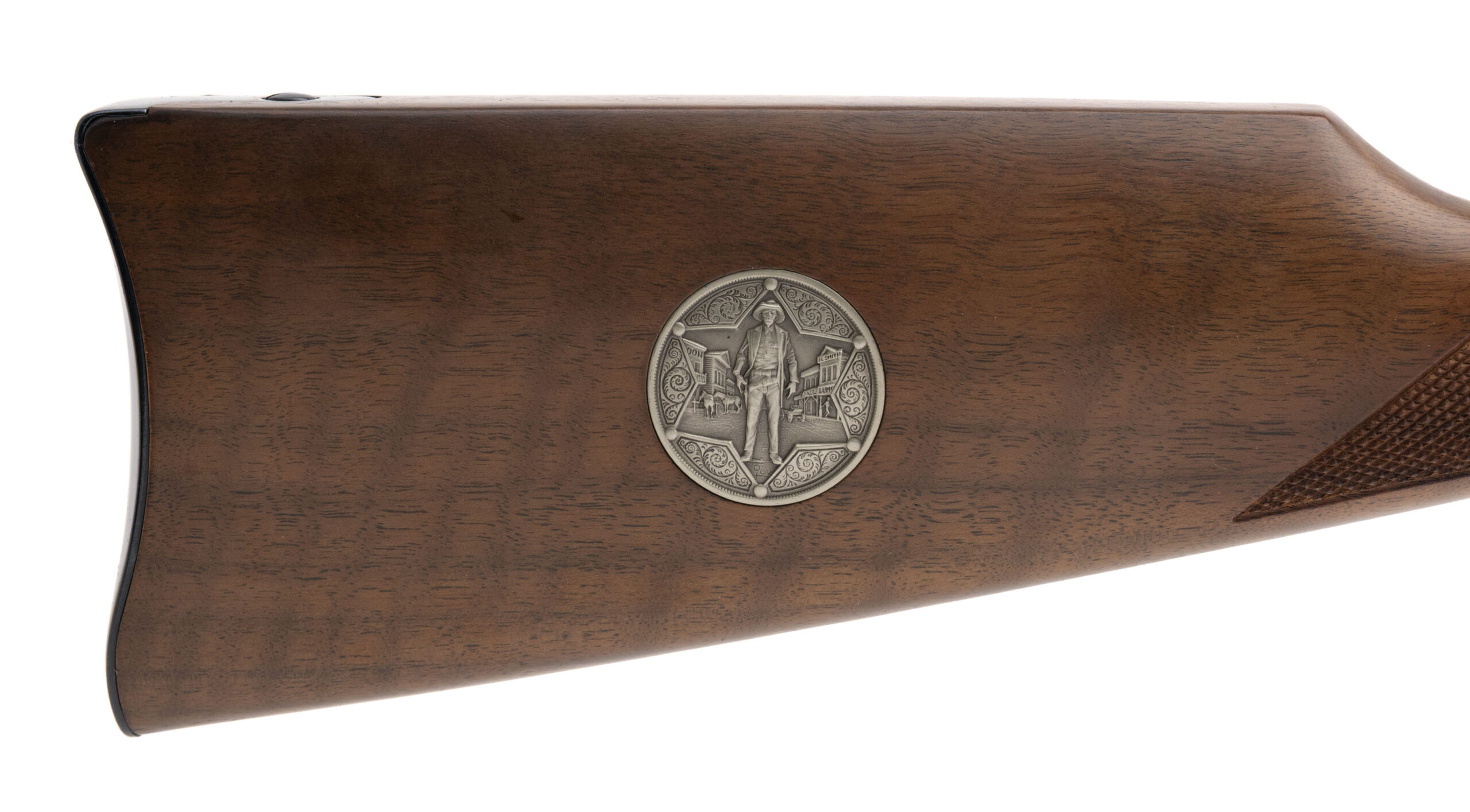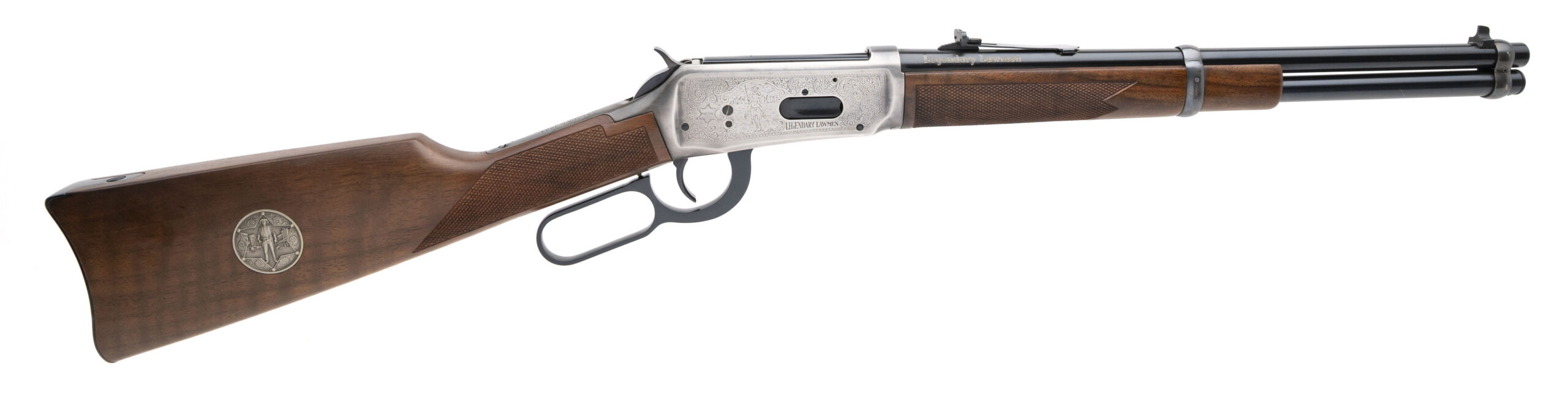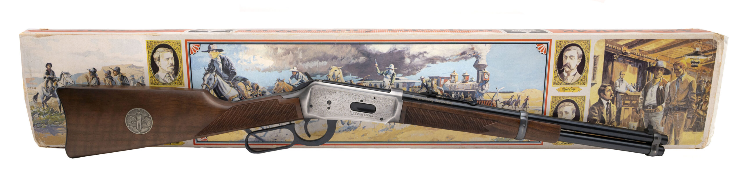 SN: LL02377. 1977 production, .30-30 with a 16" blued finished barrel. Bore is excellent. Legendary Lawmen Commemorative lever action carbine with a bladed front sight, adjustable rear sight, saddle ring, engraved stainless steel receiver, and checkered wood forend & stock w/medallion inlay & crescent butt plate. Excellent condition overall. Comes with factory box and papers. Beautiful lever action carbine made in honor of Law Enforcement figures with a limited production run of 19,999 units made, making this model very desirable for any cowboy action collection.