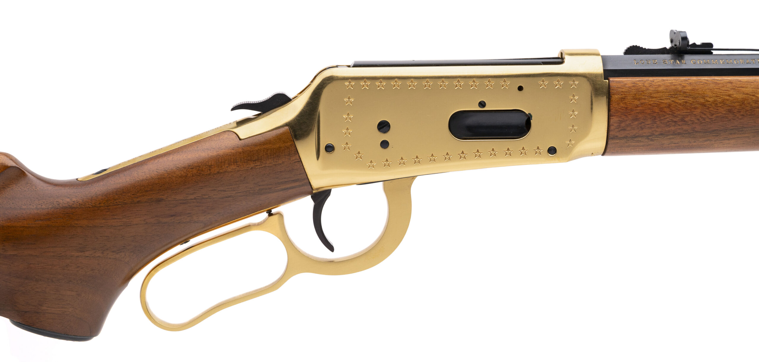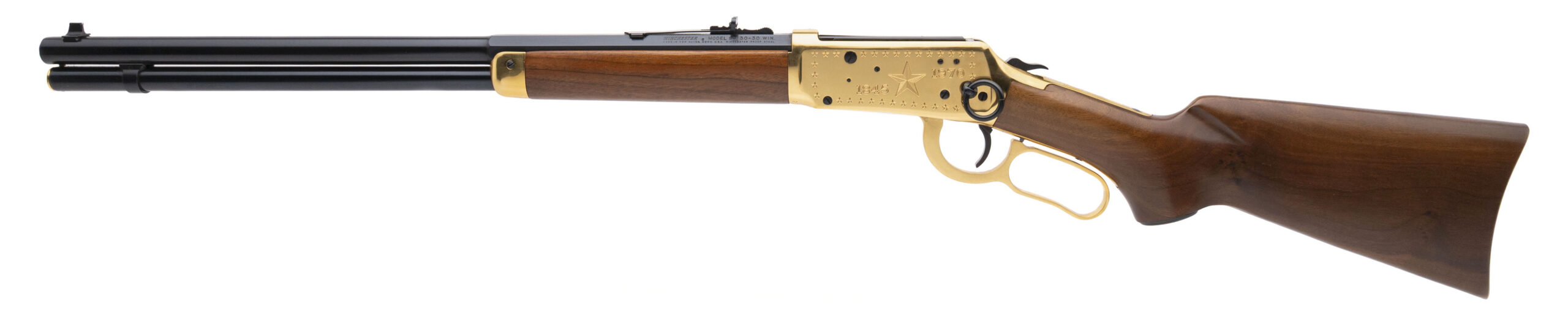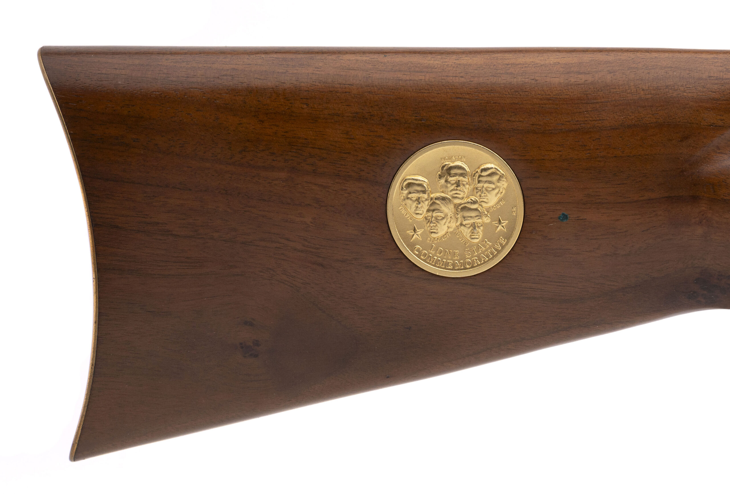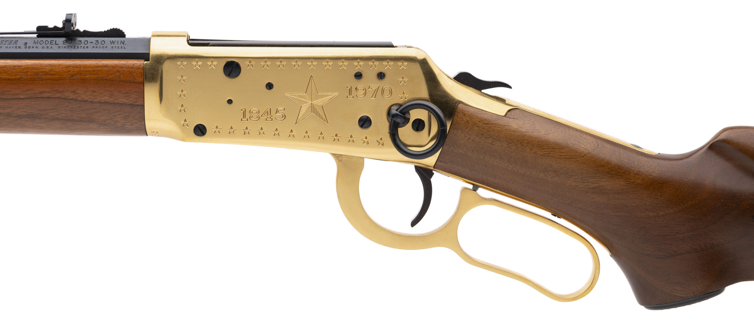 SN: LS4185. 1970 production, .30-30 with a 26" half-octagon/round barrel. Bore is excellent. Lone Star Commemorative lever action rifle with gold-plated receiver Lone Star engravings, walnut forend & stock w/Medallion inlay and gold-plated crescent plate, and a saddle ring. A very desirable collectors grade rifle, that celebrated "The Lone Star State" heritage. Very good condition overall. Comes with factory box.