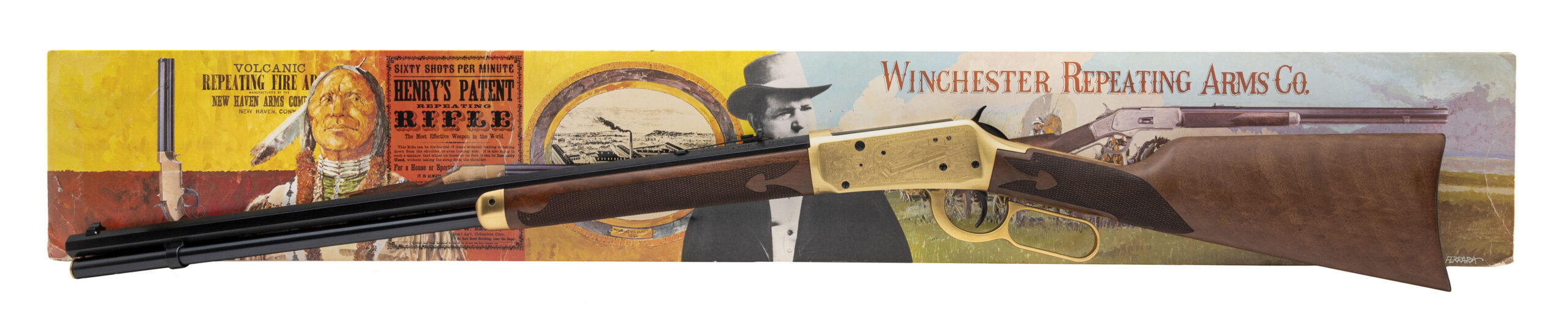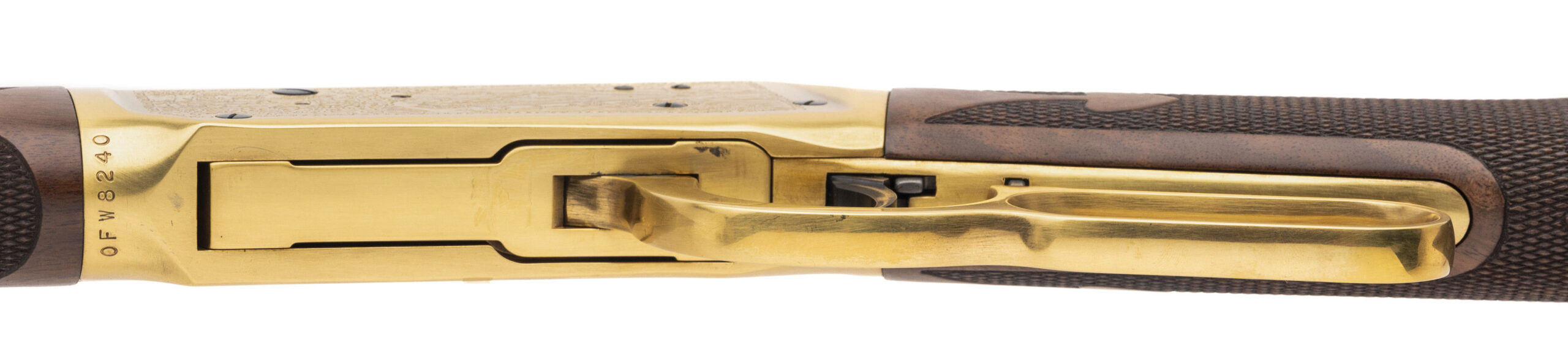 SN: OFW8240. 1980 production, 38-55 with a 24" octagon barrel. Bore is excellent. The Oliver F. Winchester Commemorative lever action rifle with an engraved gold-plated receiver and checkered walnut forend & stock w/Medallion inlay and crescent butt plate. This model had a limited production run of 19,999 units made, making this a very desirable rifle for any cowboy action gun collection. Like new condition overall. Comes with factory box.