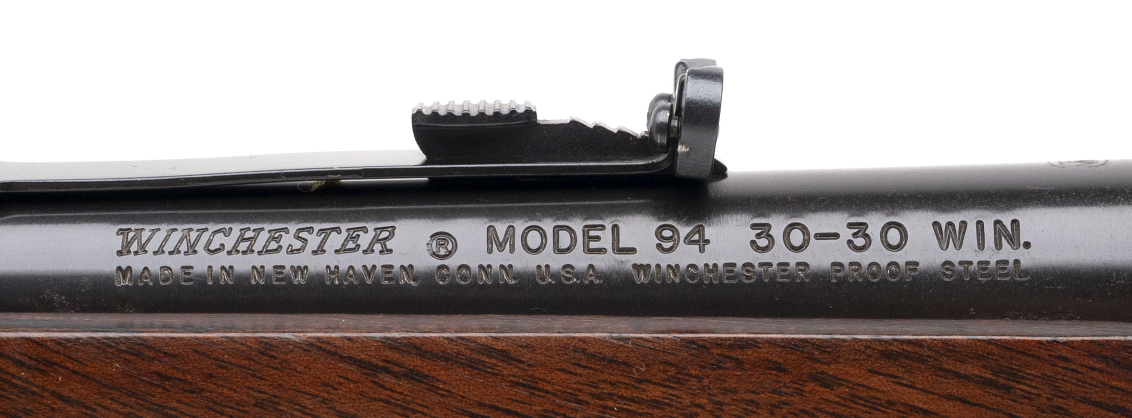 SN: RA3038. Made in 1973, .30-30 with an 20" barrel. Bore is bright with strong rifling. Texas Ranger Commemorative lever action rifle with saddle ring and side loading gate. There's some areas on the barrel where pitting is visible but retains 95% of original blue finish. Wood furniture has moderate handling wear near and on the butt plate. Overall condition is very good.