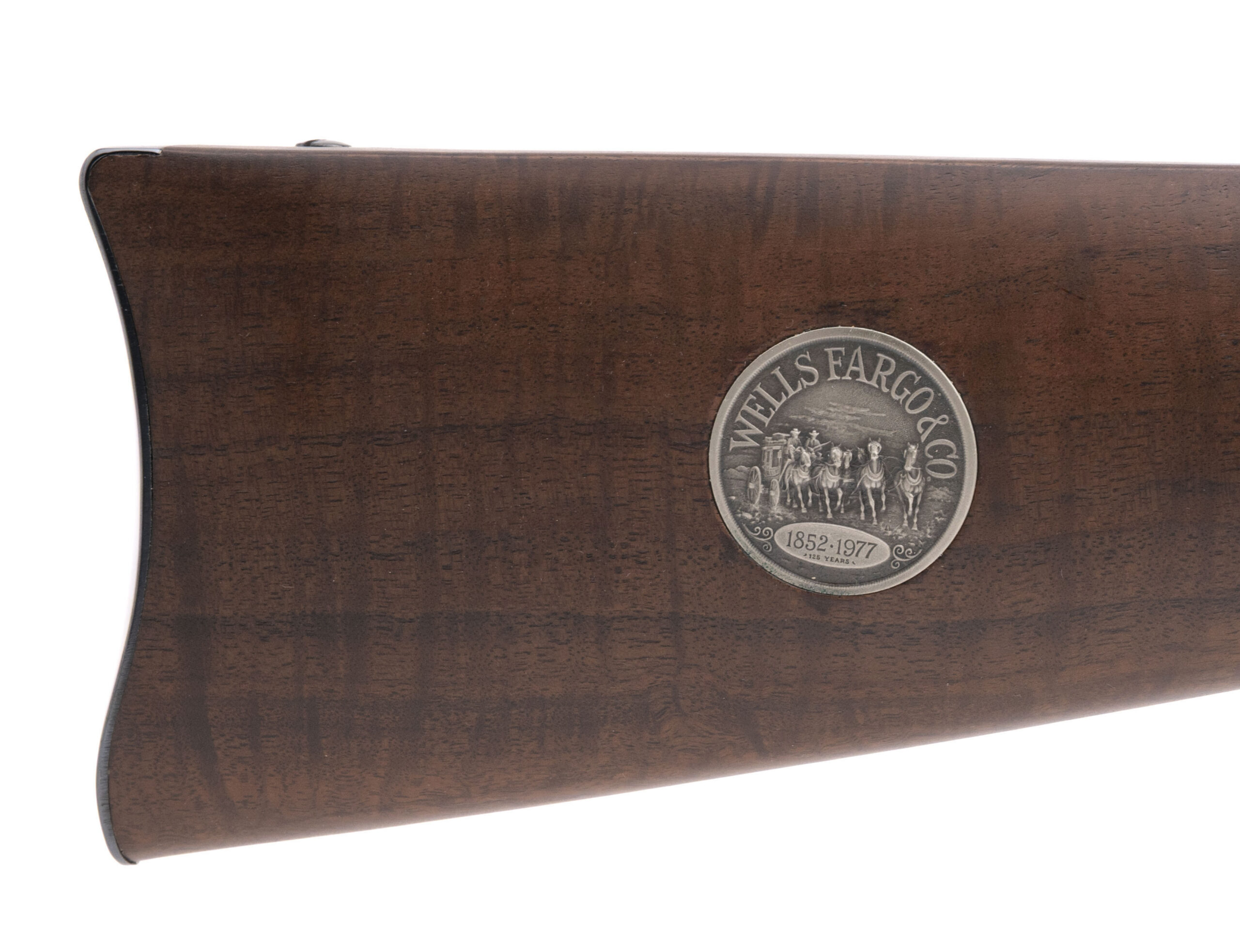 SN: WFC18316. 1977 production, .30-30 Winchester with a 20" blue barrel. Bore is very good. Commemorative lever action saddle ring carbine with an engraved nickel receiver and deluxe wood forend & butt-stock w/blue crescent butt-plate. This gorgeous rifle was created to honor the 125th anniversary of Wells Fargo and its role in the American frontier. These were a limited production run in 1977 with a total of 19,999 units produced making this lever gun very desirable for any cowboy action gun collection. Very good condition overall. Comes with original factory box and papers.