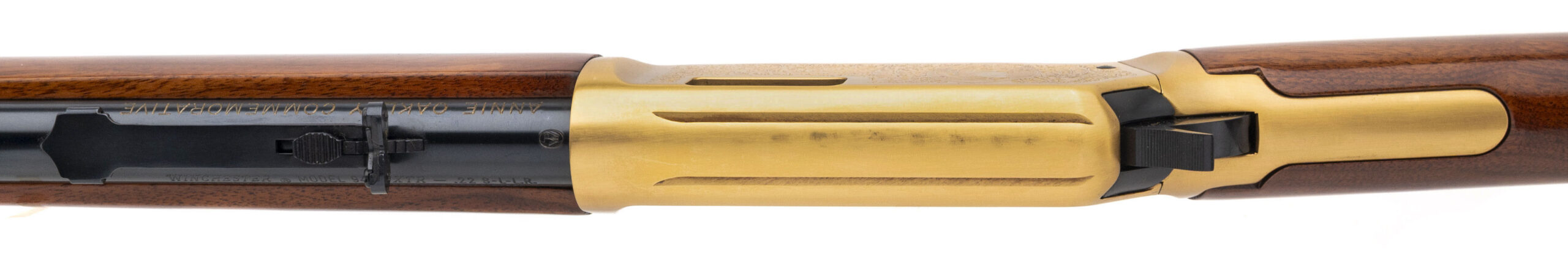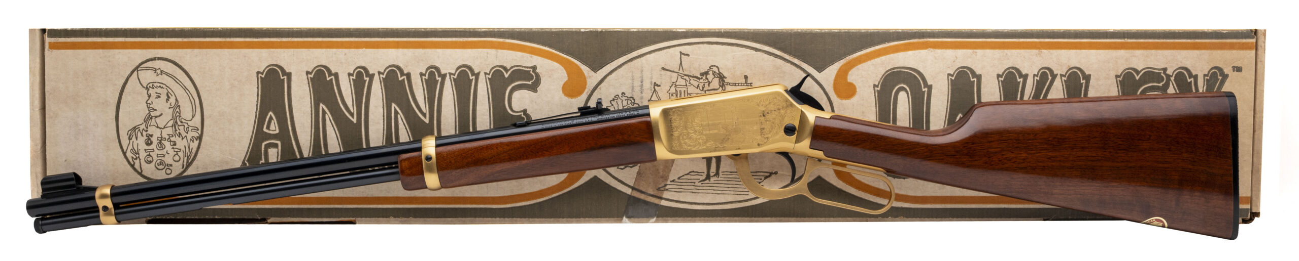 SN: AOK1281. 1982 production, .22 caliber with a 20.5" blued barrel. Bore is excellent. Scarce rimfire lever action carbine with a limited production run of 6,000 units made in honor of the "Legendary American Sharpshooter" Annie Oakley, making this very desirable for any cowboy action gun collection. Features includes a gold plated finish, beautiful walnut forend & stock, and an engraved receiver. This carbine accepts .22 shorts, longs, and long rifle cartridges. Excellent overall condition. Comes with factory box and papers.