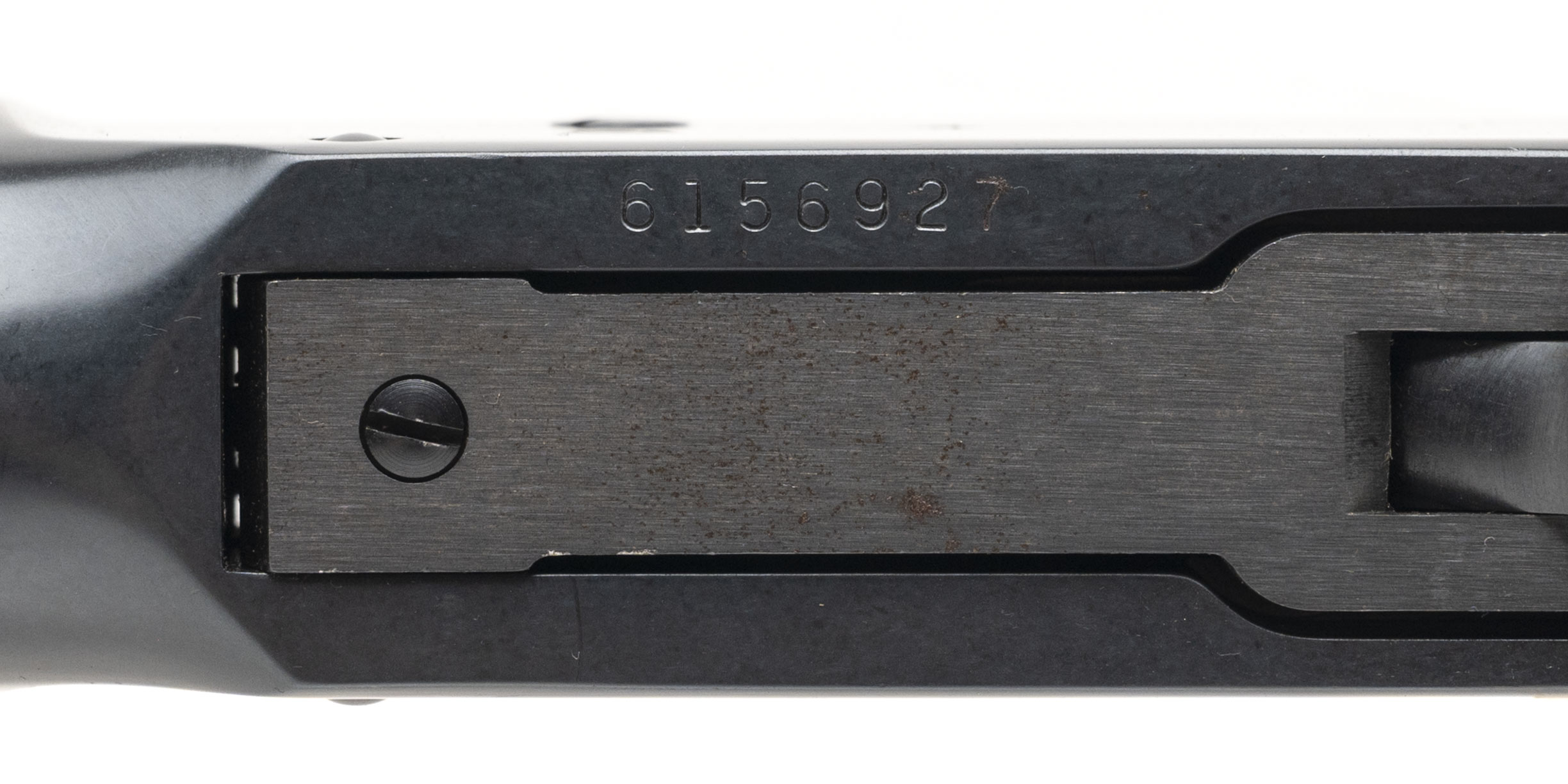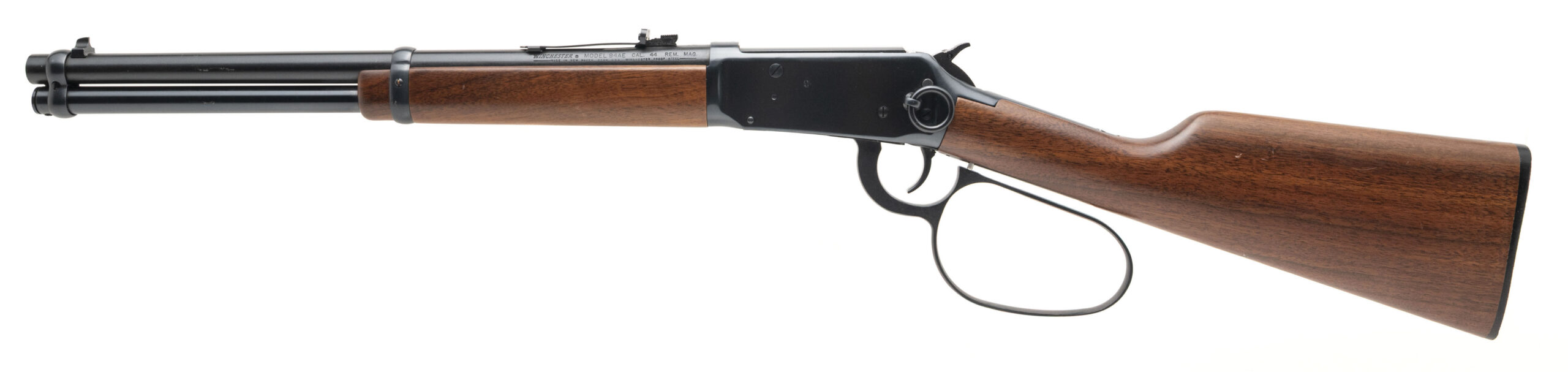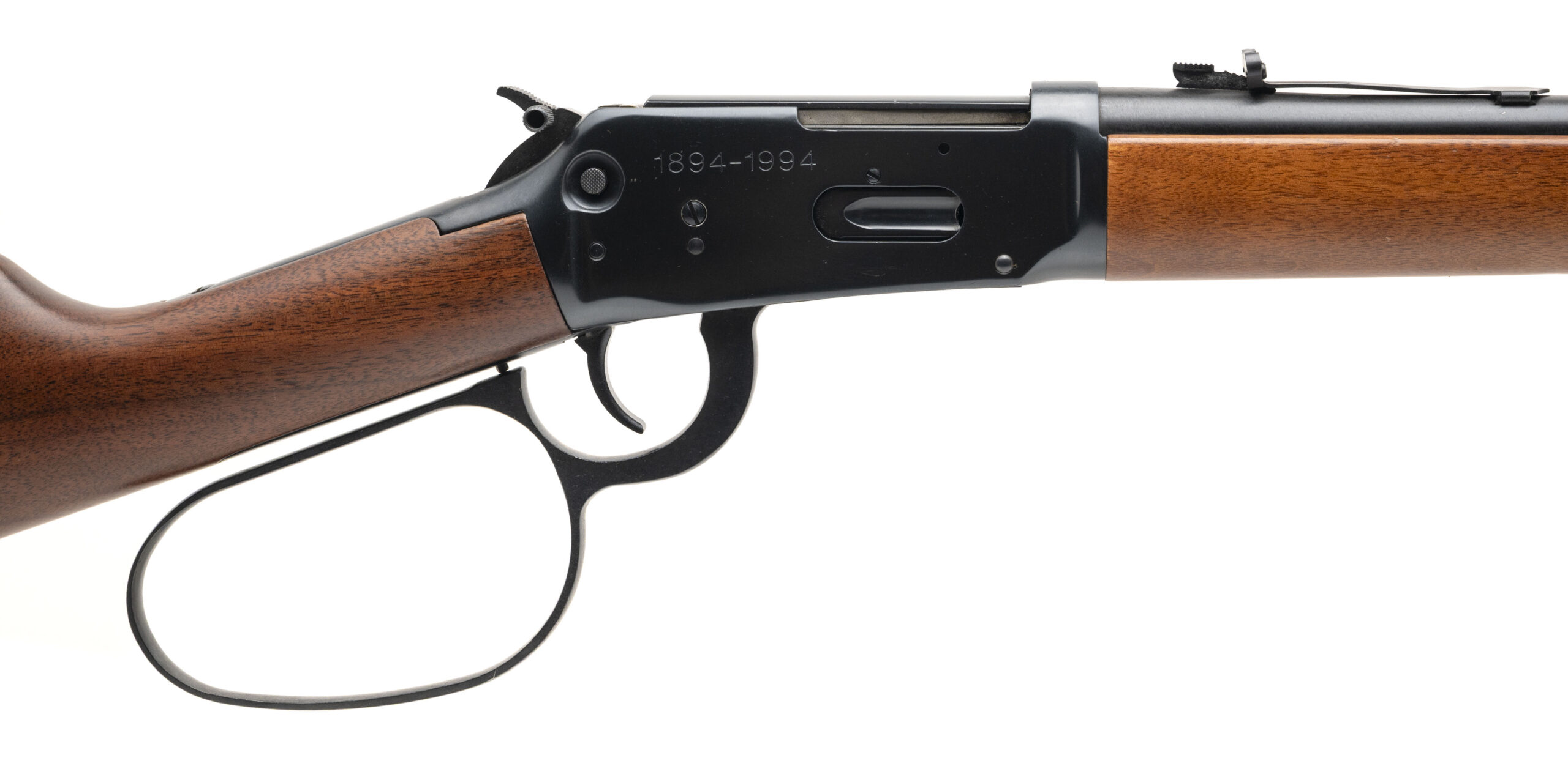SN: 6156927 made in 1994. Lever action carbine chambered in 44 Rem Mag with a 16" round barrel with iron sights, cross bolt safety, hammer extension, large loop lever, blued metal finish with "1894-1994" engraved on the receiver and walnut furniture with the original butt plate. Some lilght handling marks, overall in very good condition with an excellent bore.