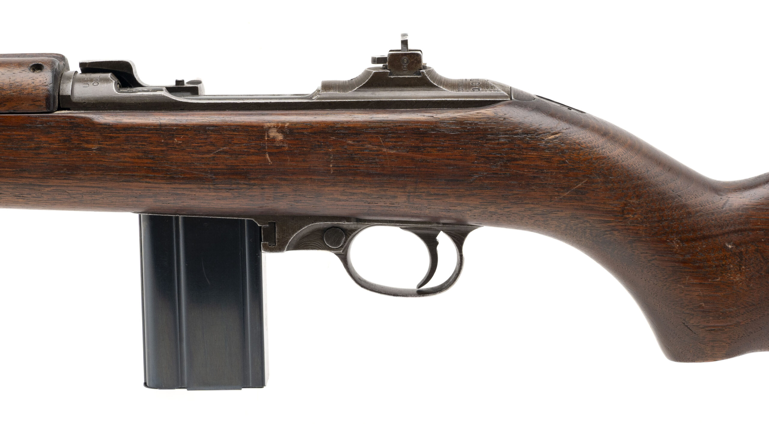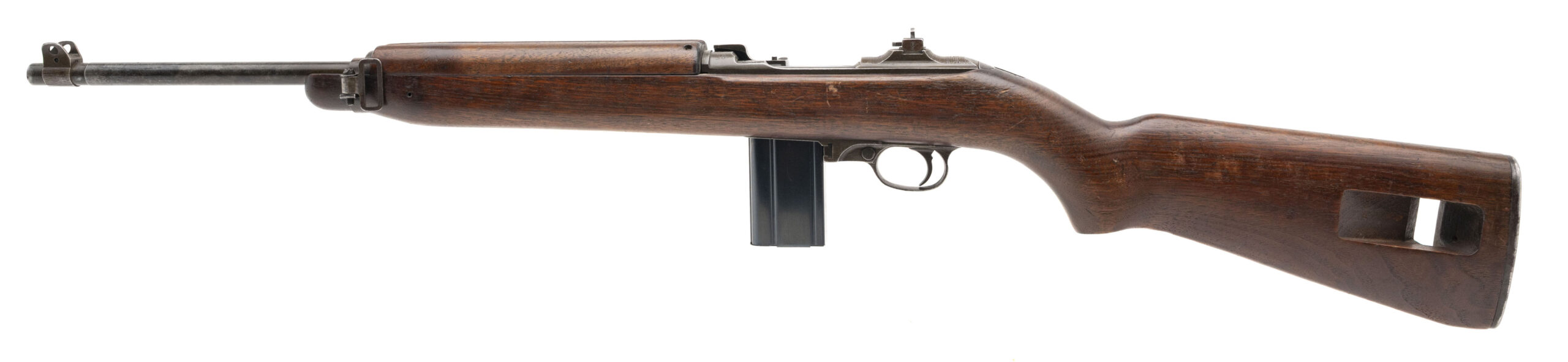 Serial Number 1070186. Made in 1942 with a round 18-inch Winchester barrel with a bright bore that has strong visible rifling. This gun is in World War II "as built" configuration with a "W" marked operating slide, trigger group, magazine catch & Type 2 "dogleg" hammer. It also has a push button safety, flat bolt & square "S" marked flip rear sight made by Lyman. The only component that is not correct for it is the high wood/oval cut Inland stock with matching 2-rivet handguard. Overall condition is excellent with a dull brown patina across the metallic parts & only light handling wear on the furniture. Comes with one USGI 15-round magazine.