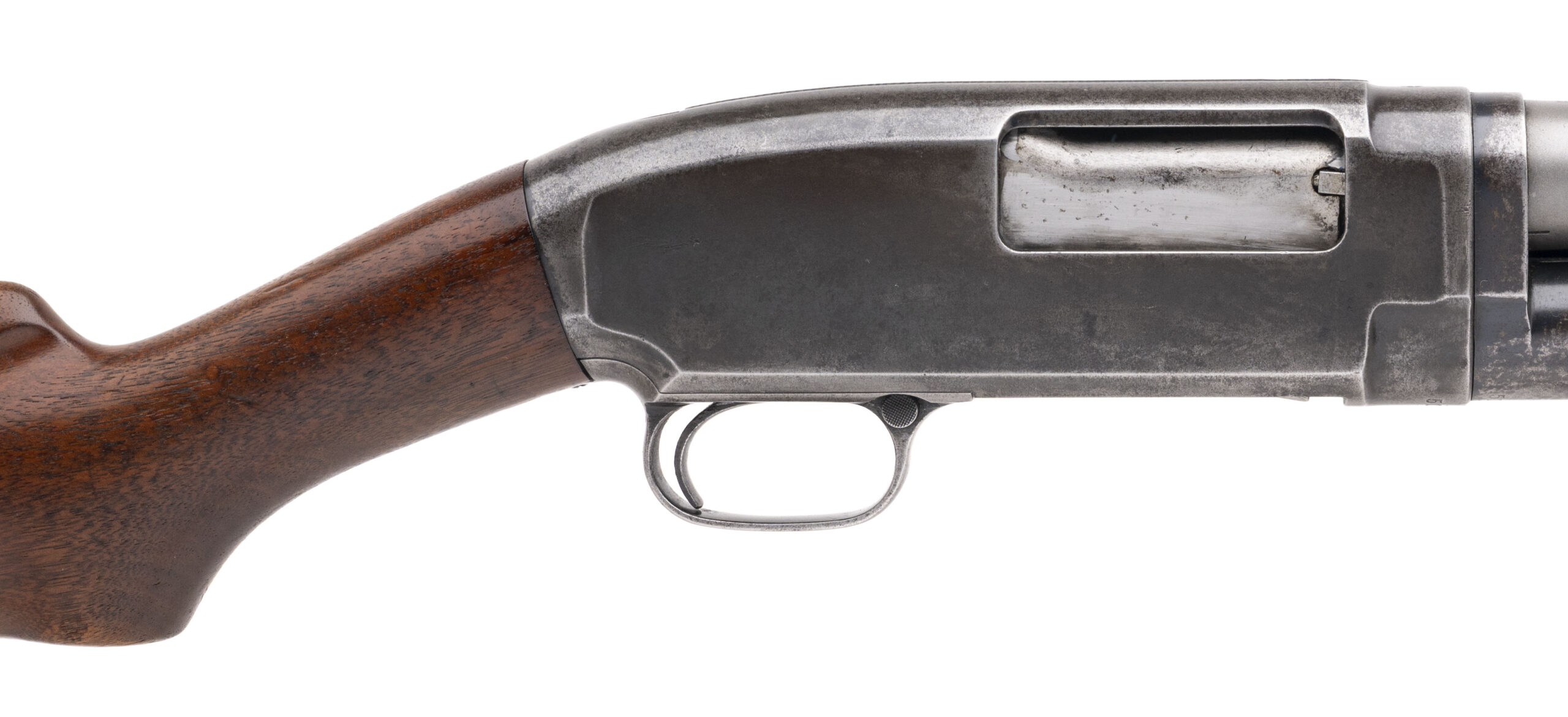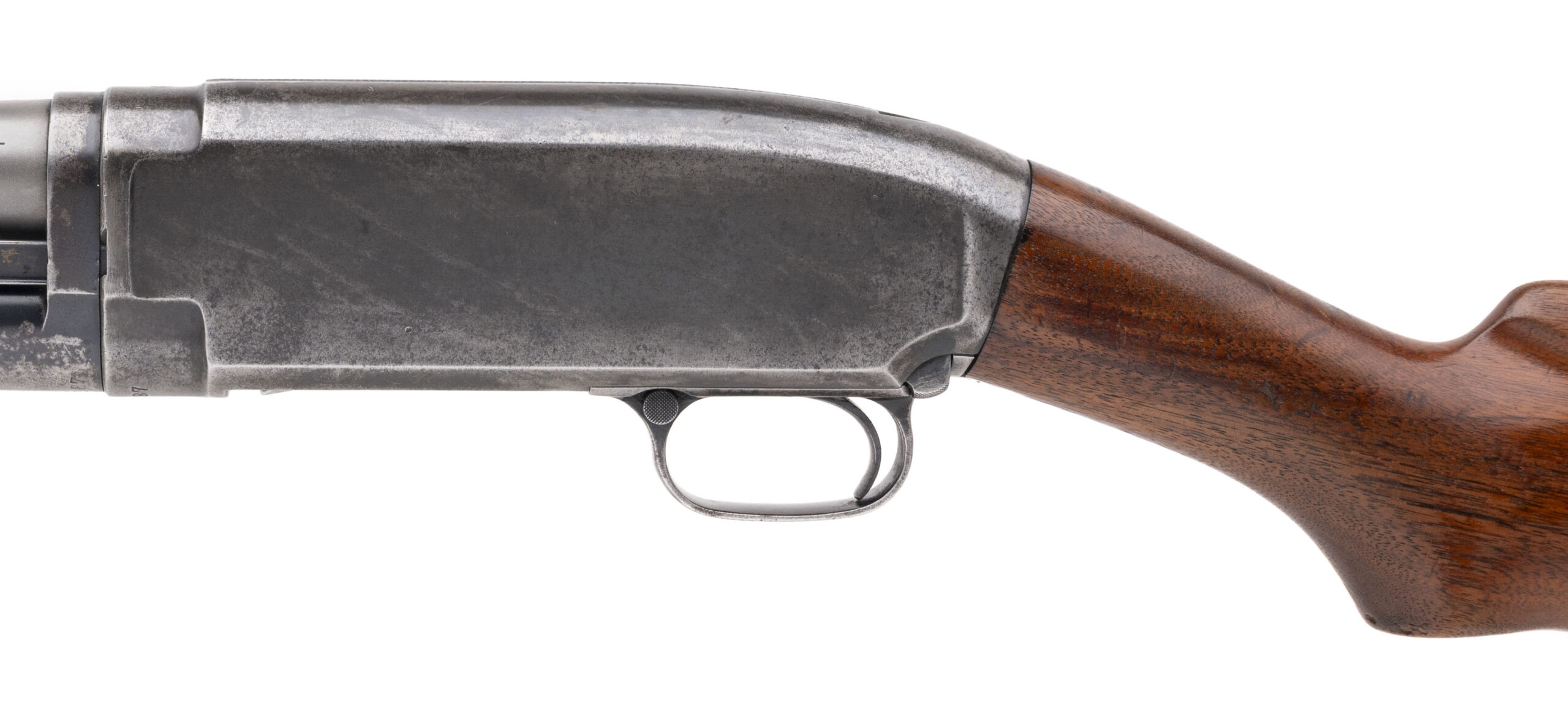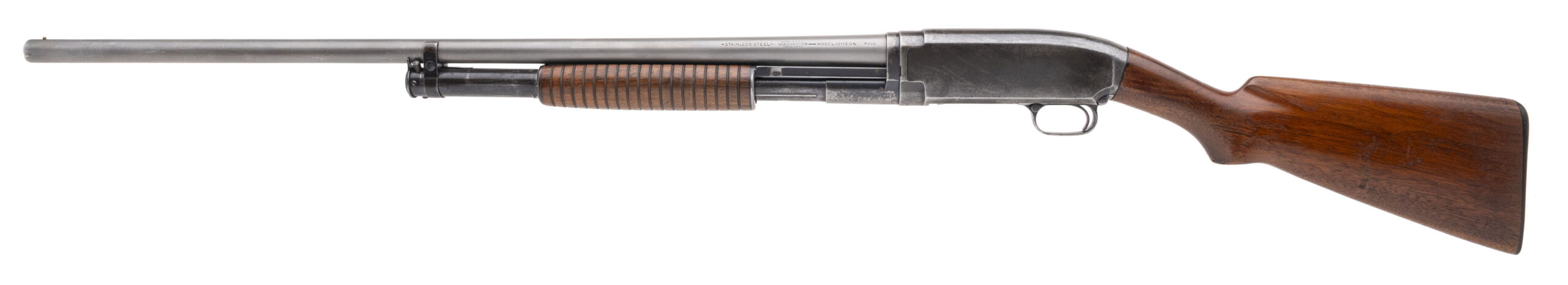 SN: 501387 made in 1927. 12 gauge pump action field shotgun with a 30" round stainless steel barrel, 2 1/2" chamber and fixed full choke. Blued receiver and magazine tube has faded to an even patina. Walnut furniture is solid with no cracks or damage and a 13.75" LOP to the original butt plate. Overall in good solid shape as a shooter with an excellent bore. CONSIGNMENT