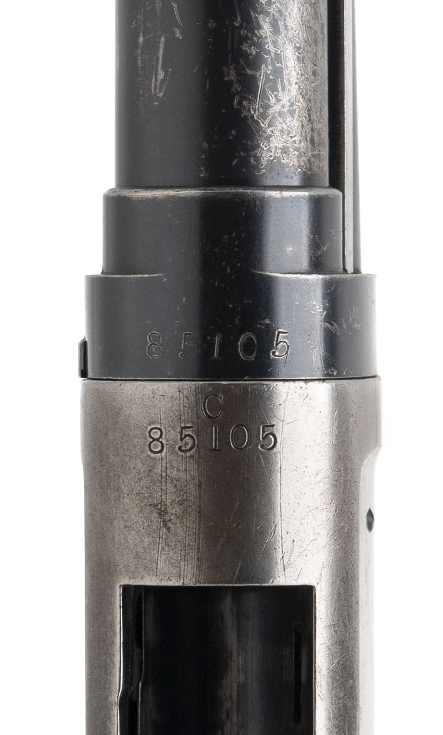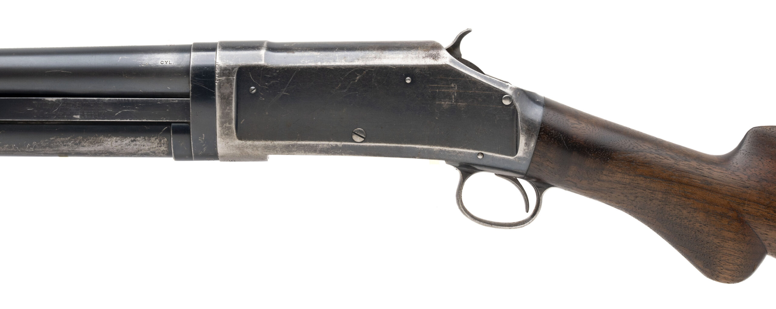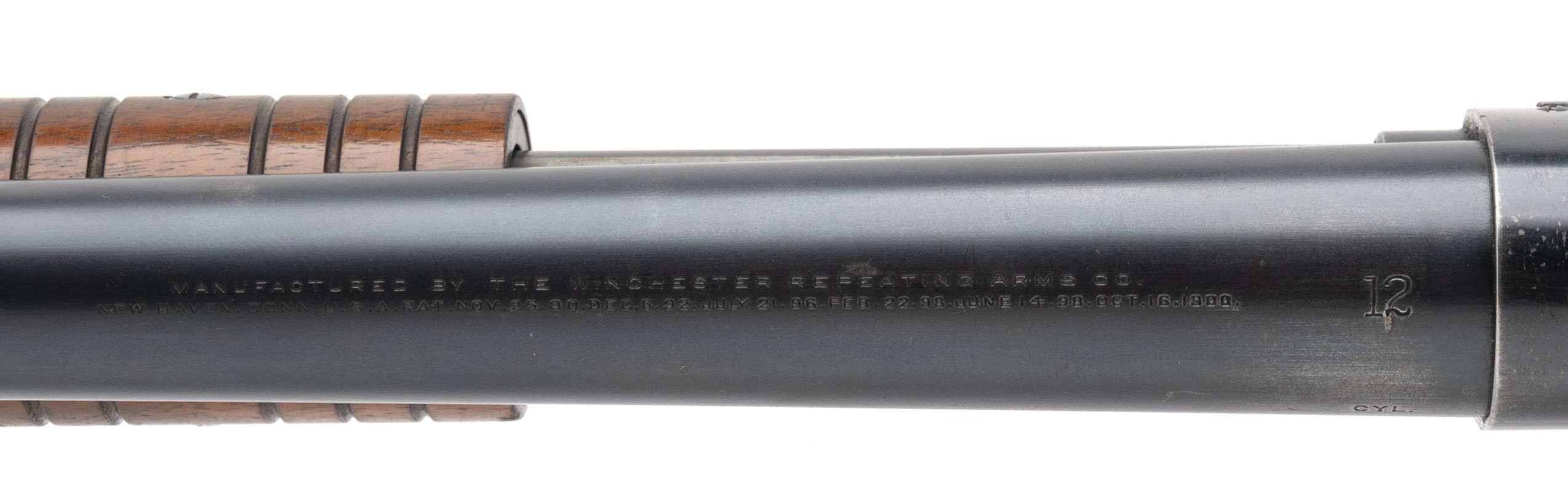 SN: C85105 made in 1899. 12 gauge pump action takedown shotgun with a 26” barrel with the original 2 ½” chamber and factory fixed Cylinder choke marked CYL on the barrel. Exposed hammer “slam-fire” action with early 3 screw forend and 13” LOP to the original steel butt plate. Most of the oil finish has worn off the stock but the forearm still has some original finish. While there is a significant amount of handling marks on the metal much of the original bluing is also still present. Overall in good condition for the age with an excellent bore.