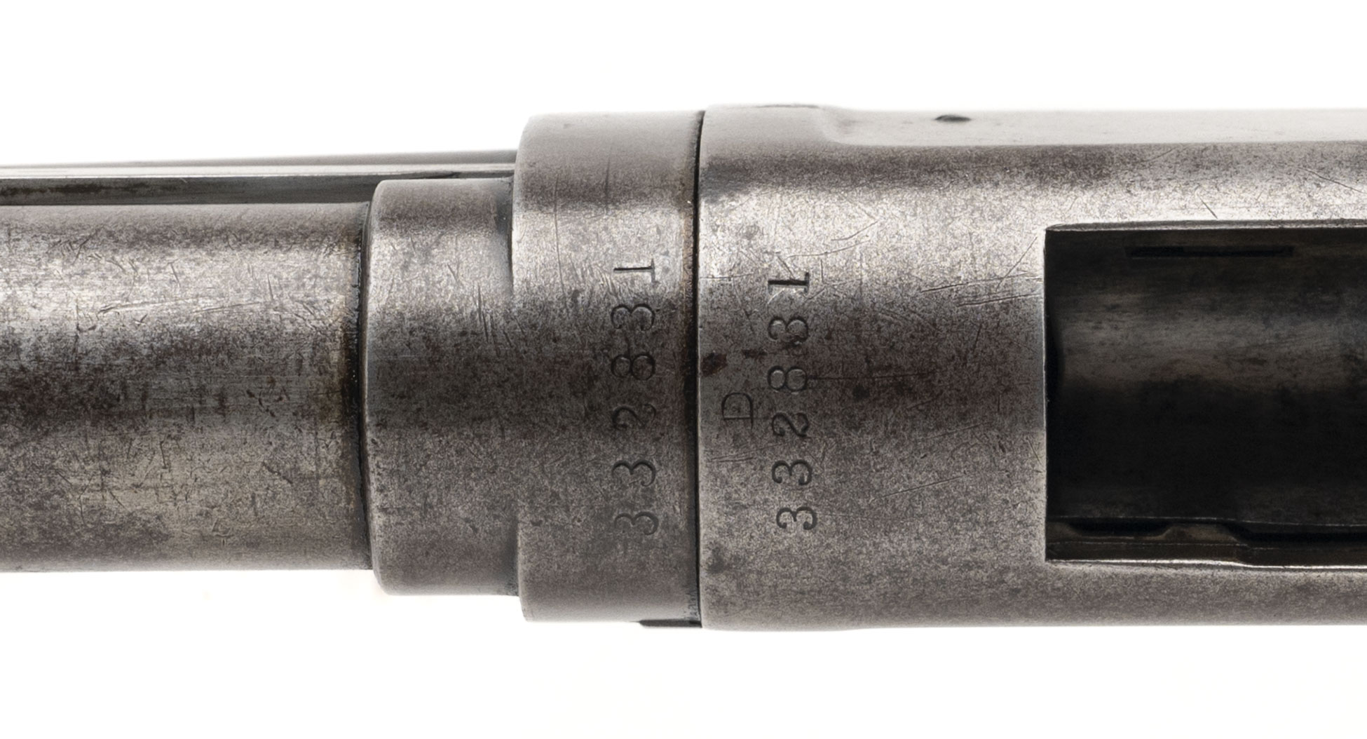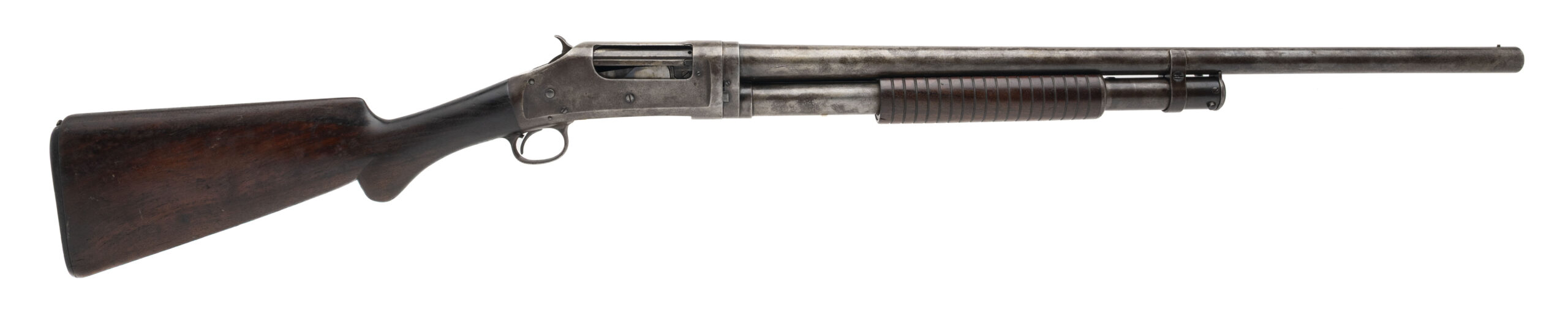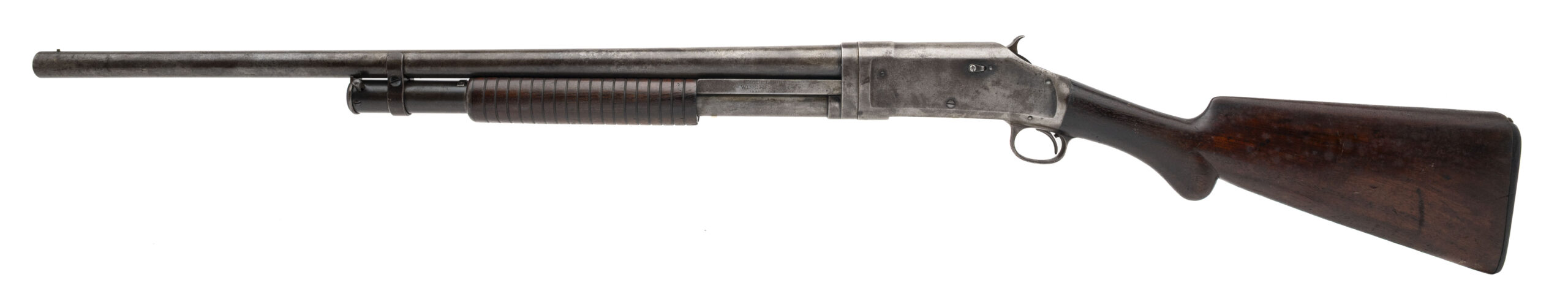 SN: 332831 made circa 1906. 12 gauge exposed hammer pump action shotgun with a 25.5" round barrel, 2 1/2" chamber and factory marked Cylinder choke. Walnut furniture with a 14" LOP to the original butt plate. Metal finish has worn and turned to an even patina, wood is dark with moderate handling marks but solid with no cracks, butt plate has a small chip at the top but is solid and the bore is bright with some light pitting throughout. Overall in fair but solid condition.