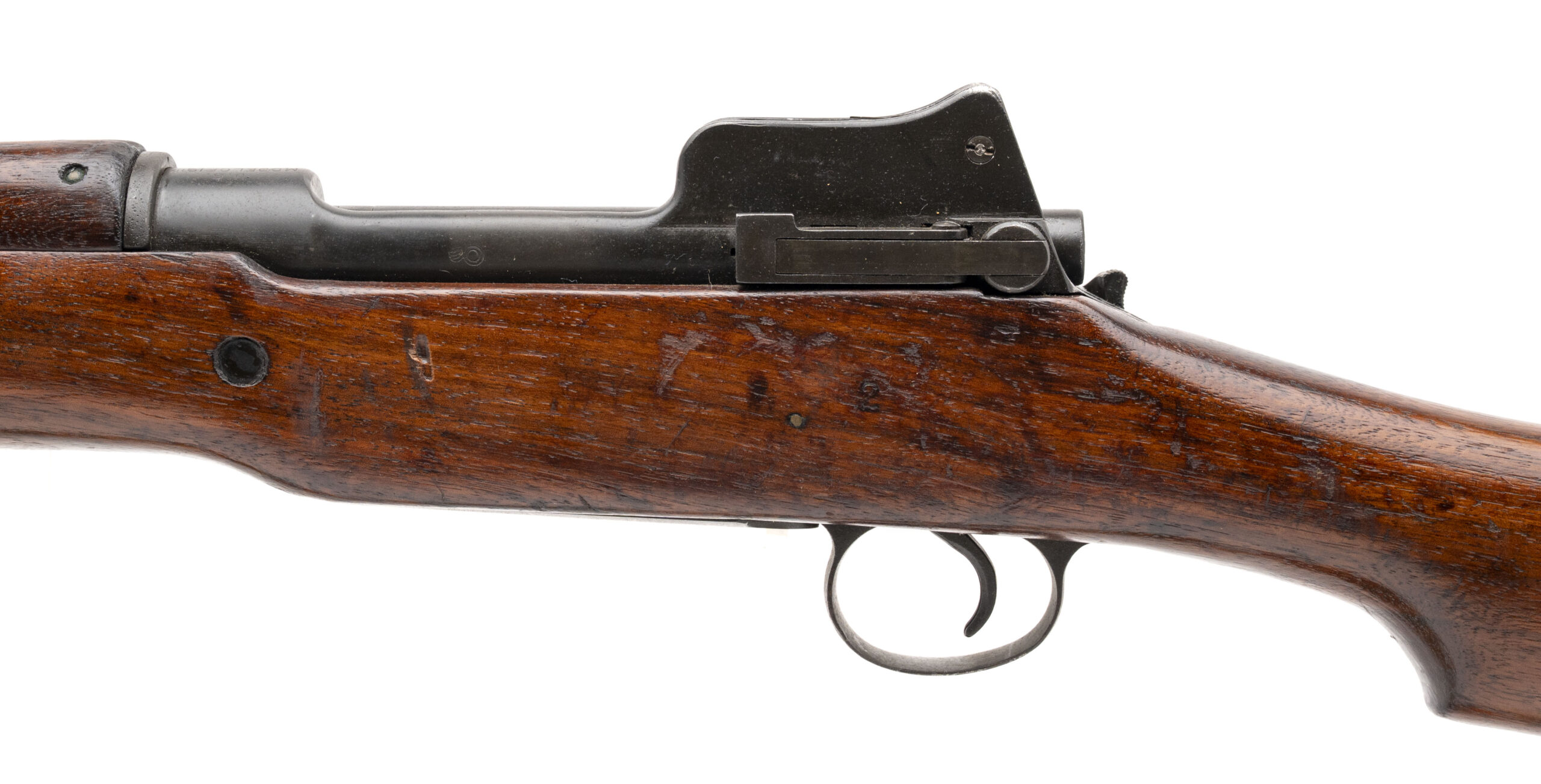 Serial No. 545324, manufactured circa 1919, chambered in .30-06, with a 24” round barrel marked “W / Flaming Bomb / 1-19.” All visible components are “W” marked, indicating correct Winchester manufacture throughout. The original finish rates approximately 95%, showing only minor thinning from age and use. The stock remains in good condition, displaying light handling impressions consistent with careful use and storage. The action is smooth and functions correctly, reflecting the robust design and craftsmanship typical of the Model 1917. These rifles were produced in large numbers during WWI and continued in service into WWII, making this a solid and desirable piece for collectors of U.S. military arms.