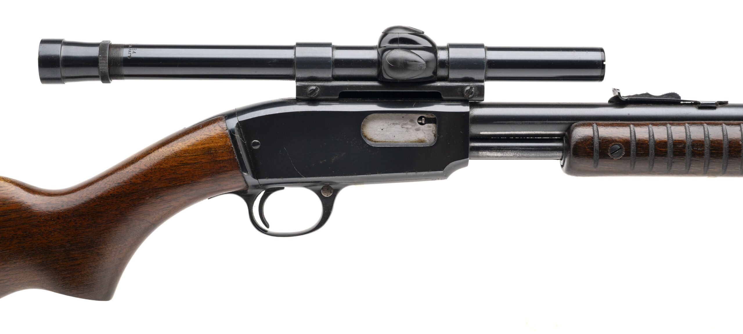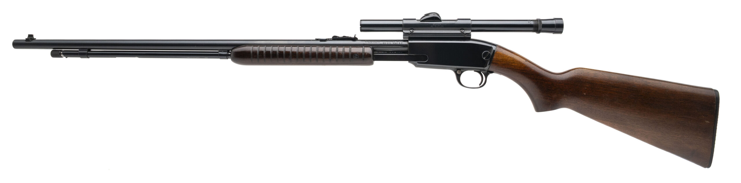 SN: 300630 made in 1962. Pump action takedown rifle chambered in 22 Win Mag R.F. with a 24" round barrel, dovetailed front and rear sights and weaver B4 scope with original walnut furniture and original Winchester butt plate. Furniture is in very good condition with some light handling marks. Receiver has some small areas of patina on the right side but other than that the metal finish is in very good condition and the bore is excellent.