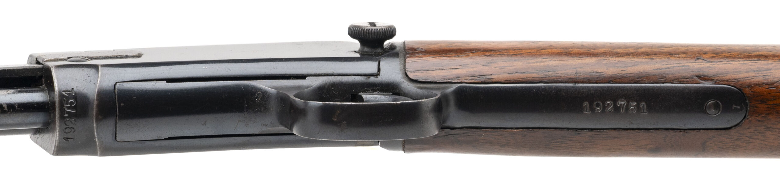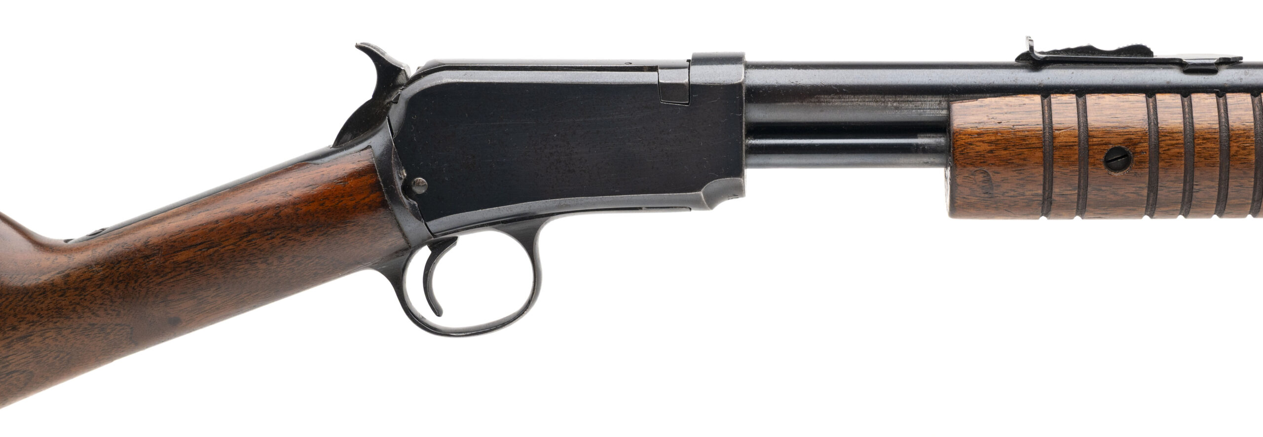 SN: 192751 made in 1947, pump action 22lr takedown rifle with a 23" round barrel, dovetailed front and rear sights and walnut furniture with the original Winchester butt plate. Some light wear and handling marks visible with some speckled patina on the right side of the receiver but overall in very good condition for the age with an excellent bore.