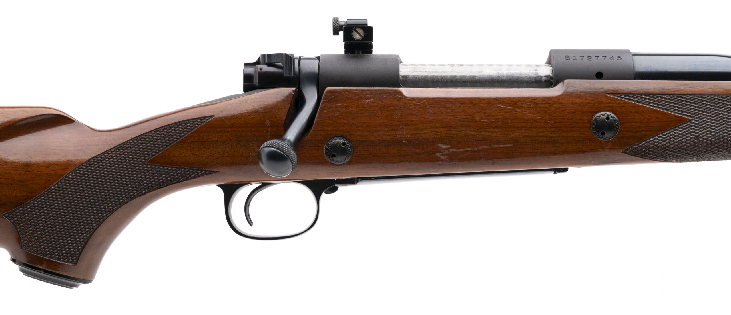 SN: G1727745 made in 1984. Big bore bolt action hunting rifle chambered in 458 Win Mag with a 22" round barrel with ramped front sight, rear peep sight, filler screws in the receiver for a scope, jeweled bolt and barrel mounted sling stud. Checkered walnut stock with 2 recoil cross bolts, capped pistol grip, inlaid rear sling stud and original red rubber Winchester recoil pad. Some handling marks and light wear on the stock, metal finish is very good and bore is excellent.