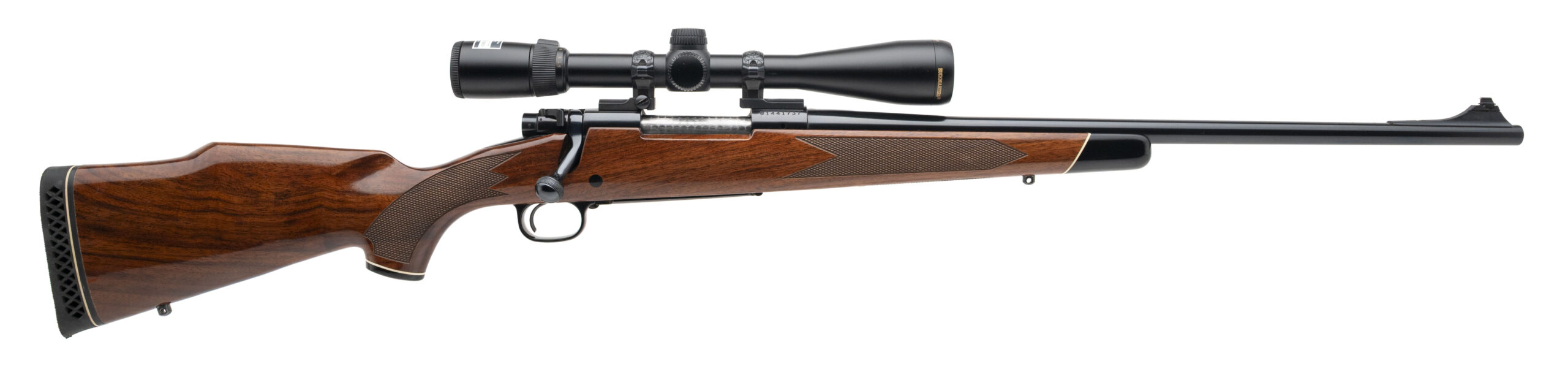 SN: G1441737 made in 1979. Bolt action hunting rifle chambered in 30-06 with a 22" round barrel, ramped front sight, rear sight has been removed to mount the Nikkon Buckmaster 4.5-14 scope with engraved scope rings. Jeweled bolt and high polish blued finish with a high gloss checkered walnut stock and a Pachmayr White Line recoil pad. Some light handling marks but overall in very good condition for the age with an excellent bore.