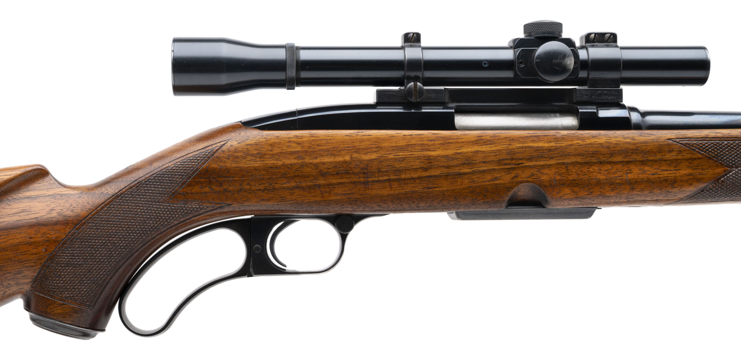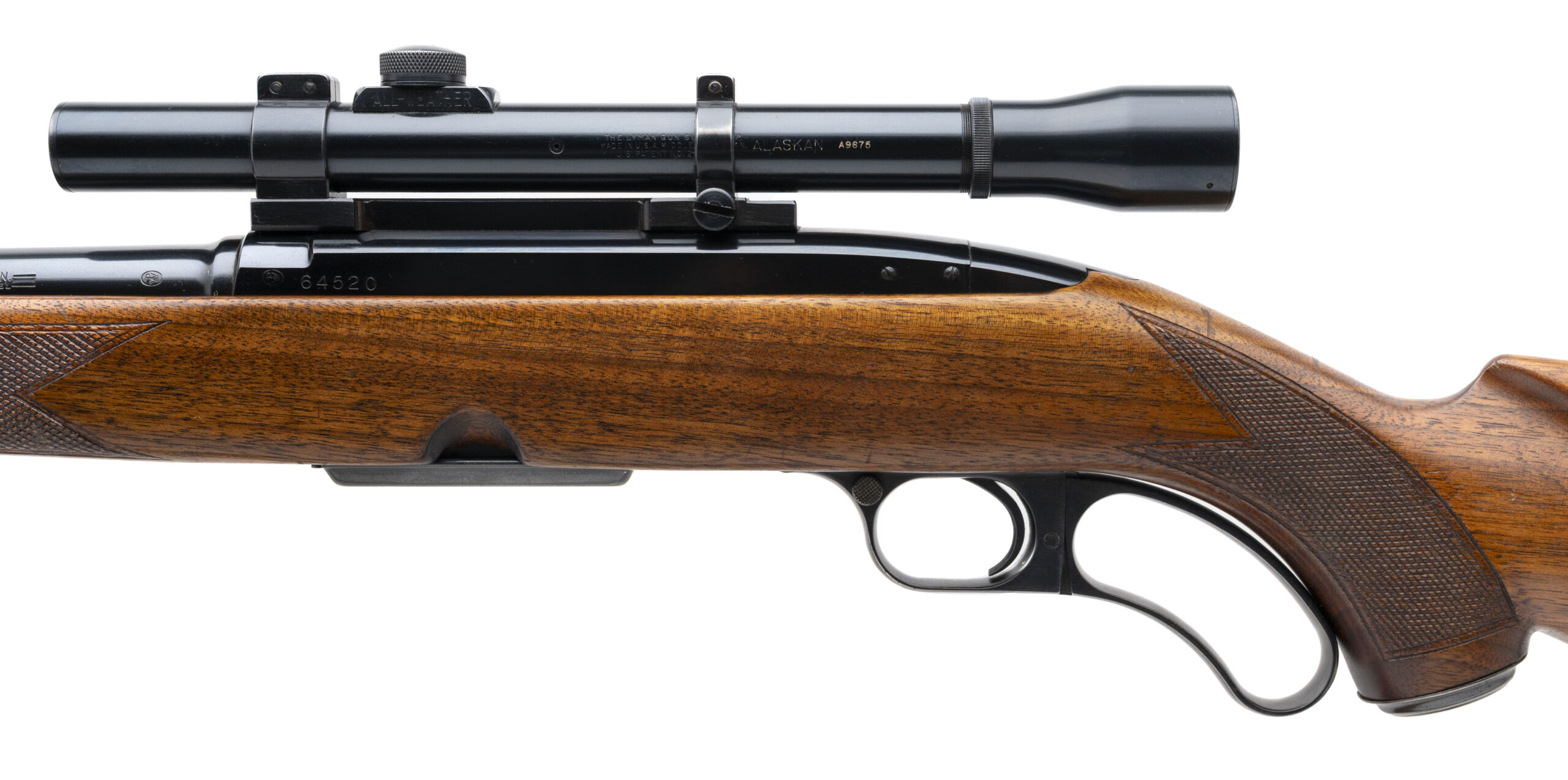 SN: 64520 made in 1958. Lever action hunting rifle chambered in 308 with a 22" round barrel, ramped front sight, flip up rear sight, detachable magazine and a Lyman Alaskan post reticle scope on a Redfield mount. Checkered walnut stock with pistol grip cap and Pachmayr White Line recoil pad. Finish has some light handling marks, overall in very good condition for the age. Bore is good with strong rifling. Comes with leather sling.