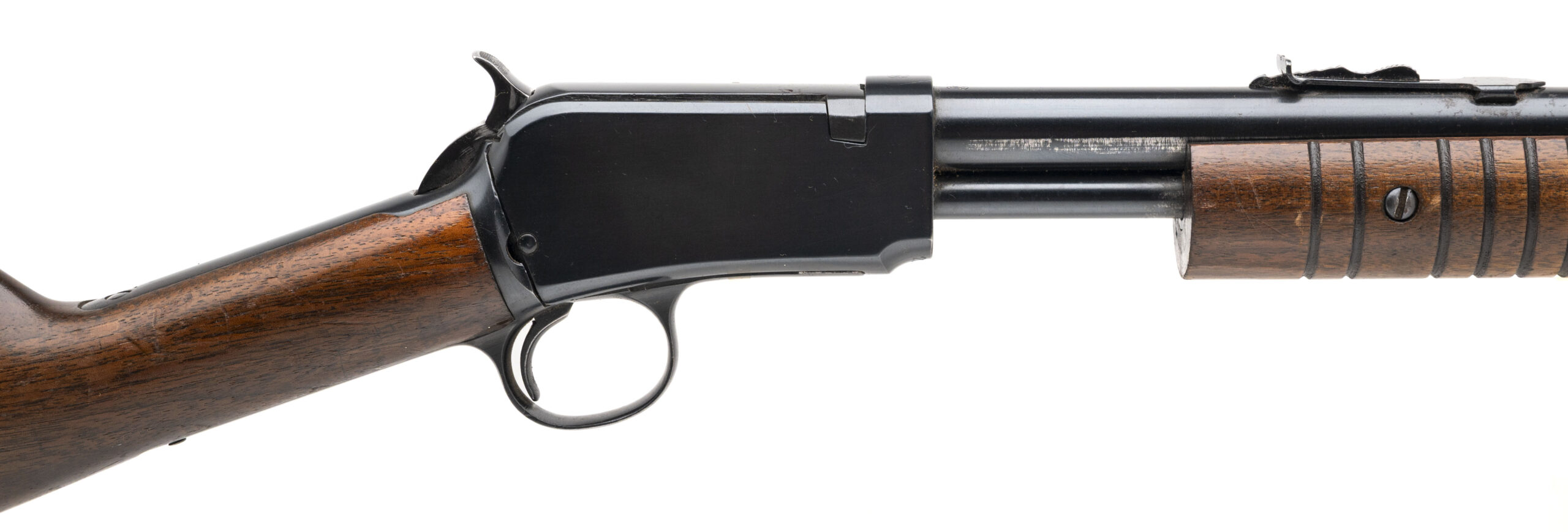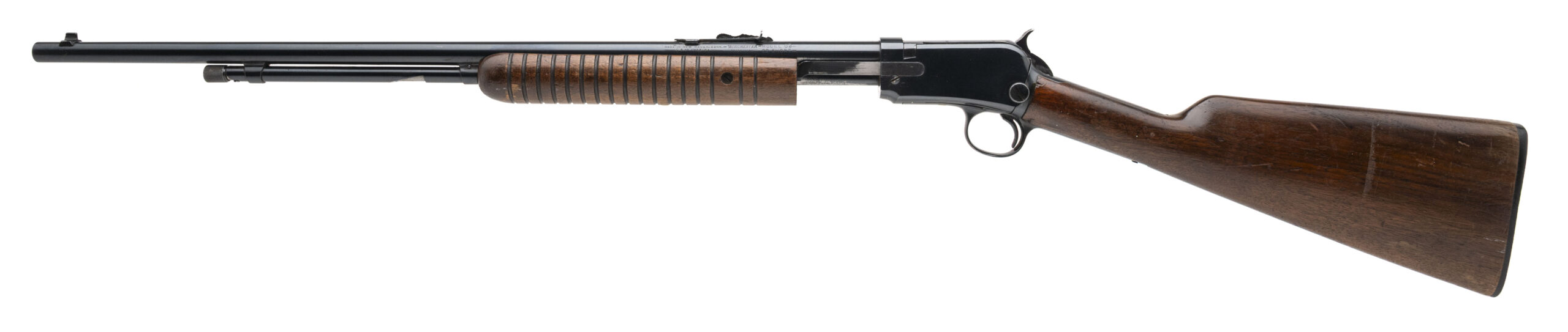 SN: 205075 made in 1947. Pump action takedown rifle chambered in 22 SHORT with a 23" round barrel with dovetailed front and rear sights. Tube fed with the Gallery cut in the magazine tube and walnut furniture with original butt plate. This gun is NOT numbers matching, the stock portion with the bottom tang has a different number than the barreled action and the original model "90" has been stamped over to a "62". Some wear and handling marks, action appears to be an old re-blue, bore has some light frosting but strong rifling, overall in good solid condition.