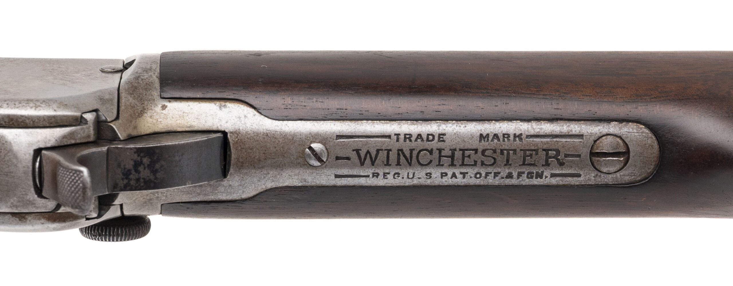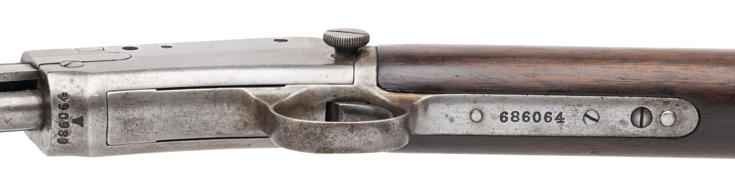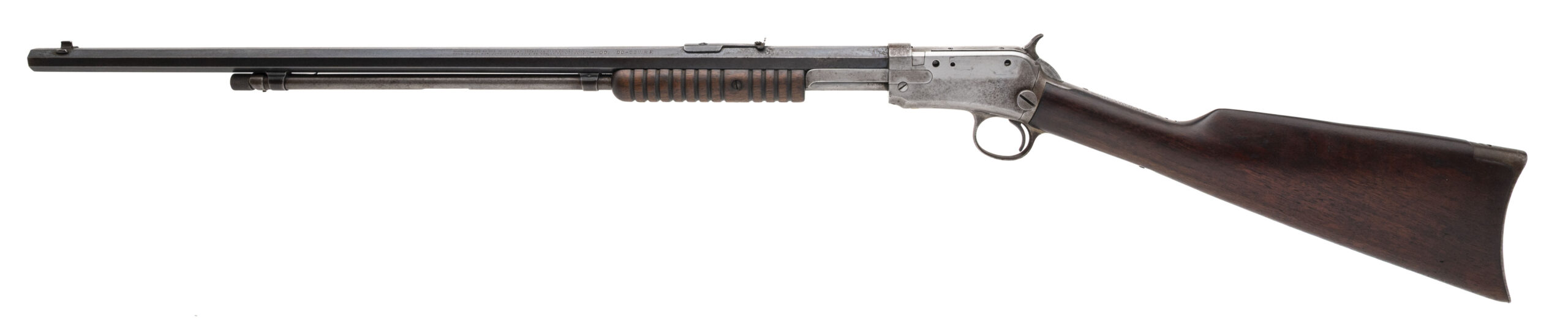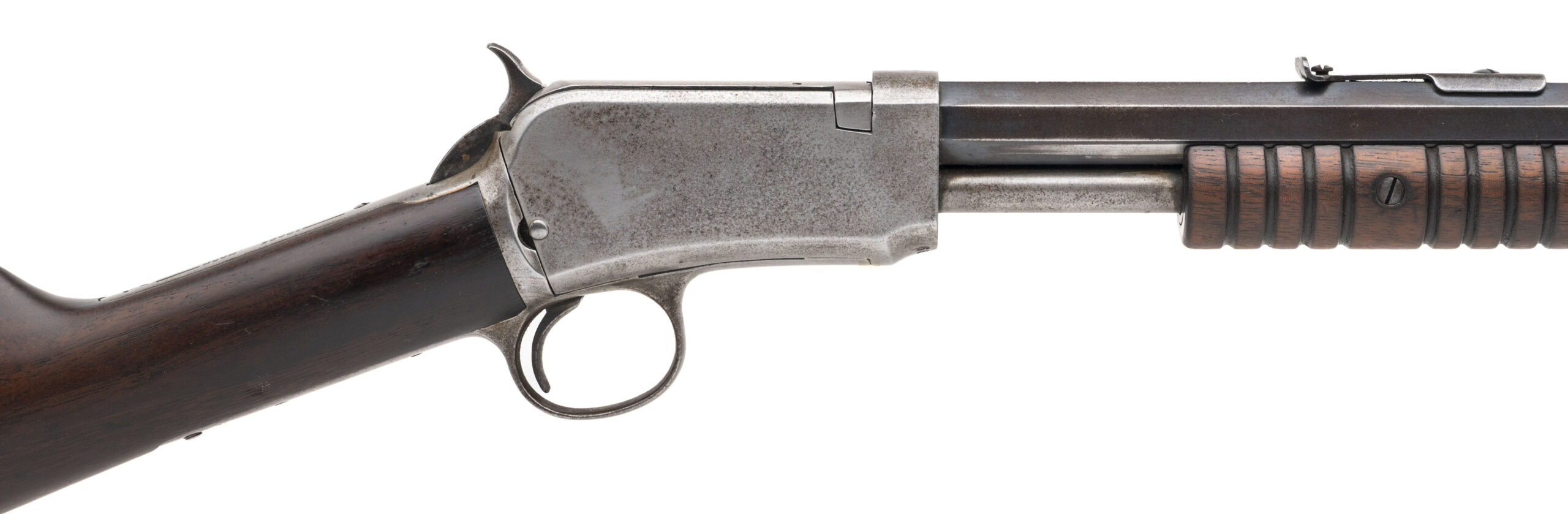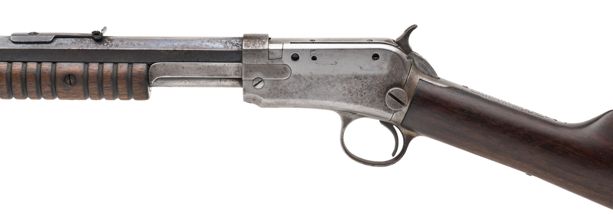 SN: 686064A made in 1925. pump action takedown rifle chambered in 22 WRF with a 24" octagon barrel and dovetailed front and rear sights. Action has holes tapped for a scope mount on the left side. Original furniture with original curved metal butt plate. Some light handling marks on the furniture. Finish on the action and magazine tube has worn and mostly turned to patina on the barrel however the bore is good with strong rifling.