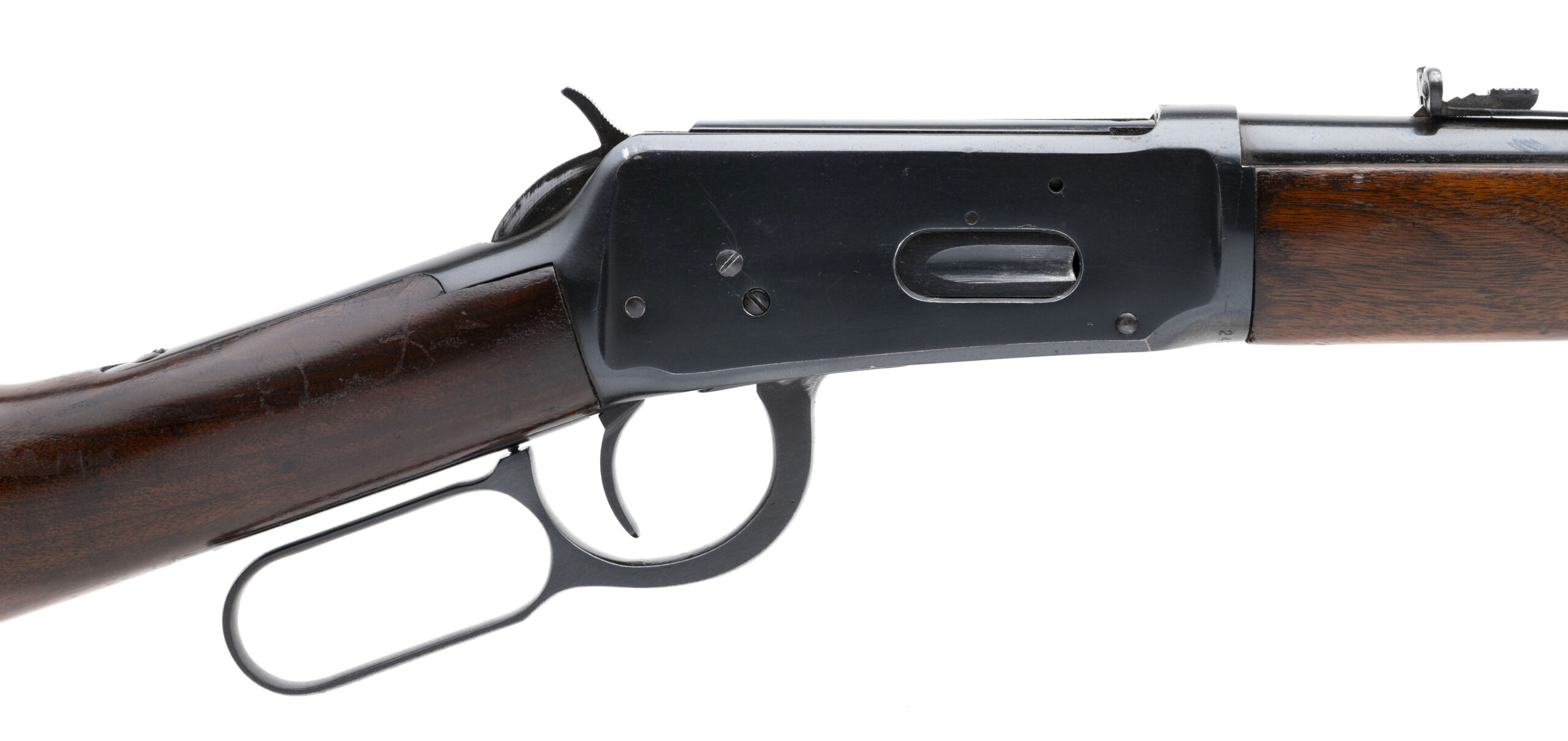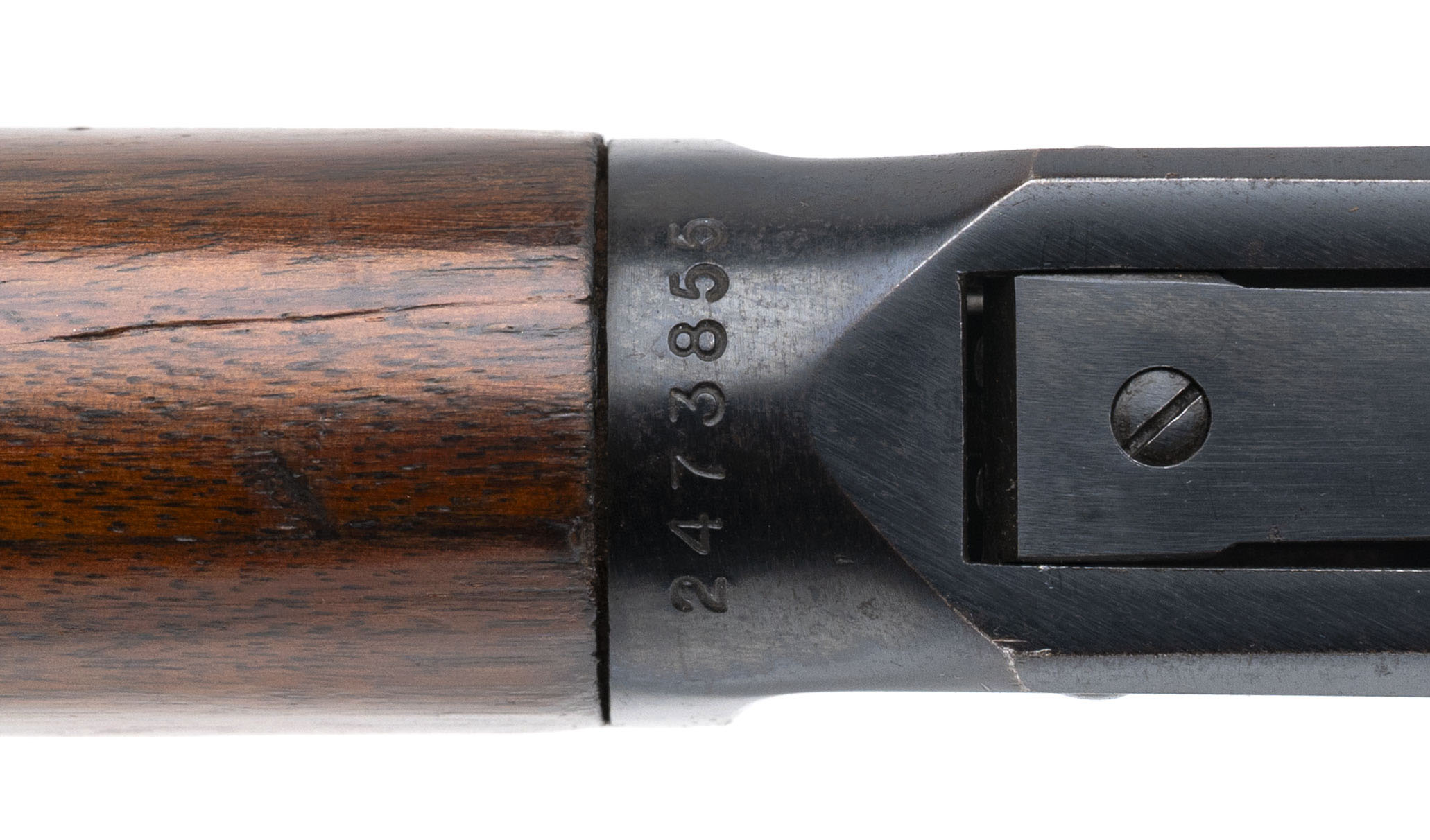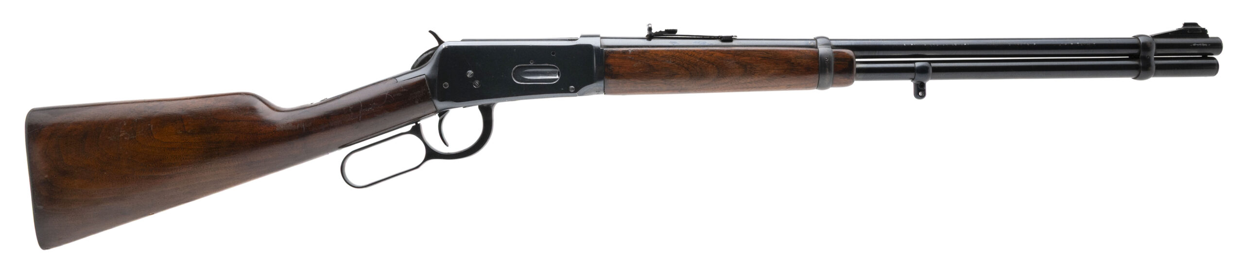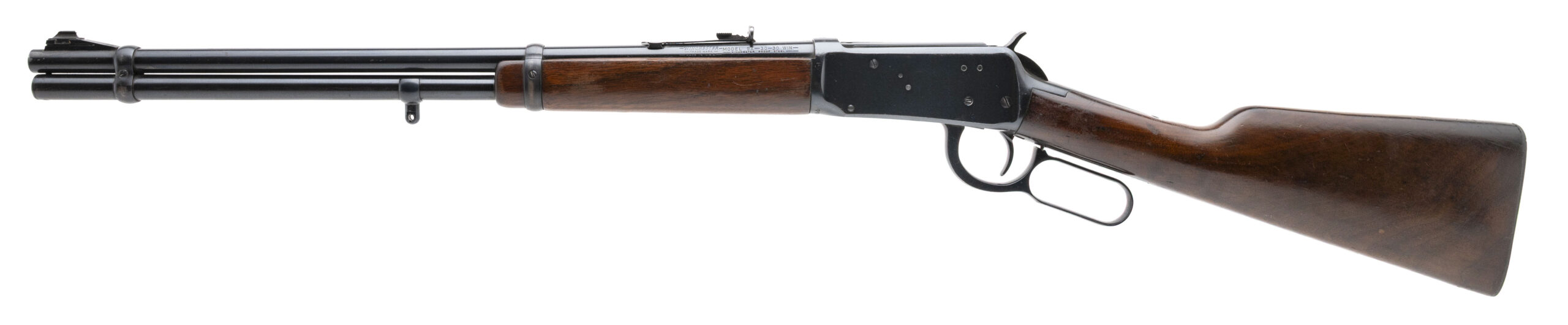 SN: 2473855 made in 1961. Pre-64 Lever action rifle chambered in .30-30 Win. with a 20" round barrel, ramped front sight, semi-buckhorn rear sight and magazine tube mounted sling swivel with walnut furniture and original steel butt plate. Moderate handling marks and some light wear but overall in very good condition, bore is good with strong rifling.