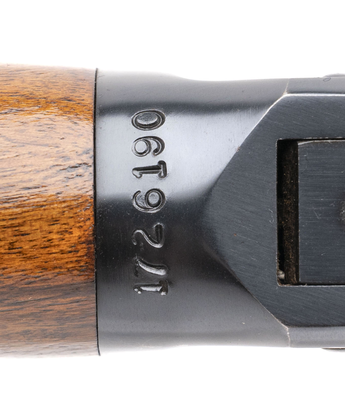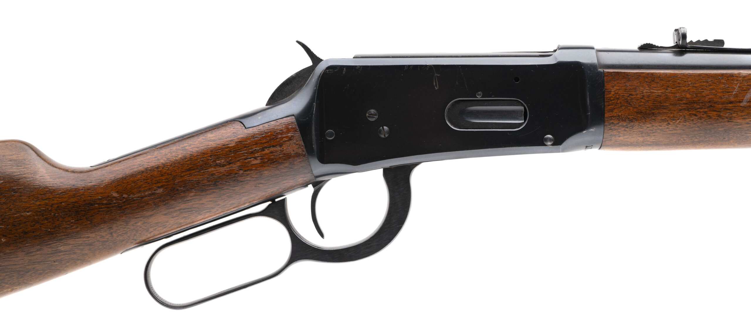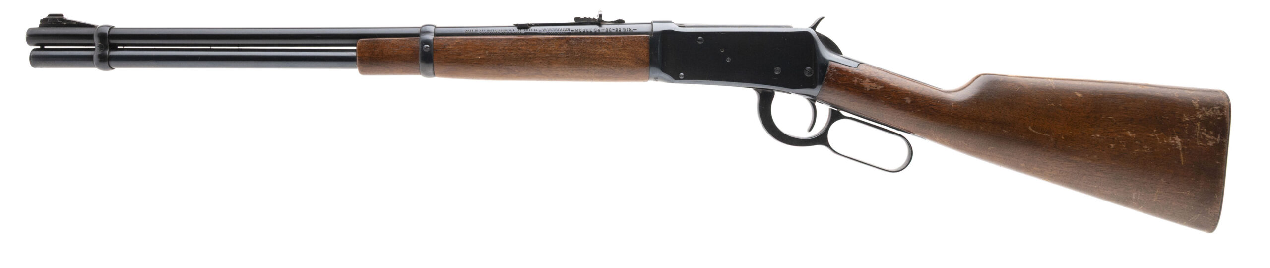 SN: 1726190 made in 1951. 30-30 lever action rifle with a 20" round barrel, ramped front sight, semi-buckhorn rear sight, blued metal finish, walnut furniture and original butt plate. Moderate wear to the furniture, bluing is good with some scuffs on the side of the receiver and bore is excellent.