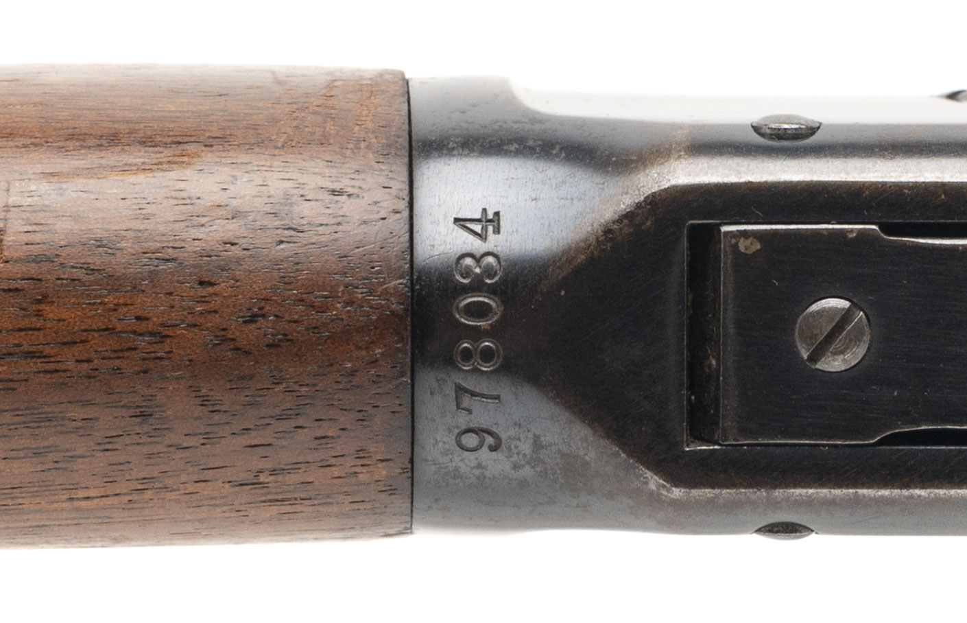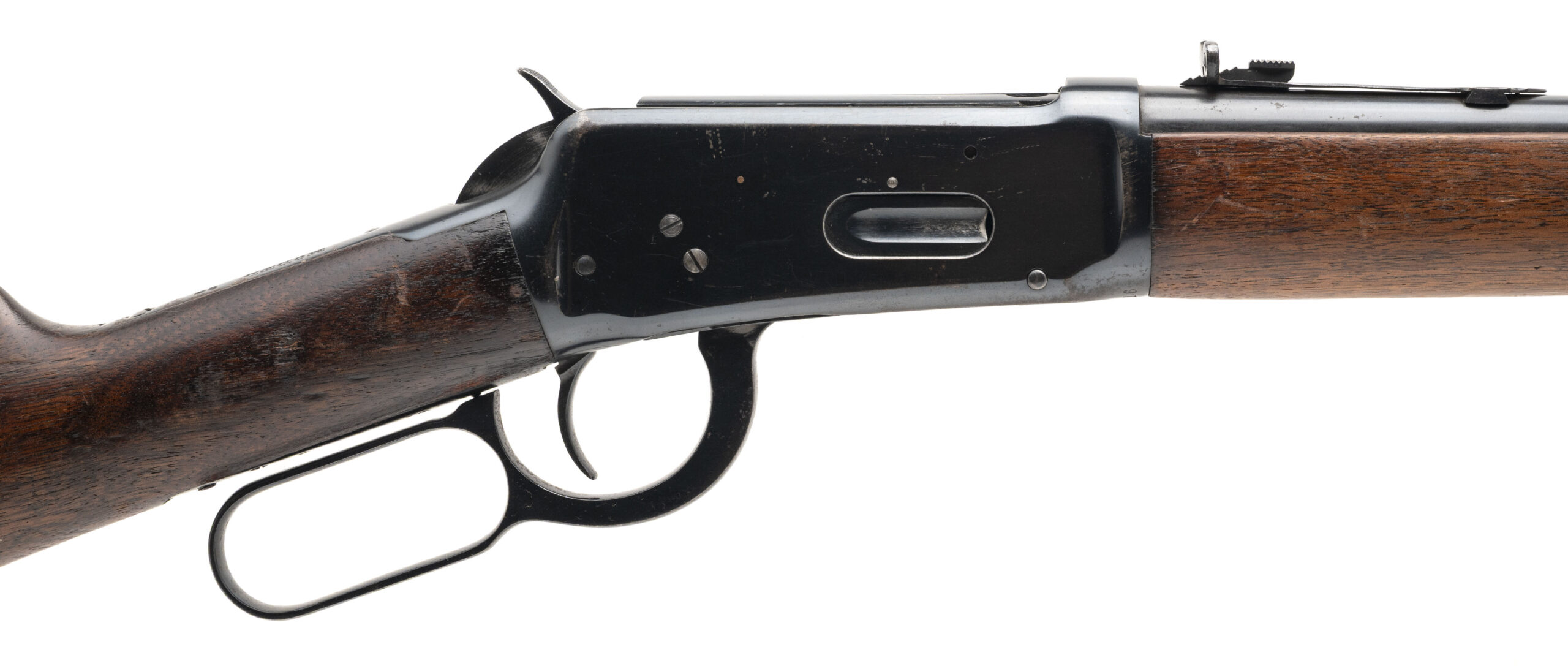 SN: 978034 made in 1925, lever action rifle chambered in 30 W.C.F. with a 20" round barrel, ramped front sight, semi-buckhorn rear sight, saddle ring, blued metal finish and walnut furniture with the original curved steel butt plate. Furniture shows moderate wear and handling marks but no cracks, bluing has normal wear from use and some speckling on the barrel and magazine tube, bore is excellent. Overall a good solid vintage shooter.