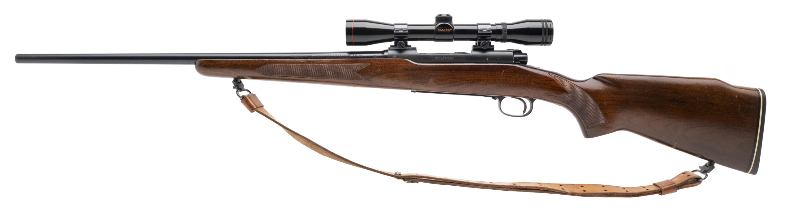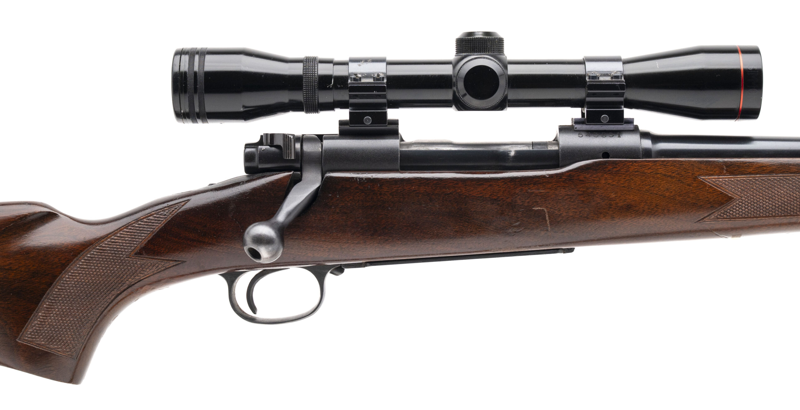 SN: 543851 made in 1961. Bolt action hunting rifle chambered in 243 win. With a 22” barrel, blued metal and checkered walnut stock with a white line recoil pad. Metal finish is very good, stock is in good condition with some handling marks and the bore is excellent. Comes with a Simons 4x32 scope and leather sling.