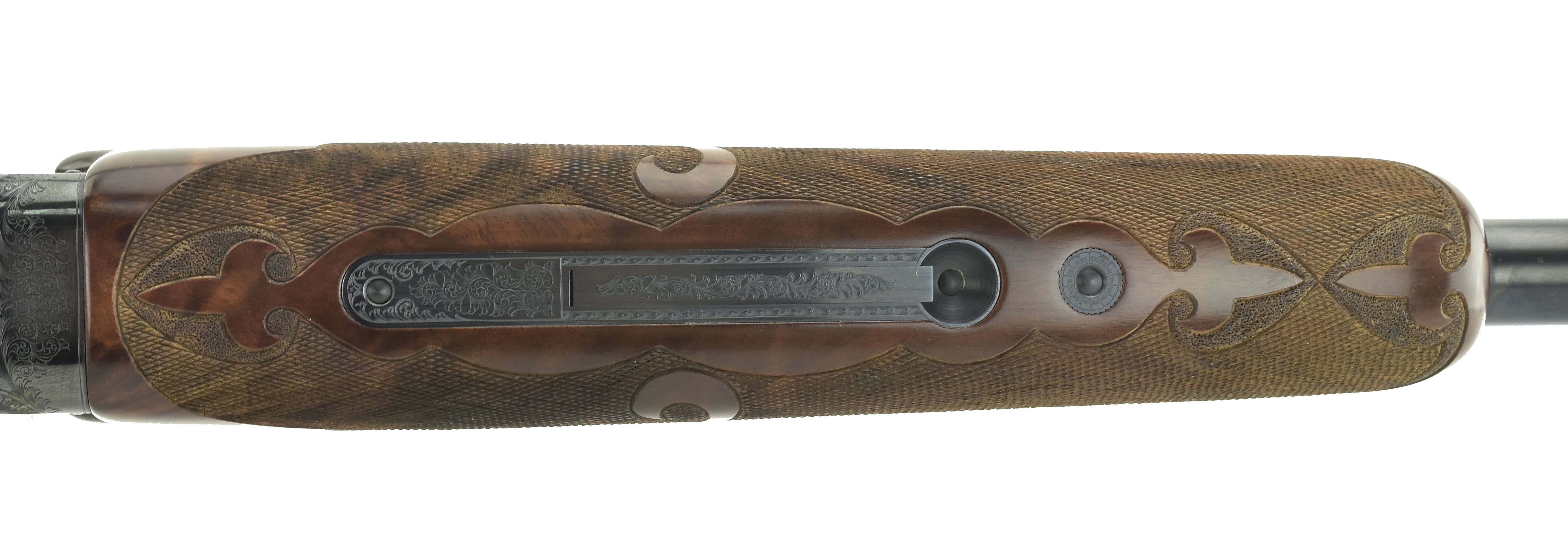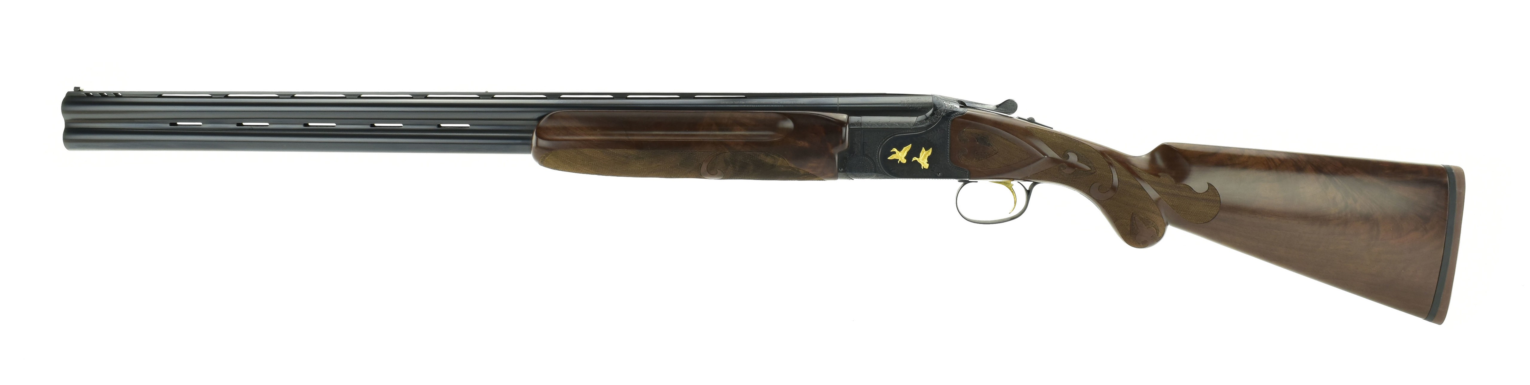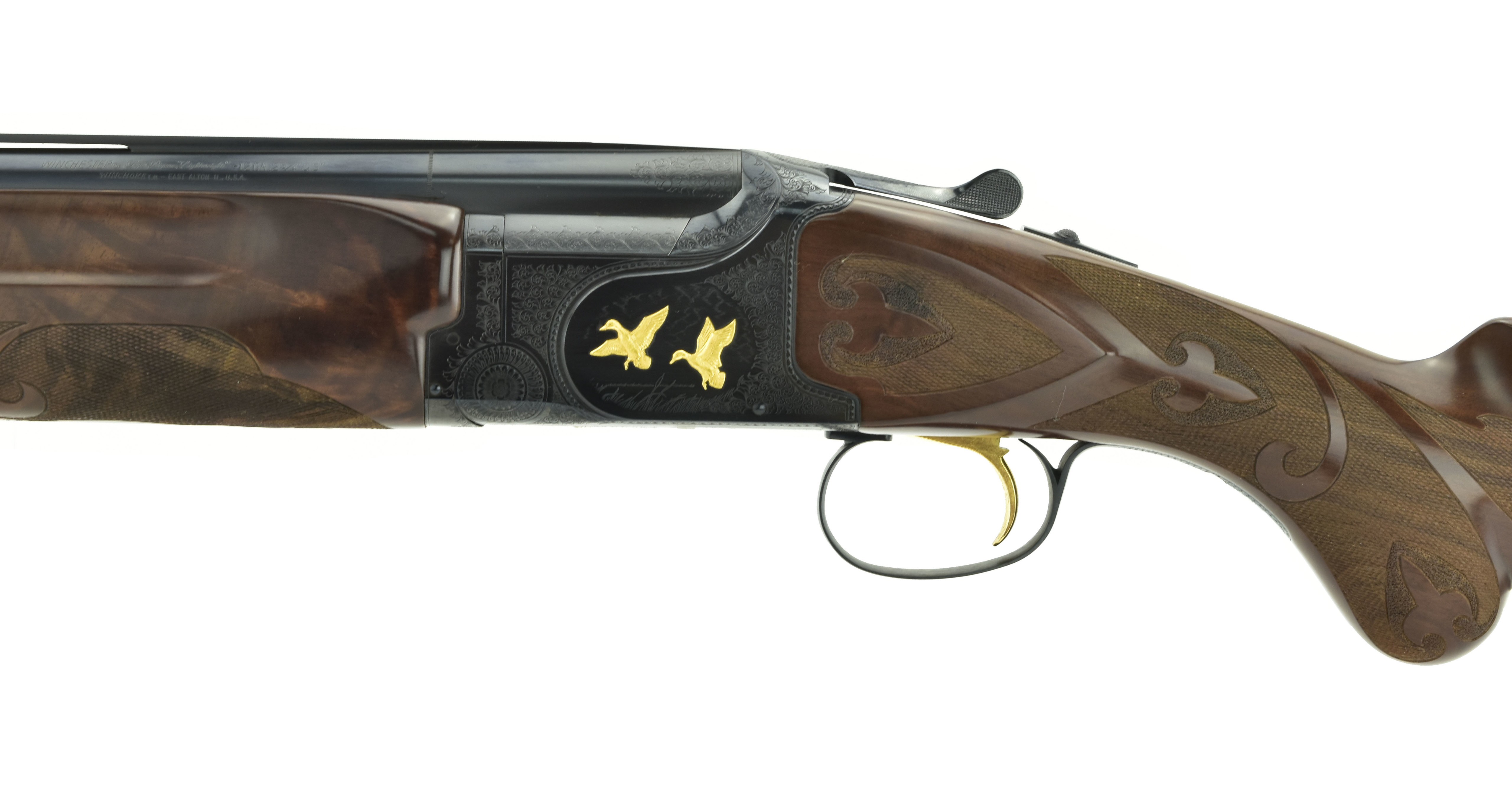 Winchester Super Pigeon Deluxe 12 Gauge shotgun. Super Pigeon Deluxe over/under with 27” barrels, gold inlays on receiver and Fleur-de-Lis checkering. Excellent condition with box.