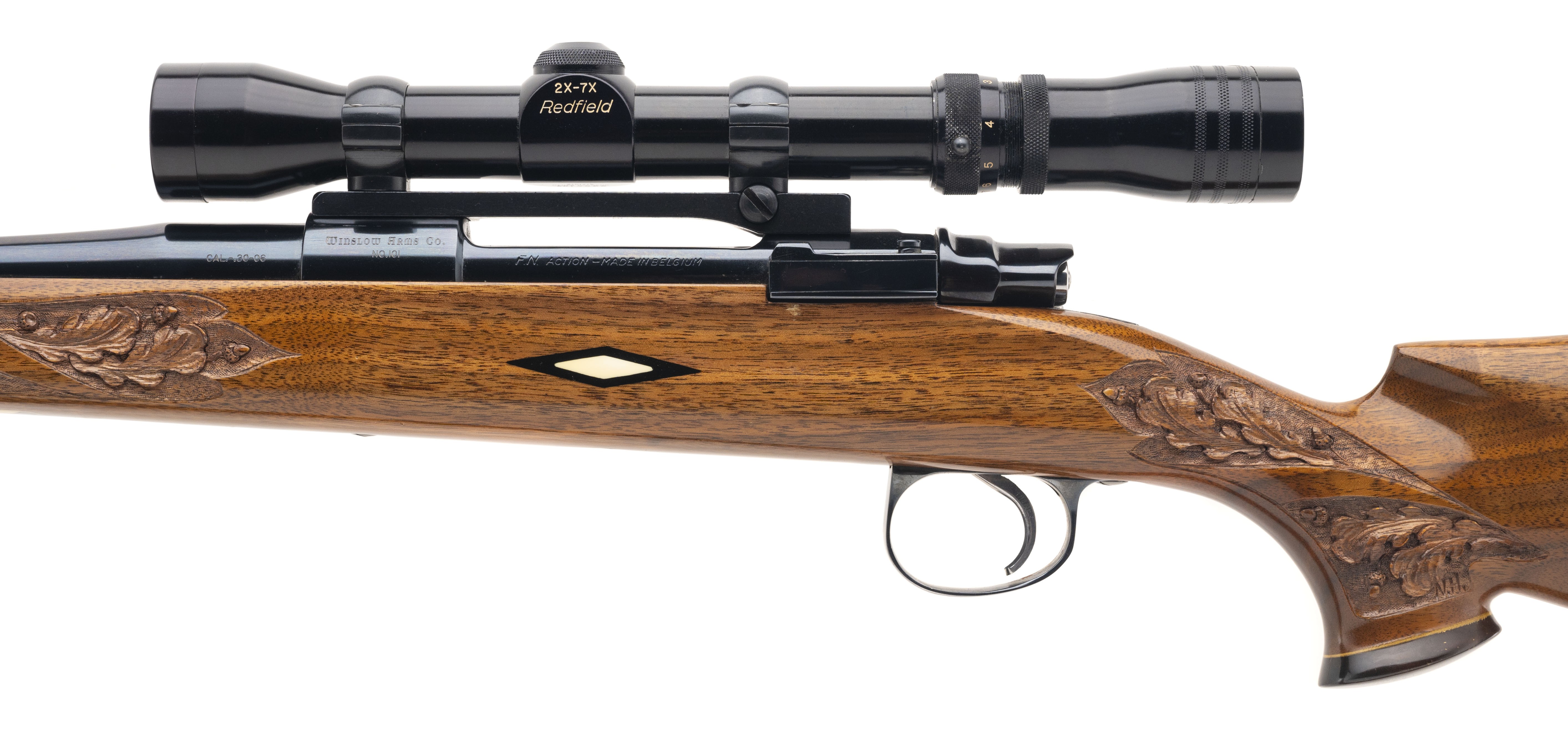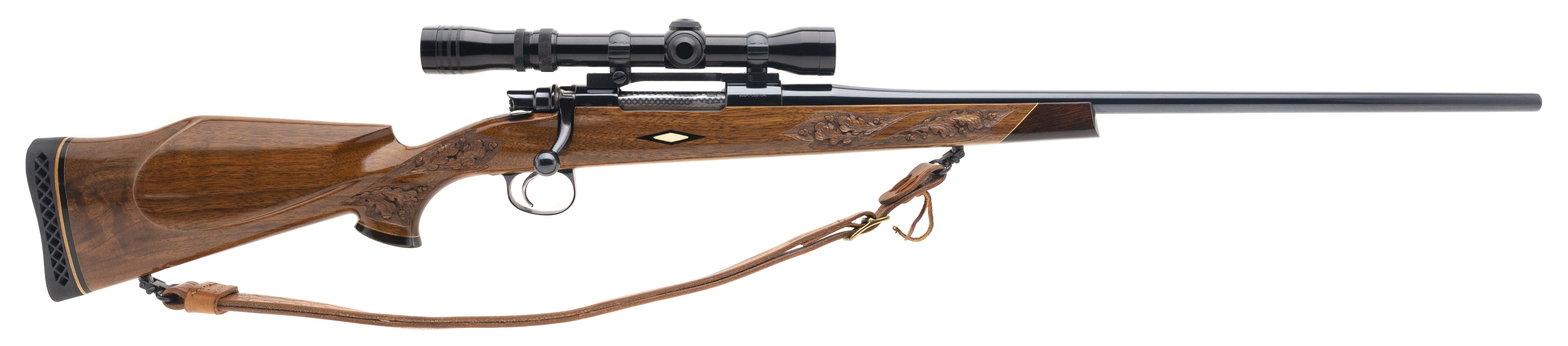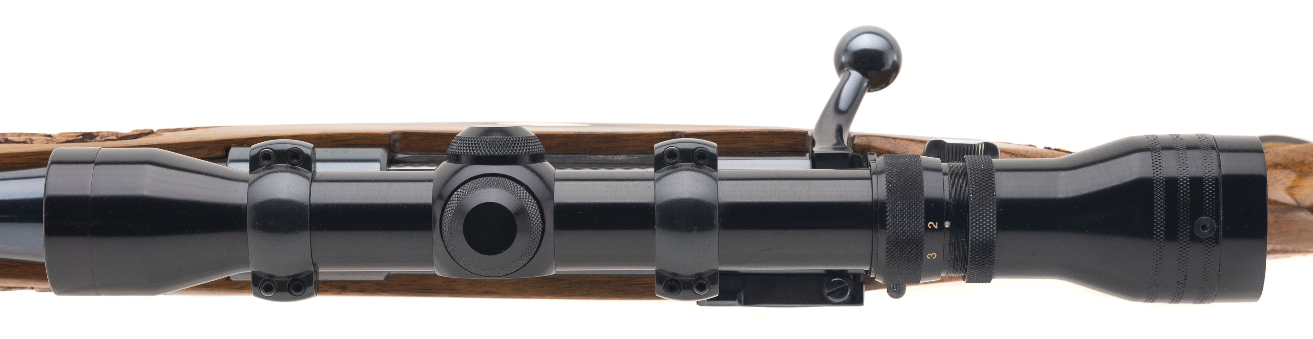 SN: 101. 1960's production .30-06 with a 24" barrel. Bore is excellent. Custom rifle built on a FN Mauser action. Has a high polish blue finish with jeweled bolt. The stock is carved and has fancy inlays, and has a left hand cheekpiece. Has a Redfield 2x7 scope. A classic vintage rig, in excellent condition. A perfect gun for a left handed shooter that works the bolt with his right hand.