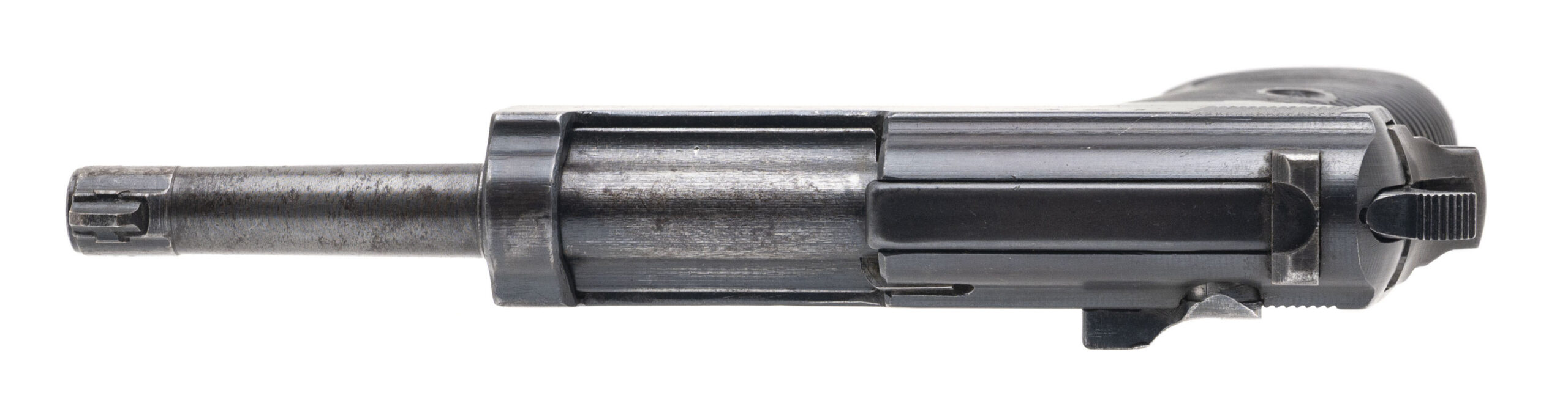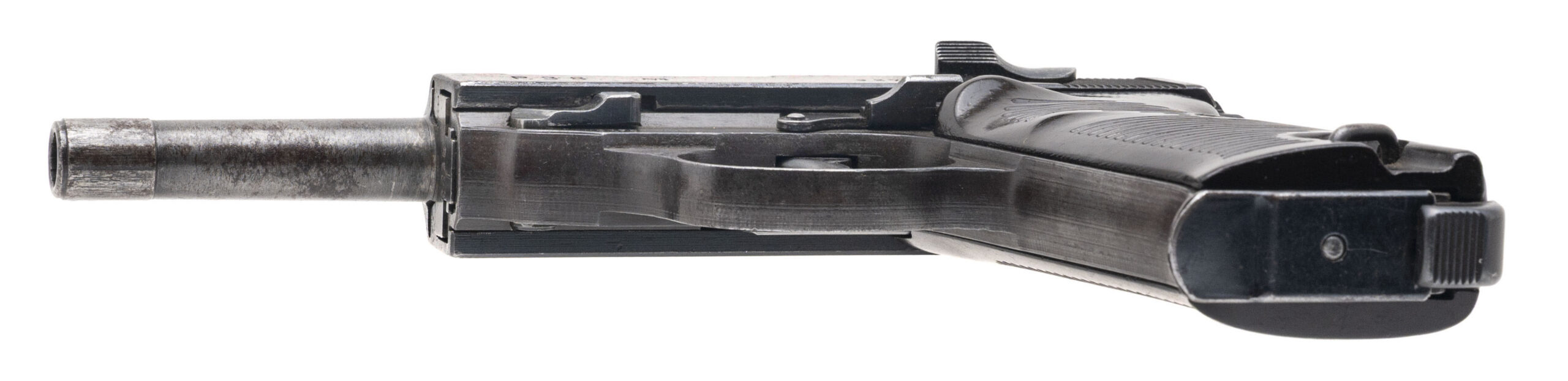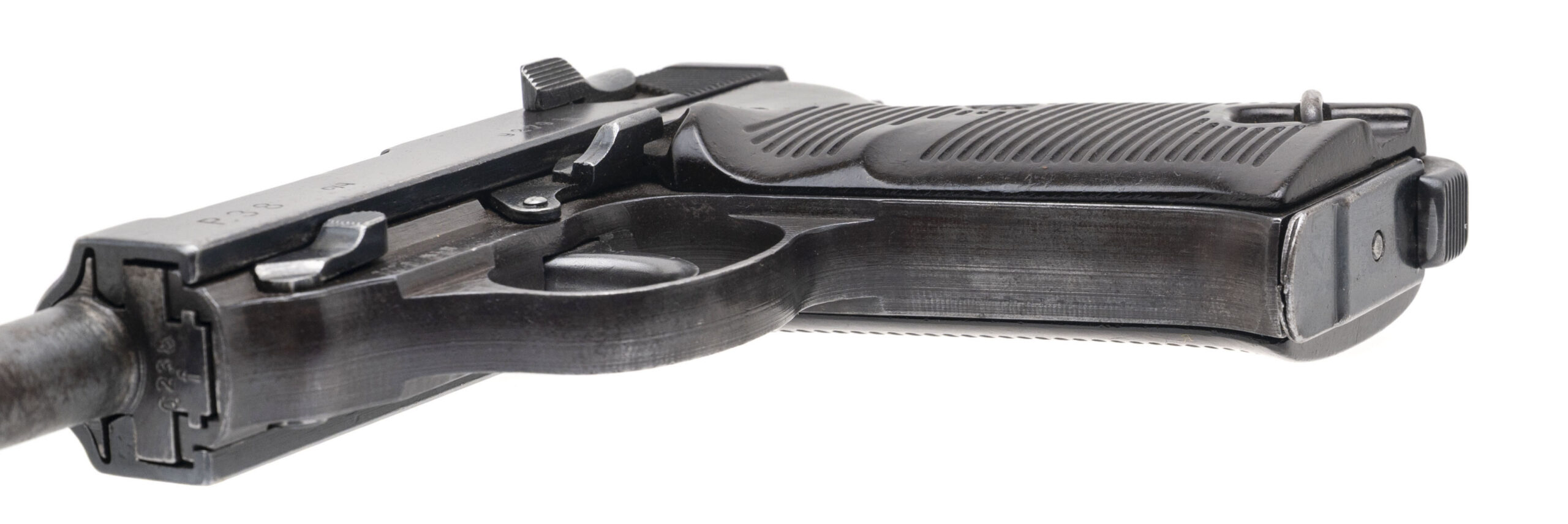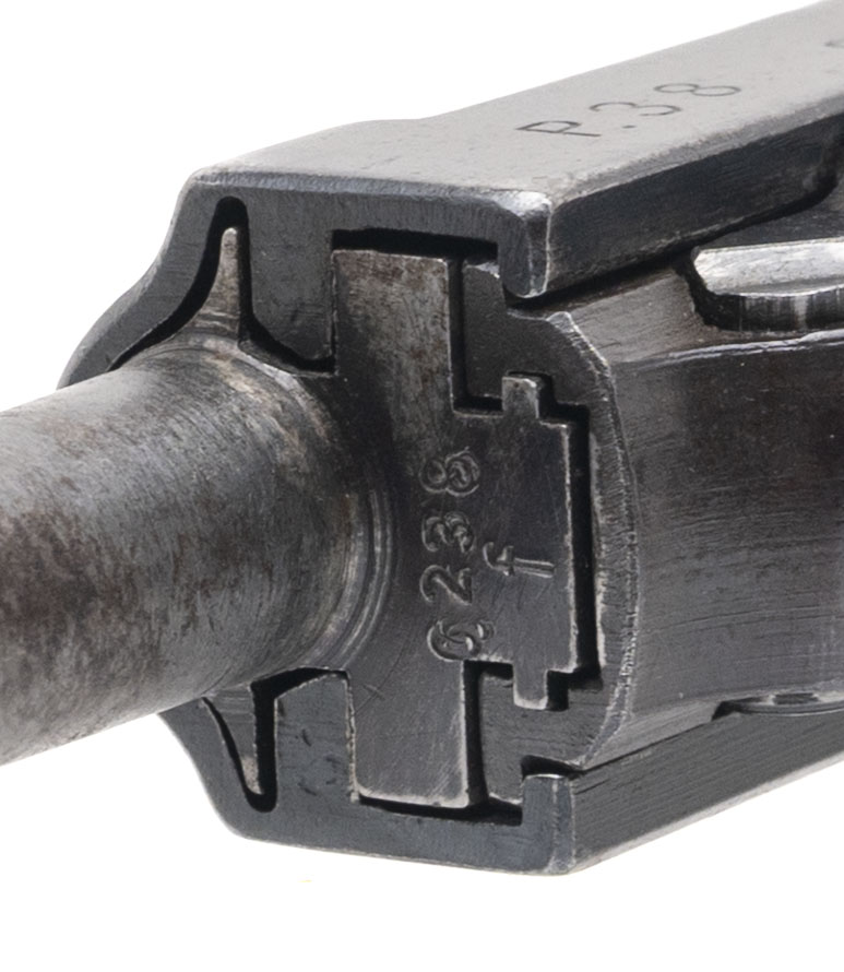 Serial number 9279h. Made by Metallwarenfabrik Spreewerk in the Czechoslovakian Sudetenland in October 1943 with a bright bore that has strong visible rifling. The August 1943 barrel is a mismatch to the slide & frame but there are E/88 Waffenamt acceptance stamps visible on the slide & frame. Condition overall is good with thinning & discolored finish on the barrel. Comes with an unmarked 8-round magazine & Bakelite grips.