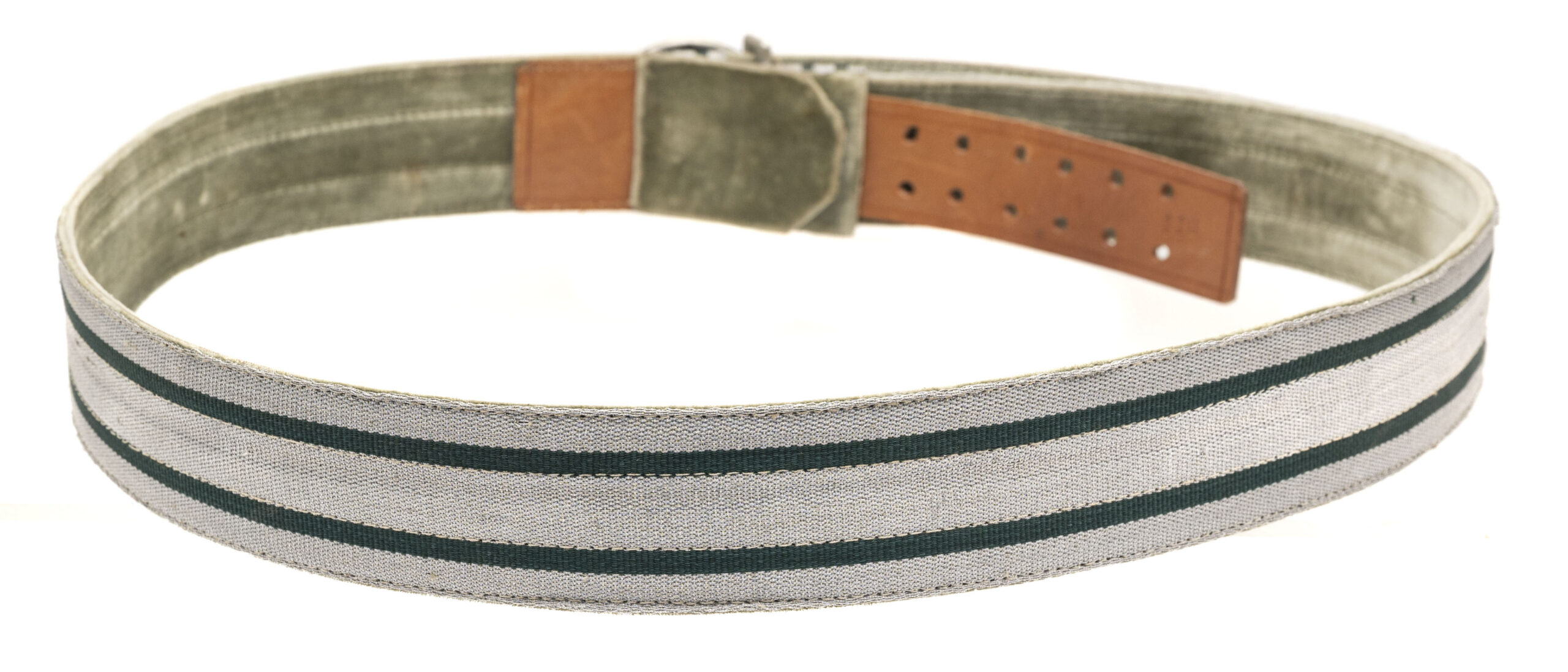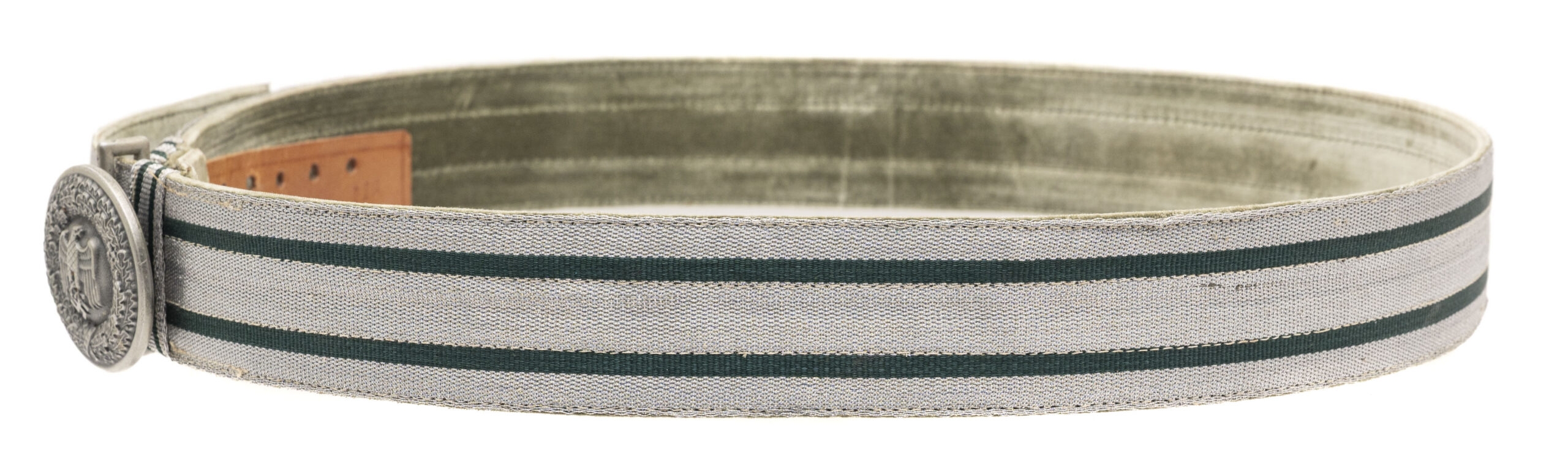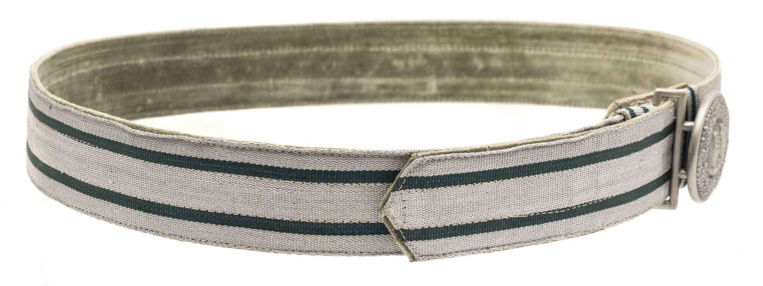 World War II German Heer (Army) officer's parade belt (Feldbinde) & buckle worn on dress uniforms by all officer’s below the rank of General. The belt is made of a silver aluminum wire brocade with two intertwined green stripes, backed by green felt & adjusted using a leather tongue. It is attached to a circular, die-stamped aluminum belt buckle (“Koppelschloss”) that depicts the Wehrmacht eagle clutching a canted swastika in its talons surrounded by an oak wreath.