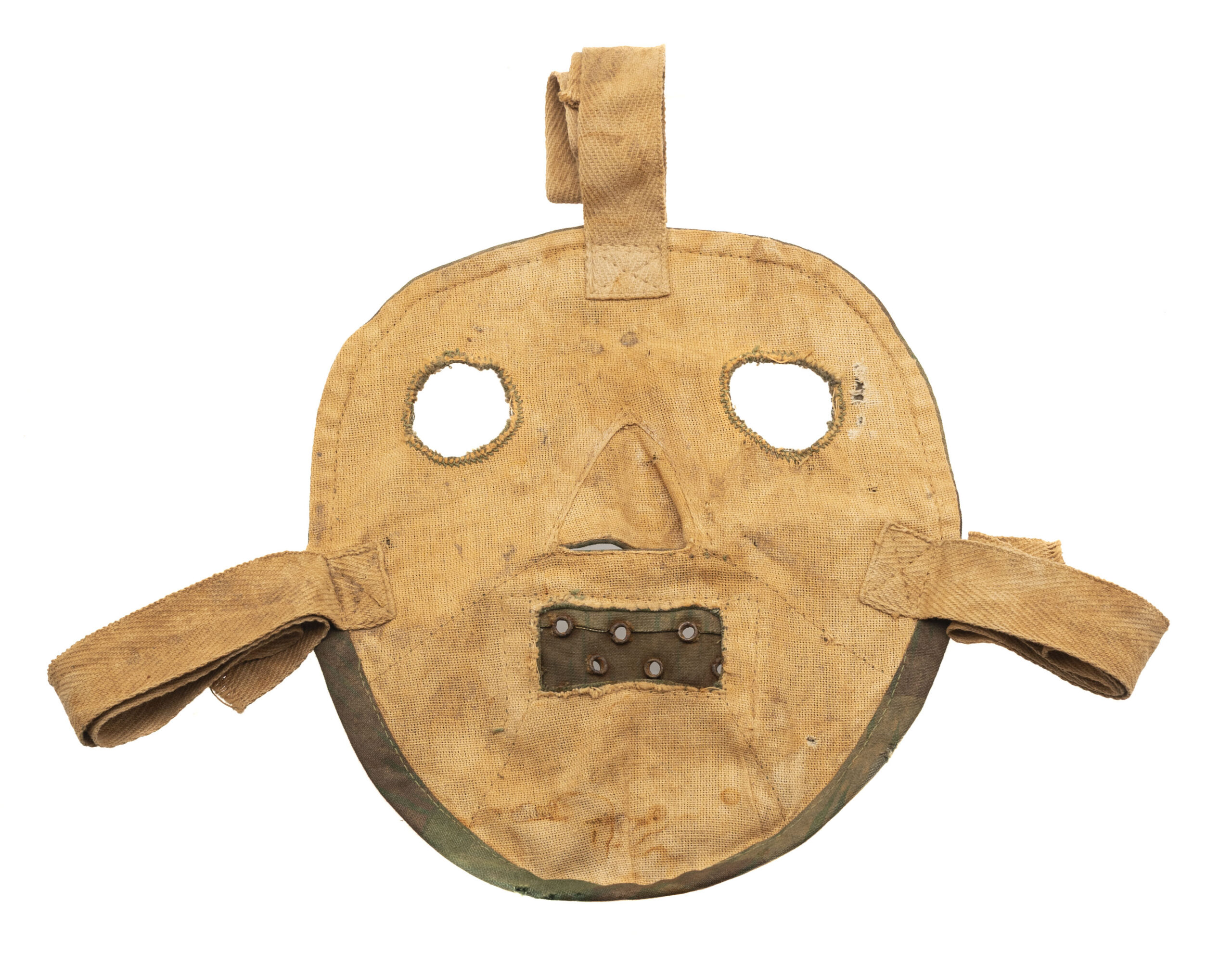 Original World War II German Army cold weather reversible "sniper" face mask in the "Splittermuster" ("splinter-pattern") camouflage pattern. Item was made from Zeltbahn material with three cotton twill face ties & 10 grommets over the mouth for breathing. These were actually more likely to be worn by machine gun crews than snipers & are infamously associated with the Dirlewanger "Black Hunters" anti-partisan brigade that operated in Belarus & Poland.