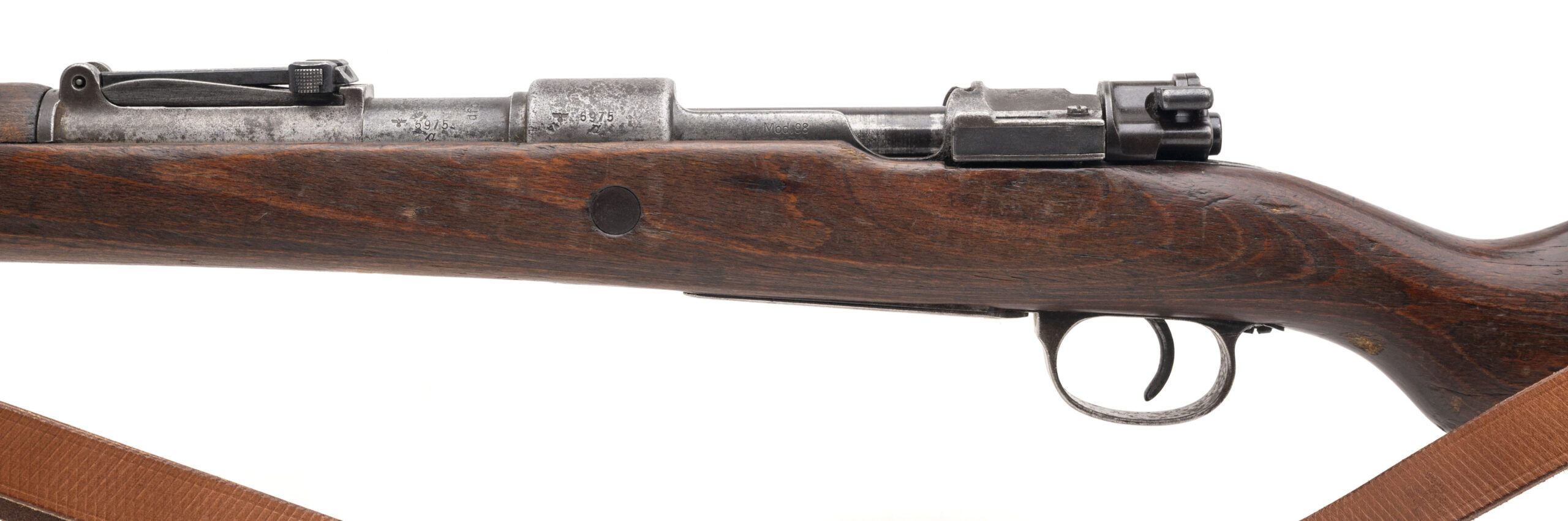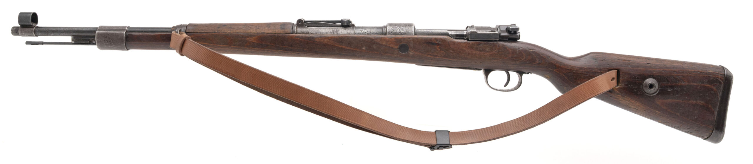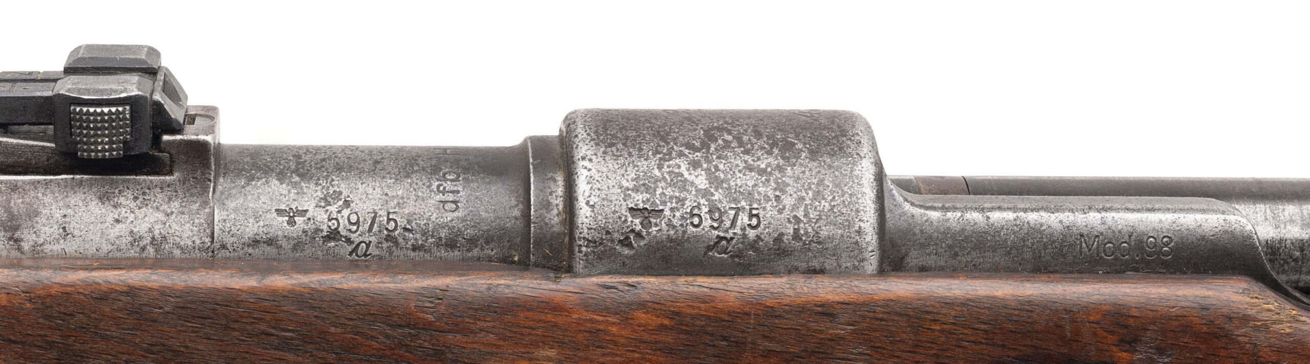 SN: 6975a. Manufactured in 1945, 7.92×57mm/8mm Mauser with a 23.62" barrel. Late war WWII German Kar98k Mauser rifle. Serial numbers matching on receiver and barrel, correct stock to the firearm. Shows wear because of the age. Overall condition is good for the age. Comes with a reproduction leather sling, cleaning rod & front sight hood. (DALLAS LOCATION)