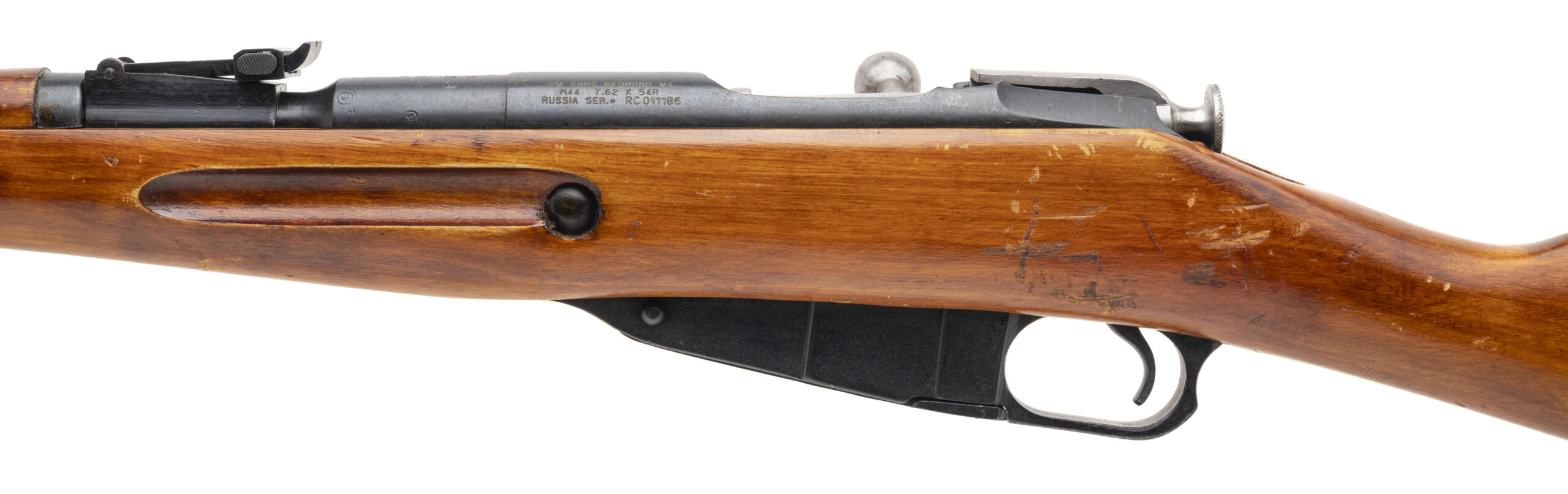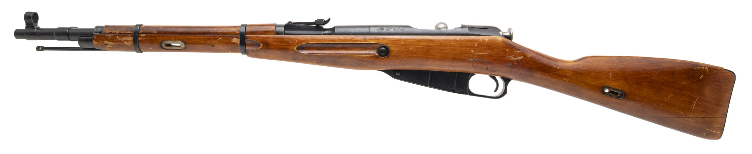 Serial number RC01186. Made at the Izhevsk Mechanical Plant in 1944 with a 20.4-inch barrel that has a bright bore with strong visible rifling. Overall condition is very good with original factory blued finish across the metallic parts & arctic birchwood furniture that shows some dings & scratches. The buttstock & handguard are matching in color & condition. Comes with a 17.5-inch cleaning rod & a 12-inch folding cruciform bayonet.